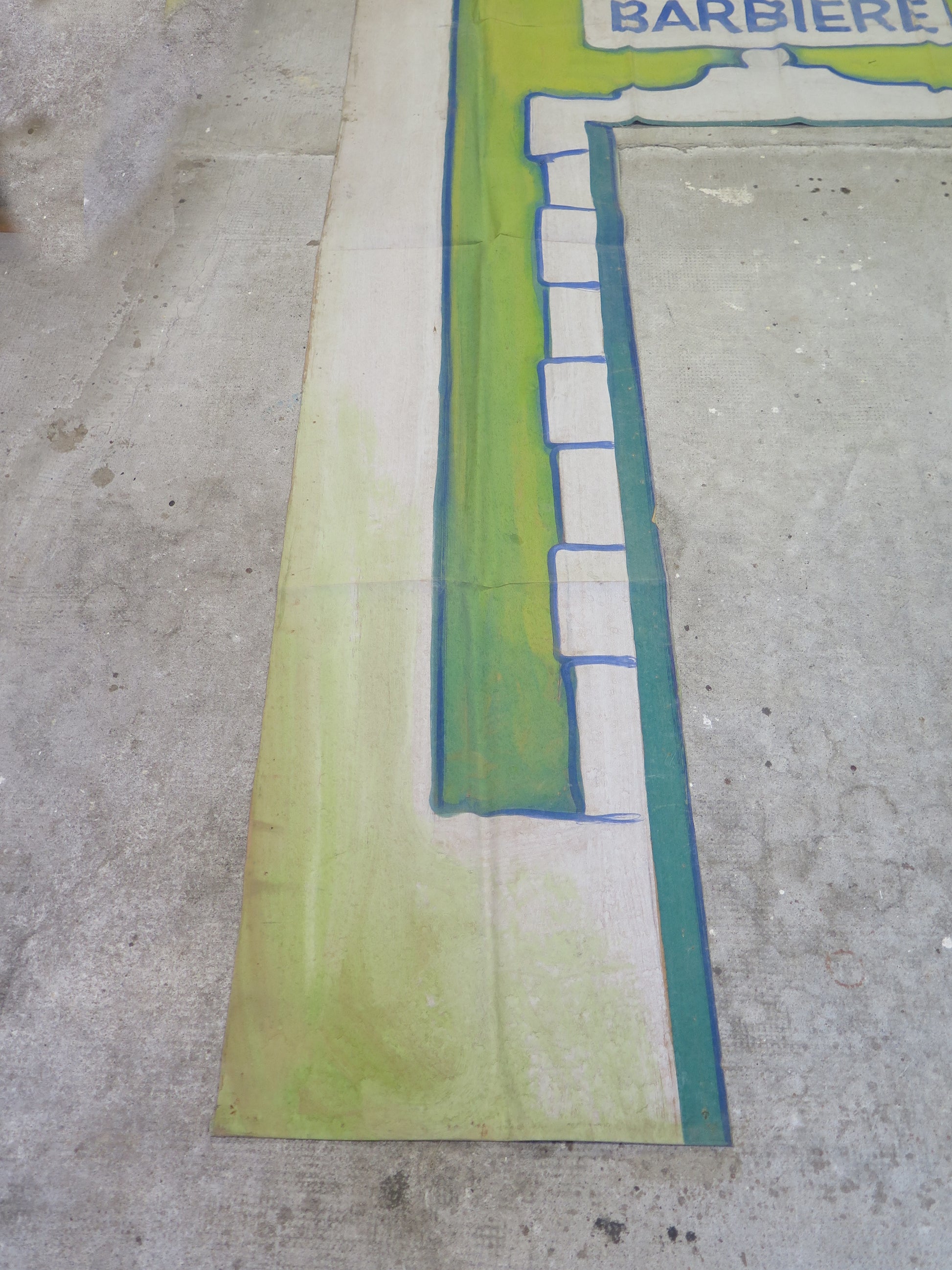 Theater backdrop made of hand painted paper depicting the entrance portal of a barber shop.