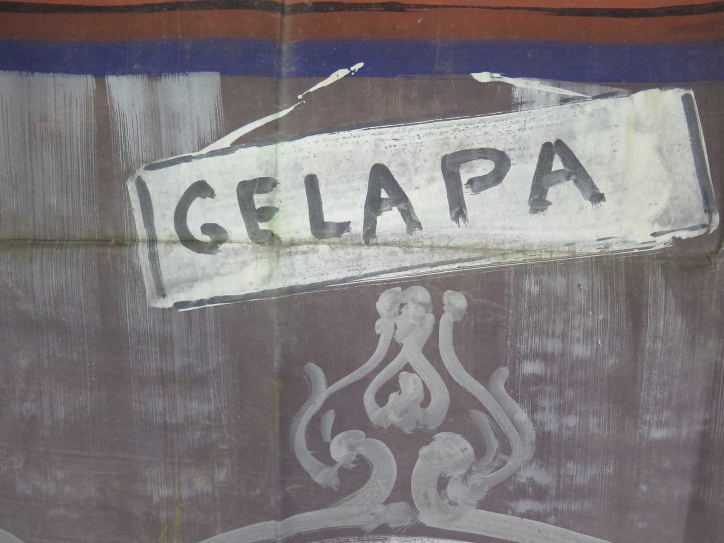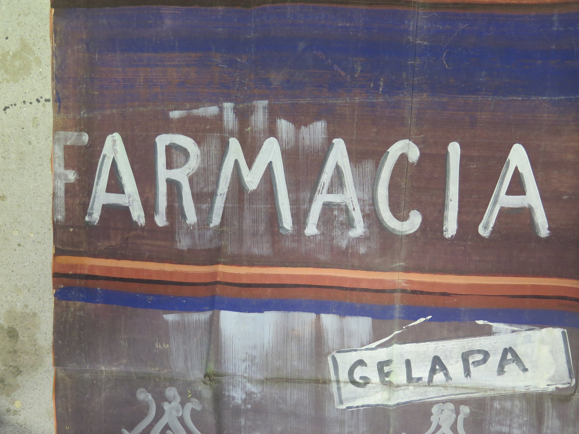 Hand-painted paper theater backdrop depicting the door of a pharmacy.