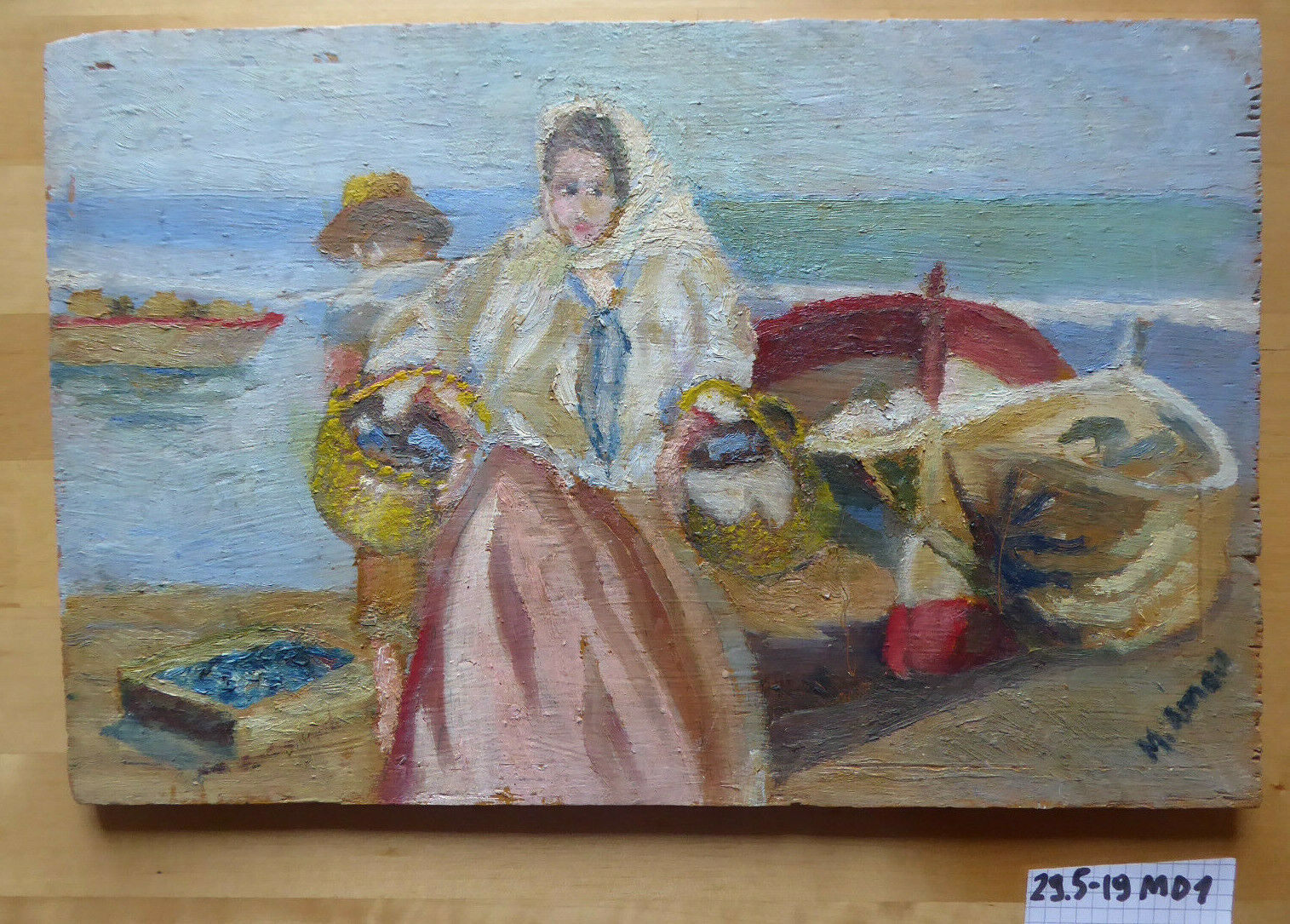OLD SMALL OIL PAINTING SIGNED WOMAN AT THE FISH MARKET MD1