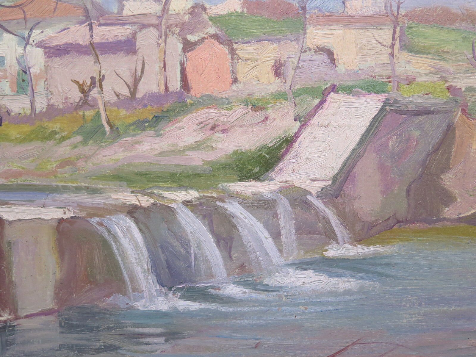 The painting in question is an impressionist landscape of the Emilian countryside with waterfalls in the background.