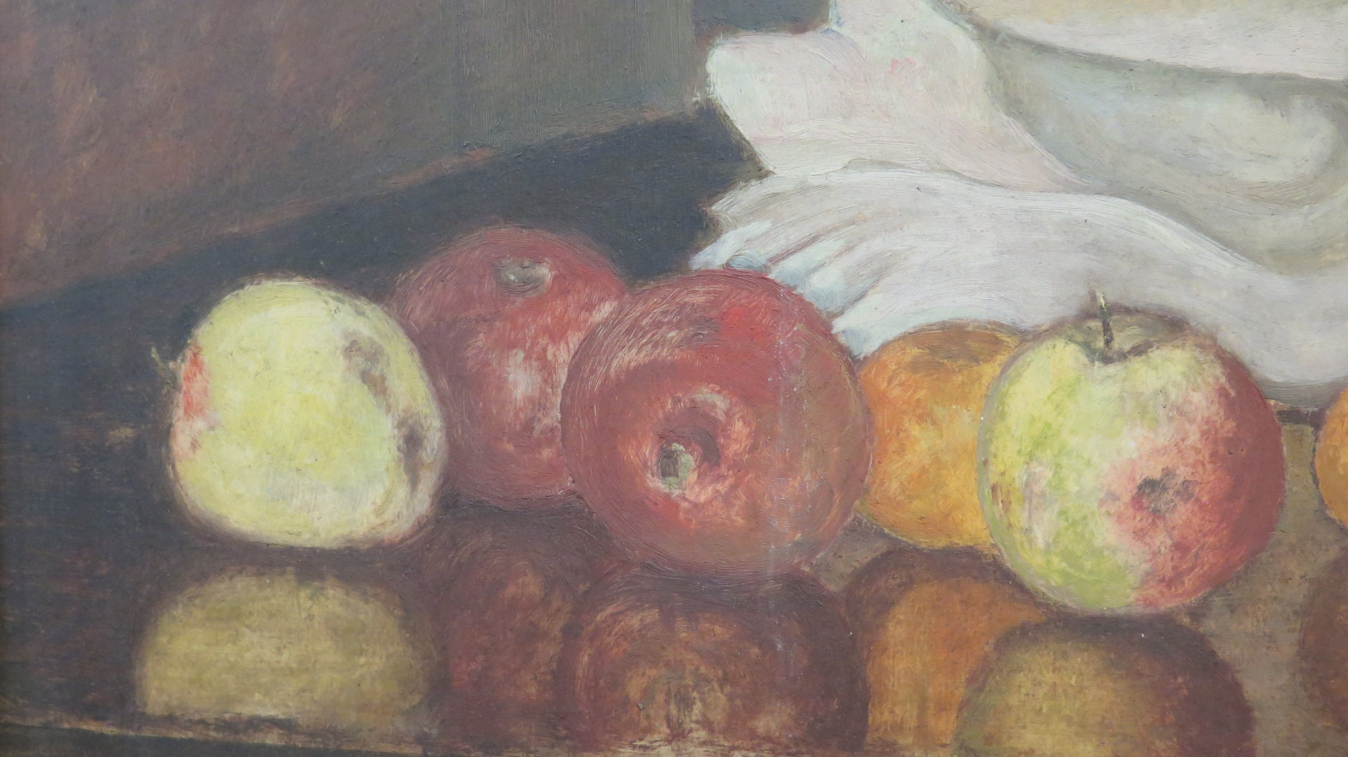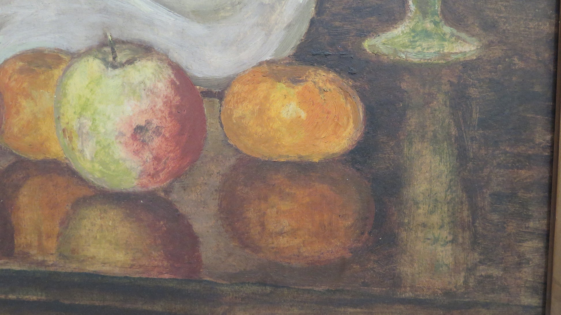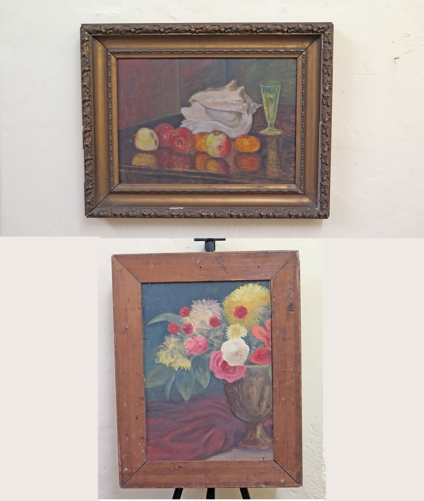 Antique painting painted on both the front and back with still life (fruits on the table) on one side and flowers on the back in a vertical direction. Signed on the frame by the Piedmontese painter Delfino Gagnor (1896-1970), an artist whose other paintings you can find on our site.