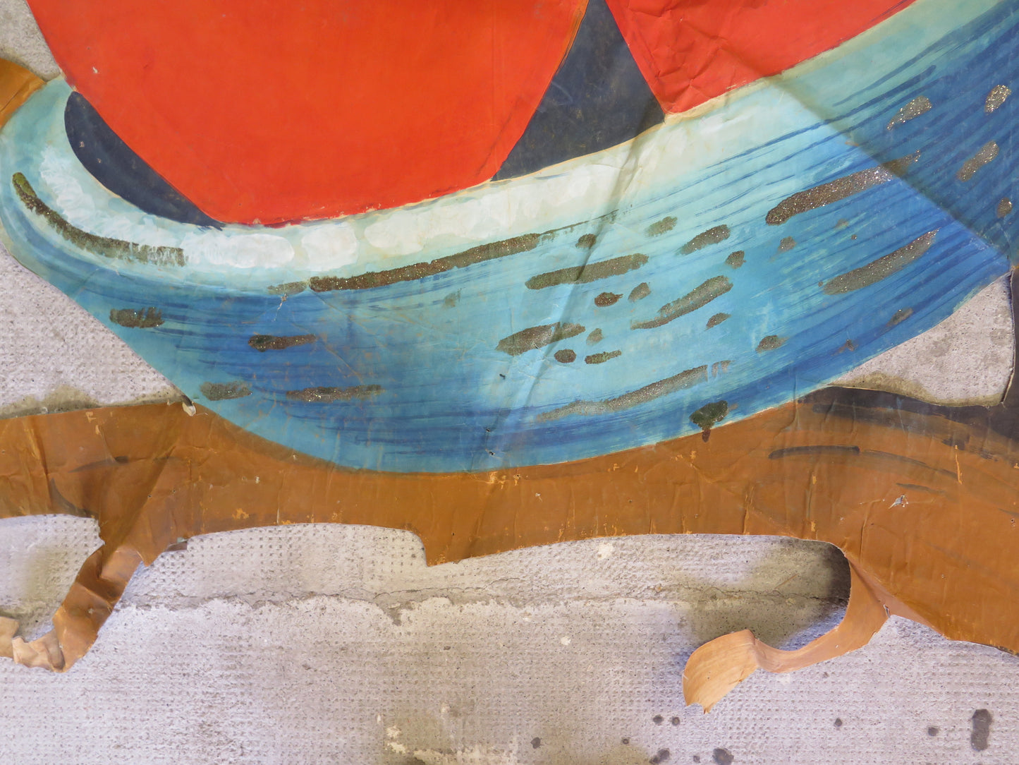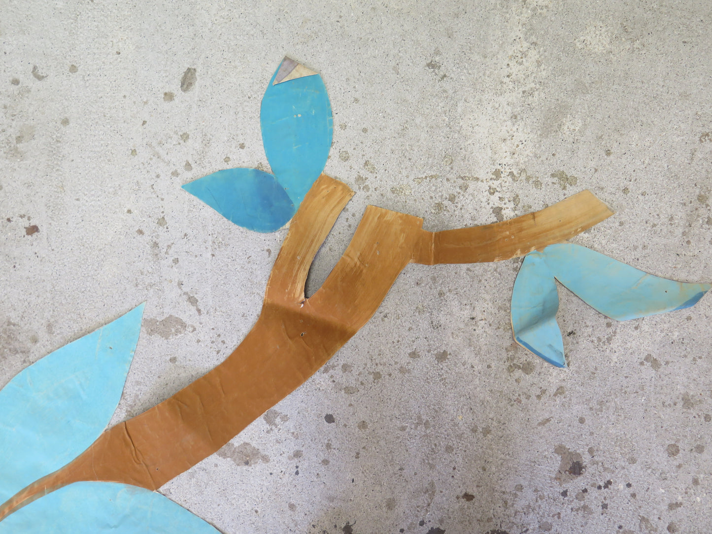 Theater backdrop made of hand painted paper depicting a tree with a carved trunk from which the silhouette of a character stands out.