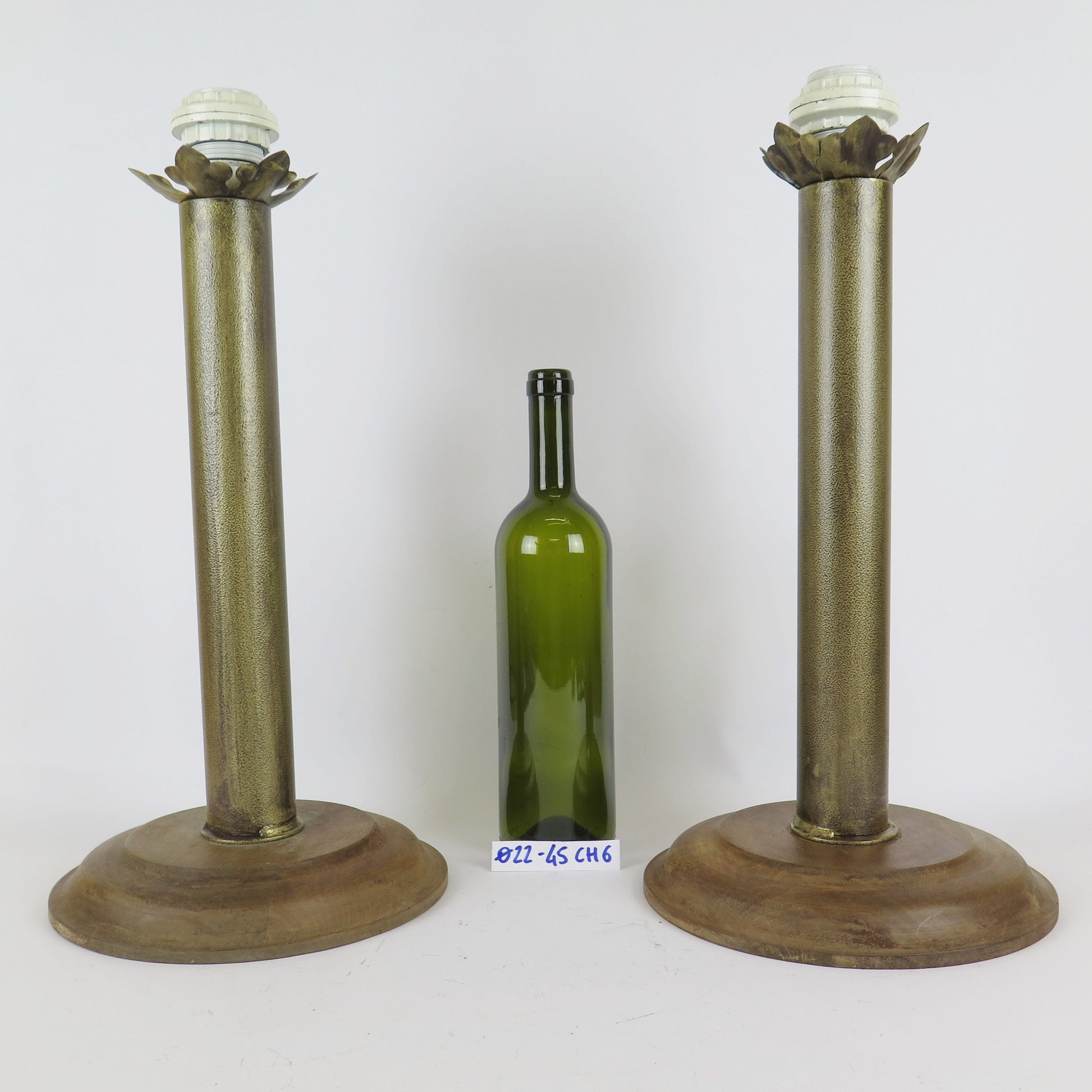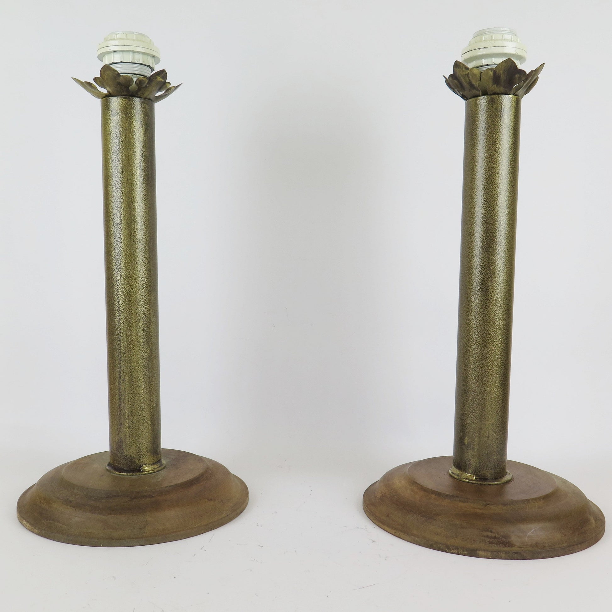 Elegant pair of wrought iron table lamps with circular wooden base.