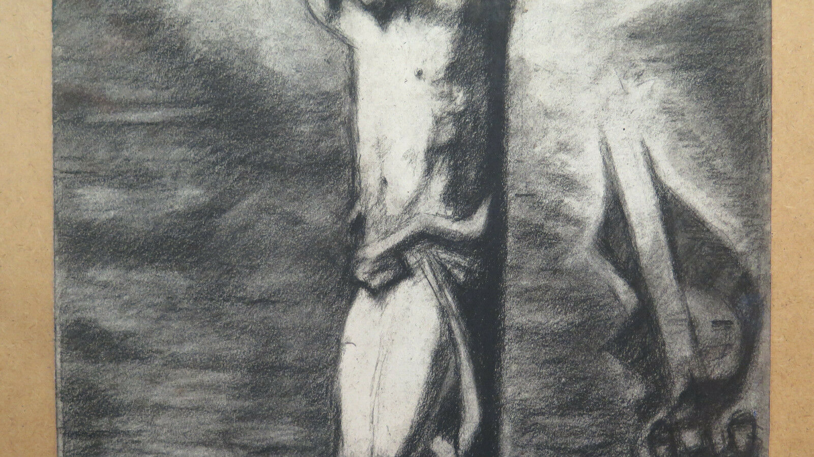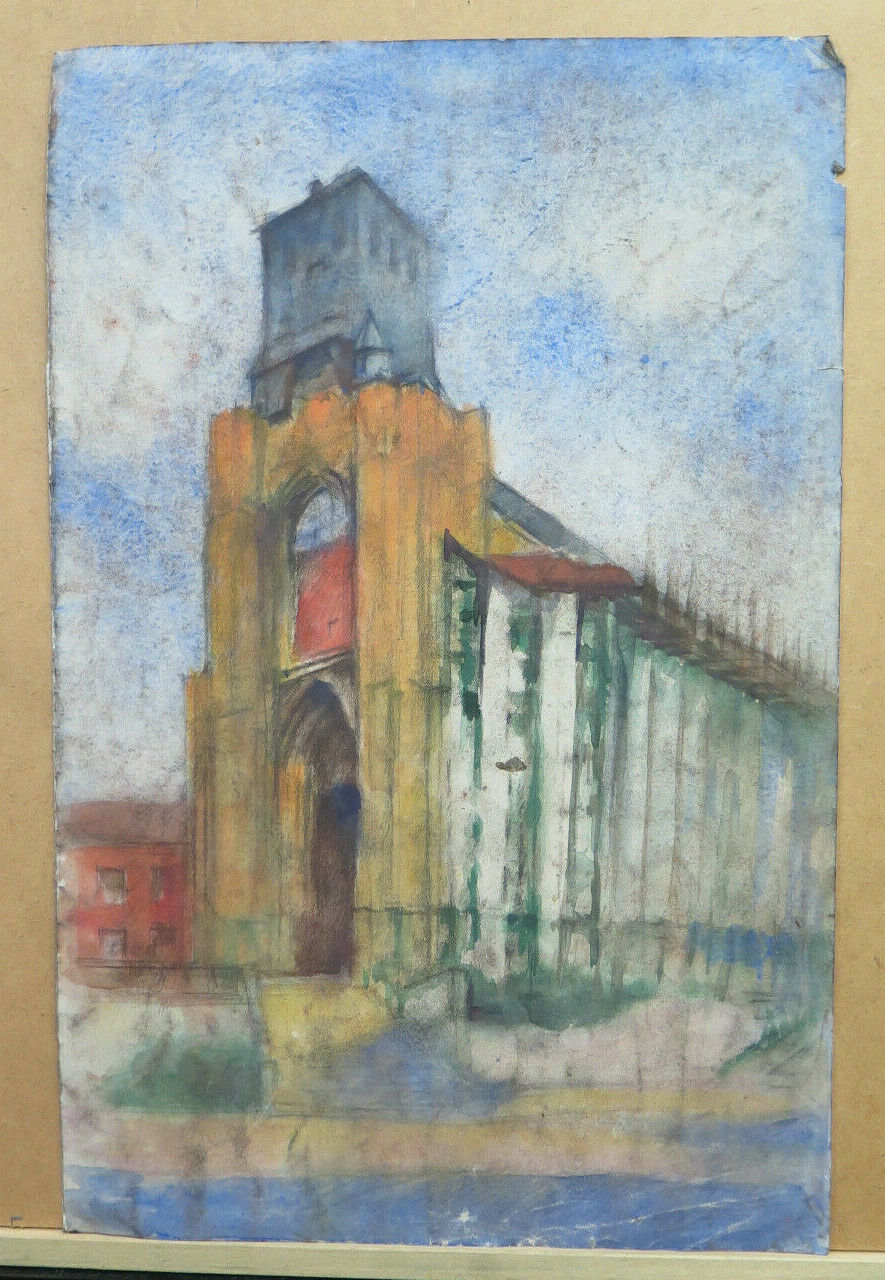 Crucifixion on the front with a color view of a church on the back, probably a study made in his youth inspired by an ancient painting.