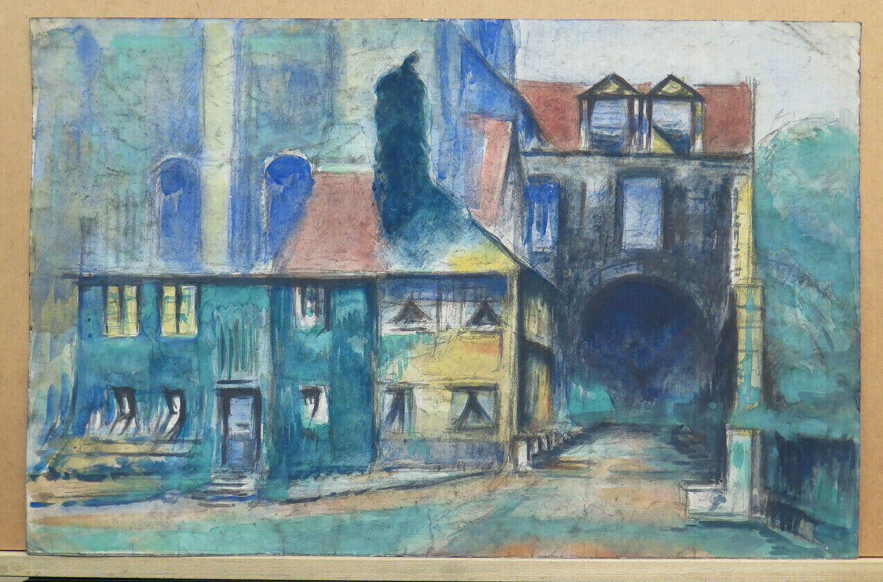 Intense portrait of an elderly lady on the front and a color city view on the back, probably a study made in her youth inspired by an ancient painting.