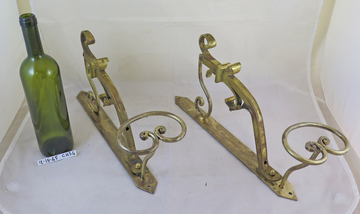 Elegant pair of hand-forged and gilded wrought iron coat hangers decorated with scrolls, very solid.