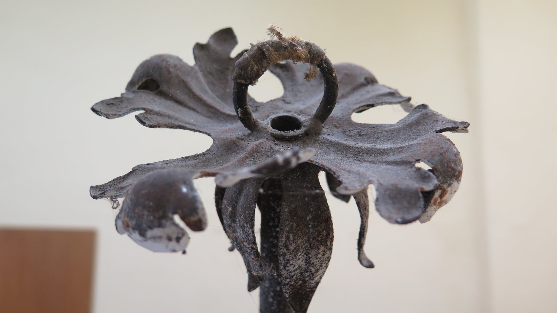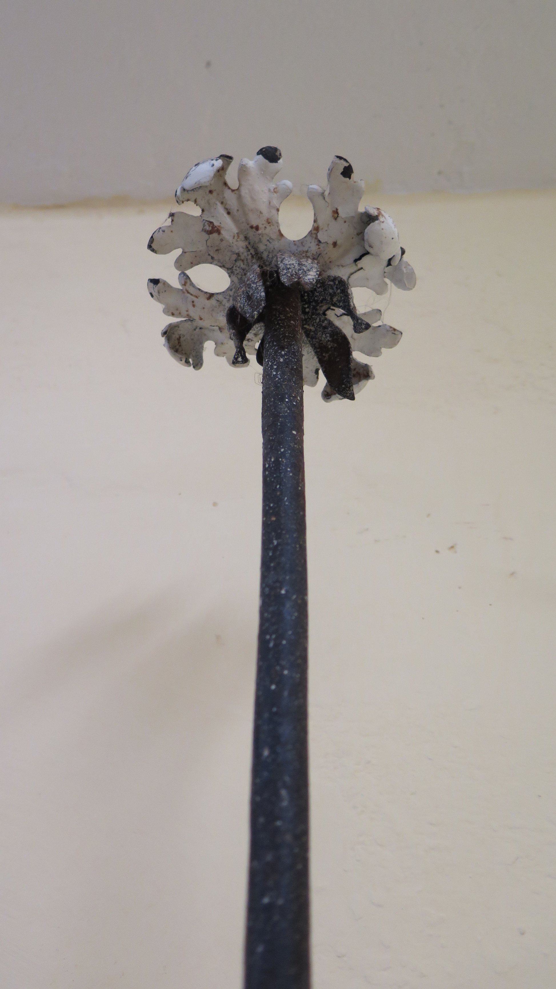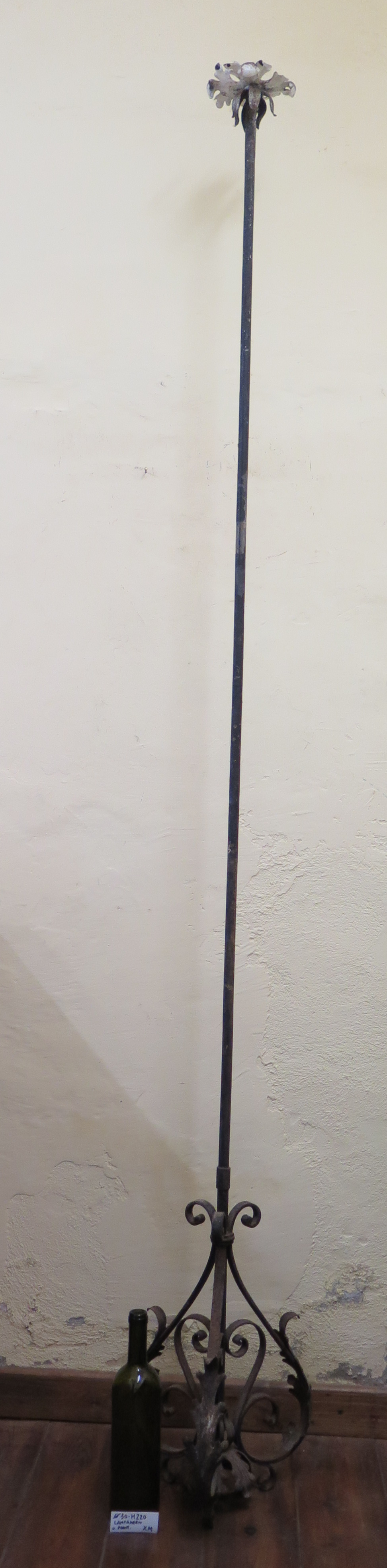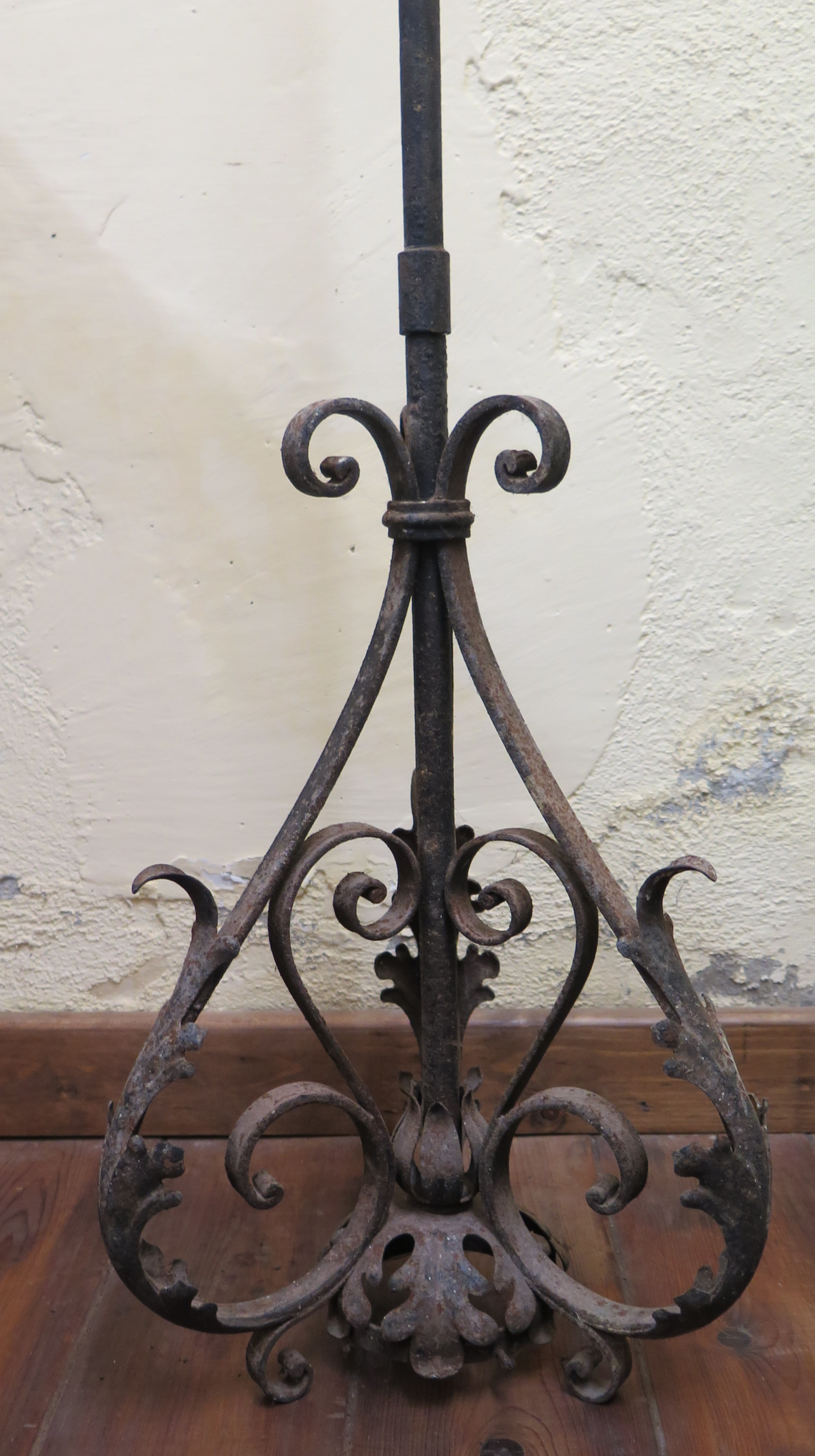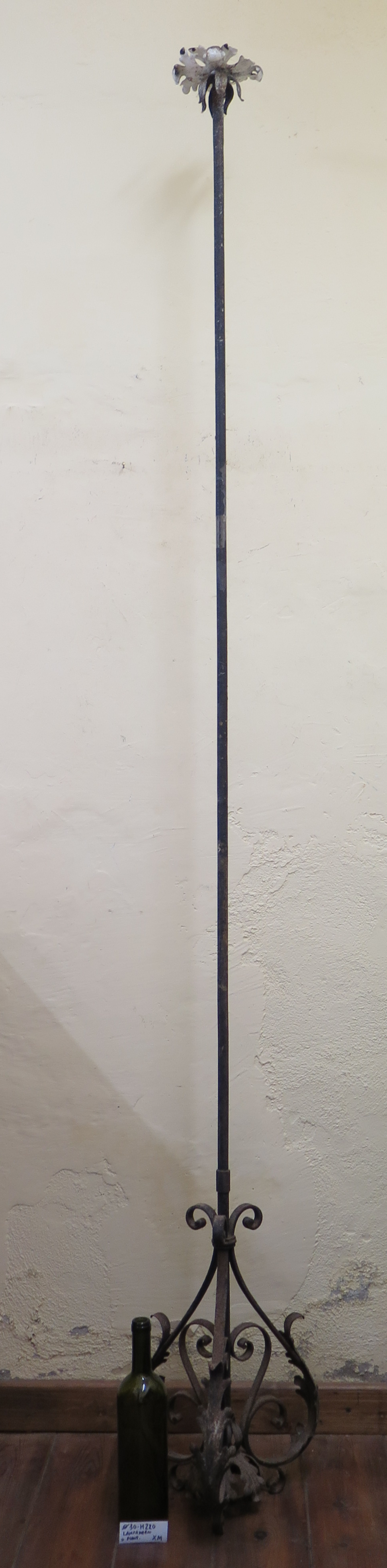 Elegant wrought iron chandeliers with a tall stem that ends in a structure decorated with vegetal and scroll motifs. Ideal for large environments or to be transformed into a floor lamp.