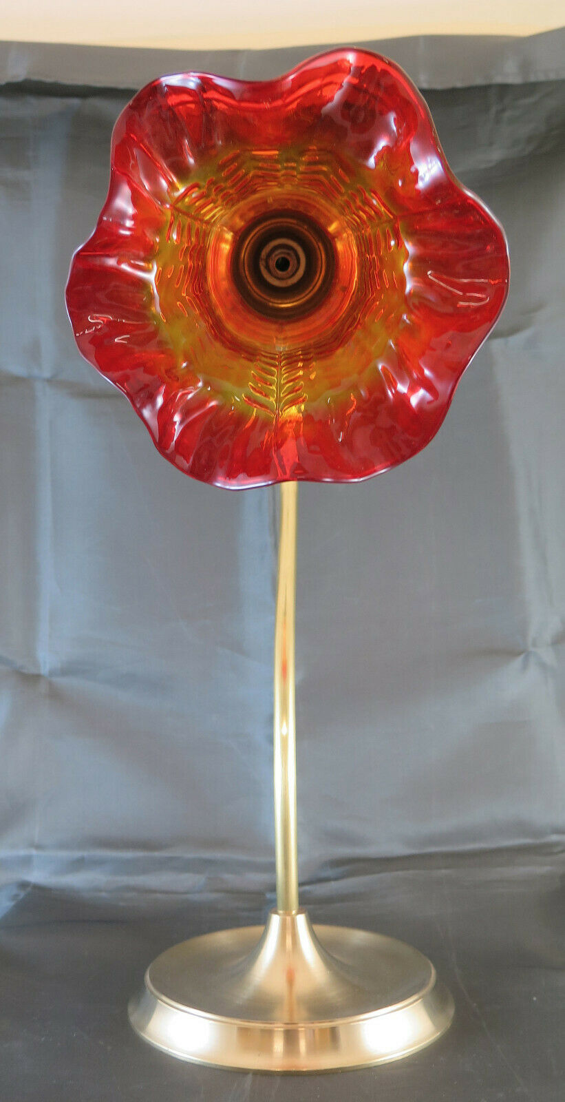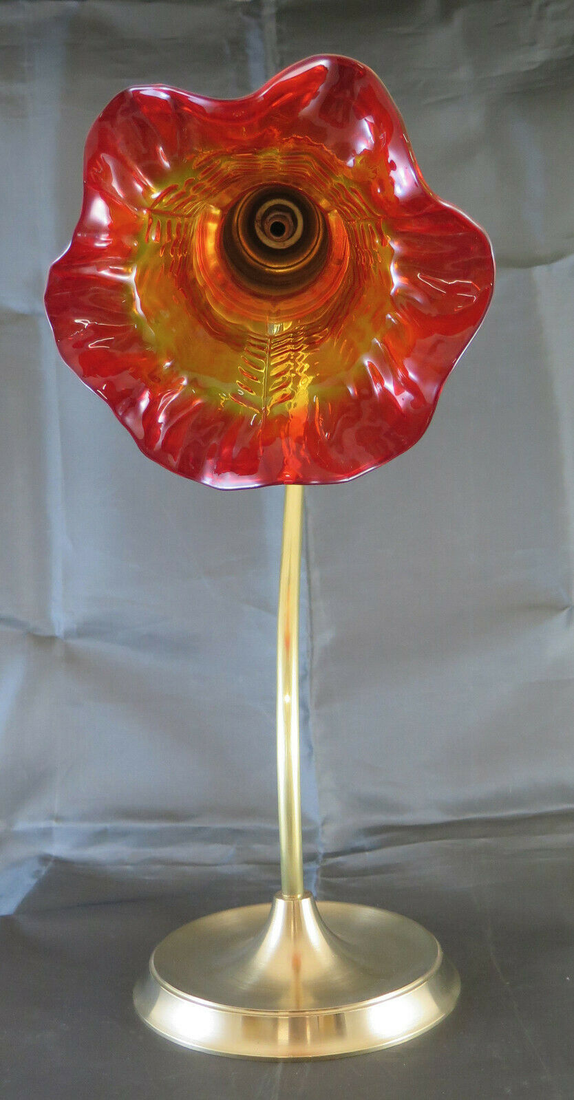 Elegant brass lamp with curved stem ending in a red glass tulip, circular solid brass base.