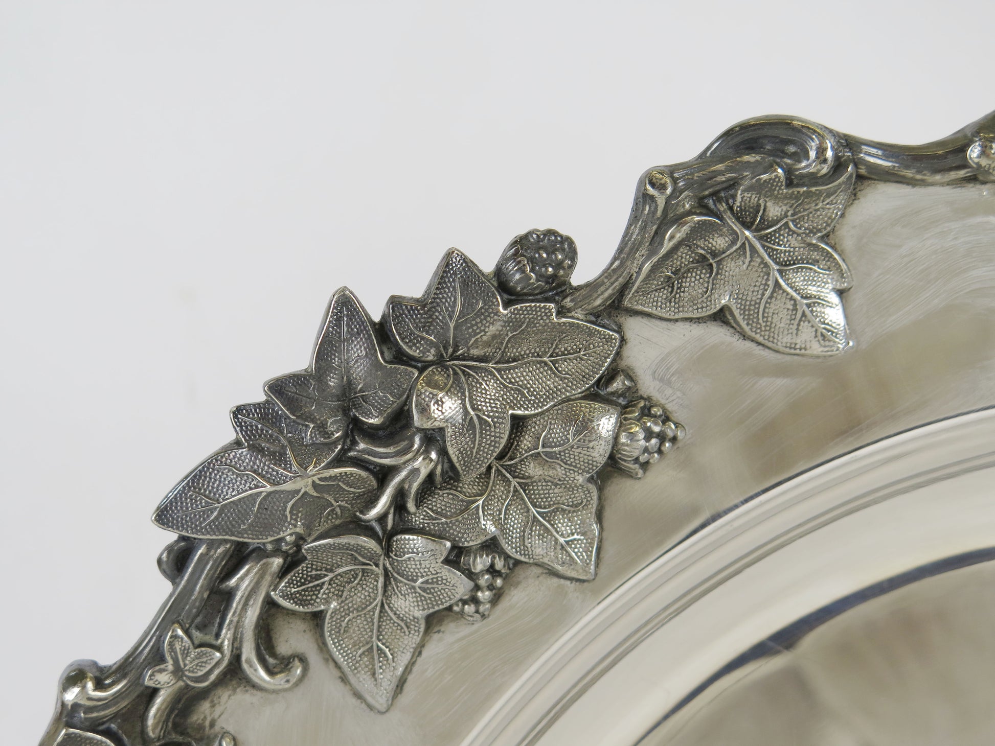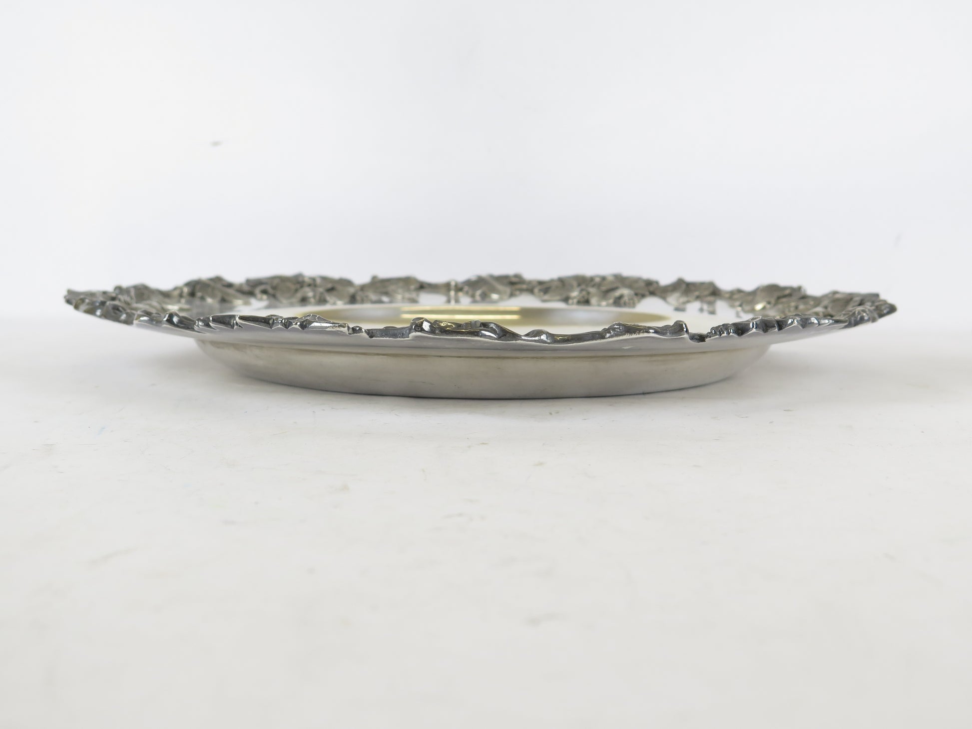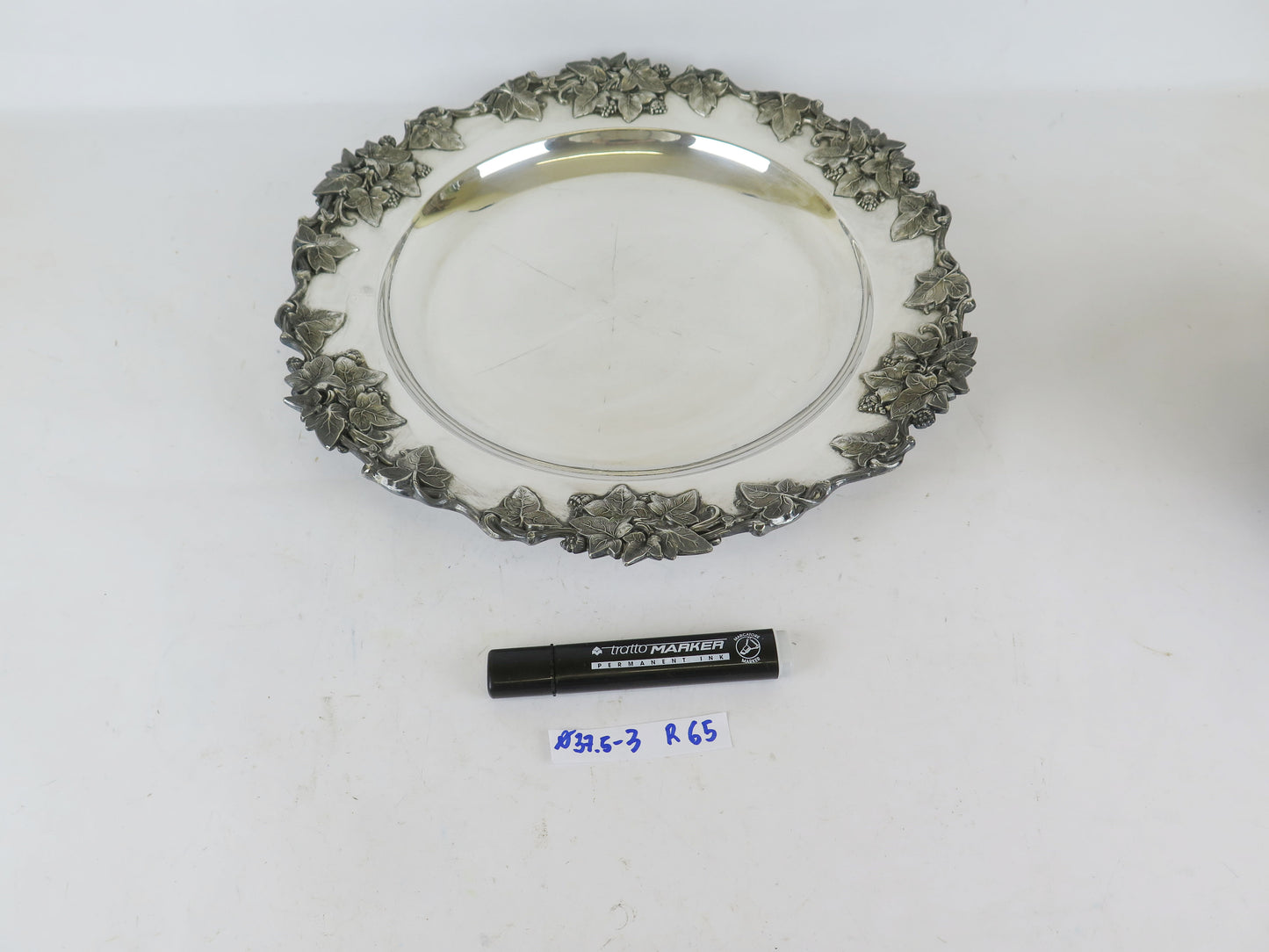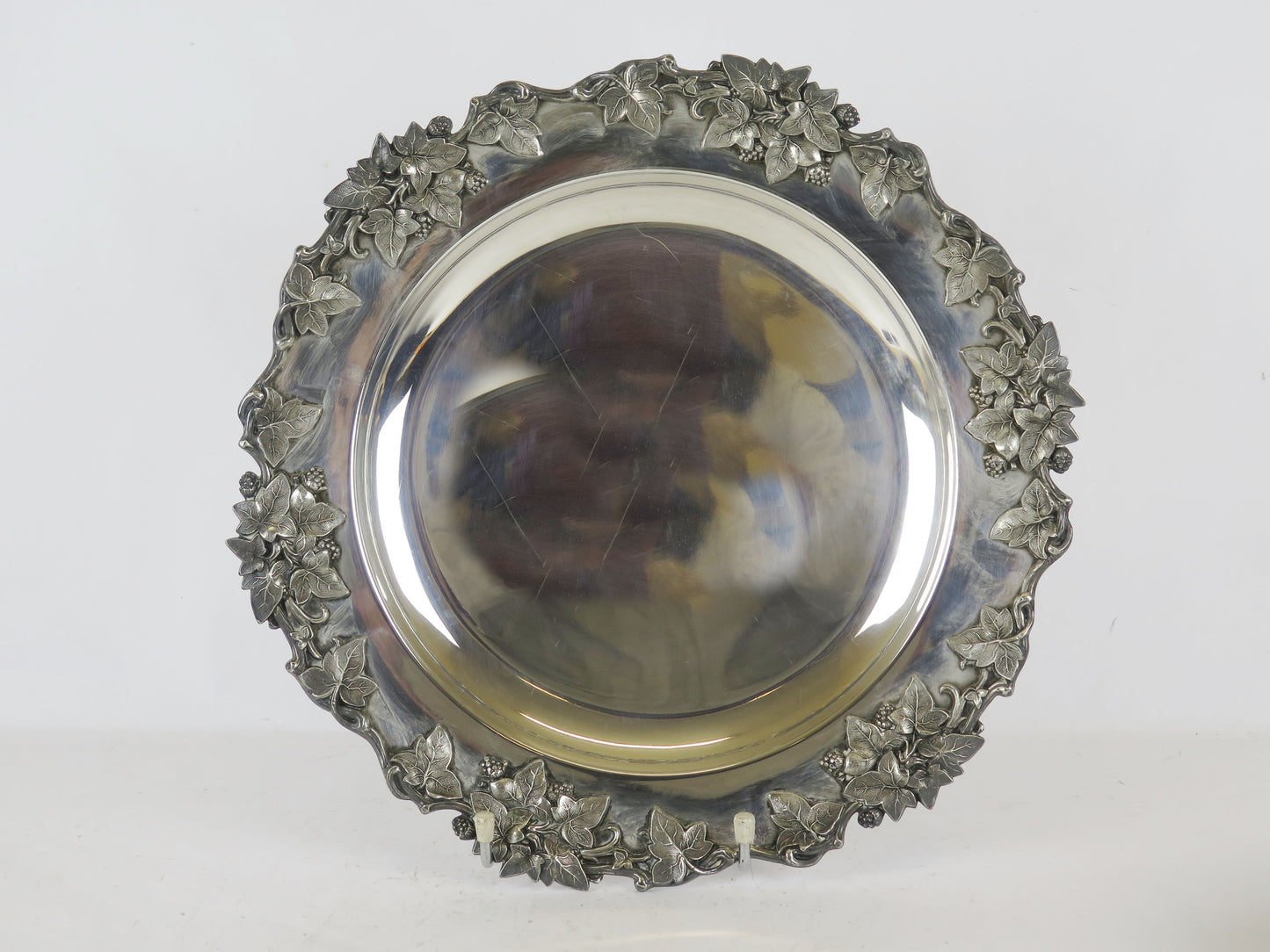 Large plate in silver-plated metal marked "English silver house" "Made and plated in England" enriched with plant motifs on the edge. Extraordinary quality and solidity.