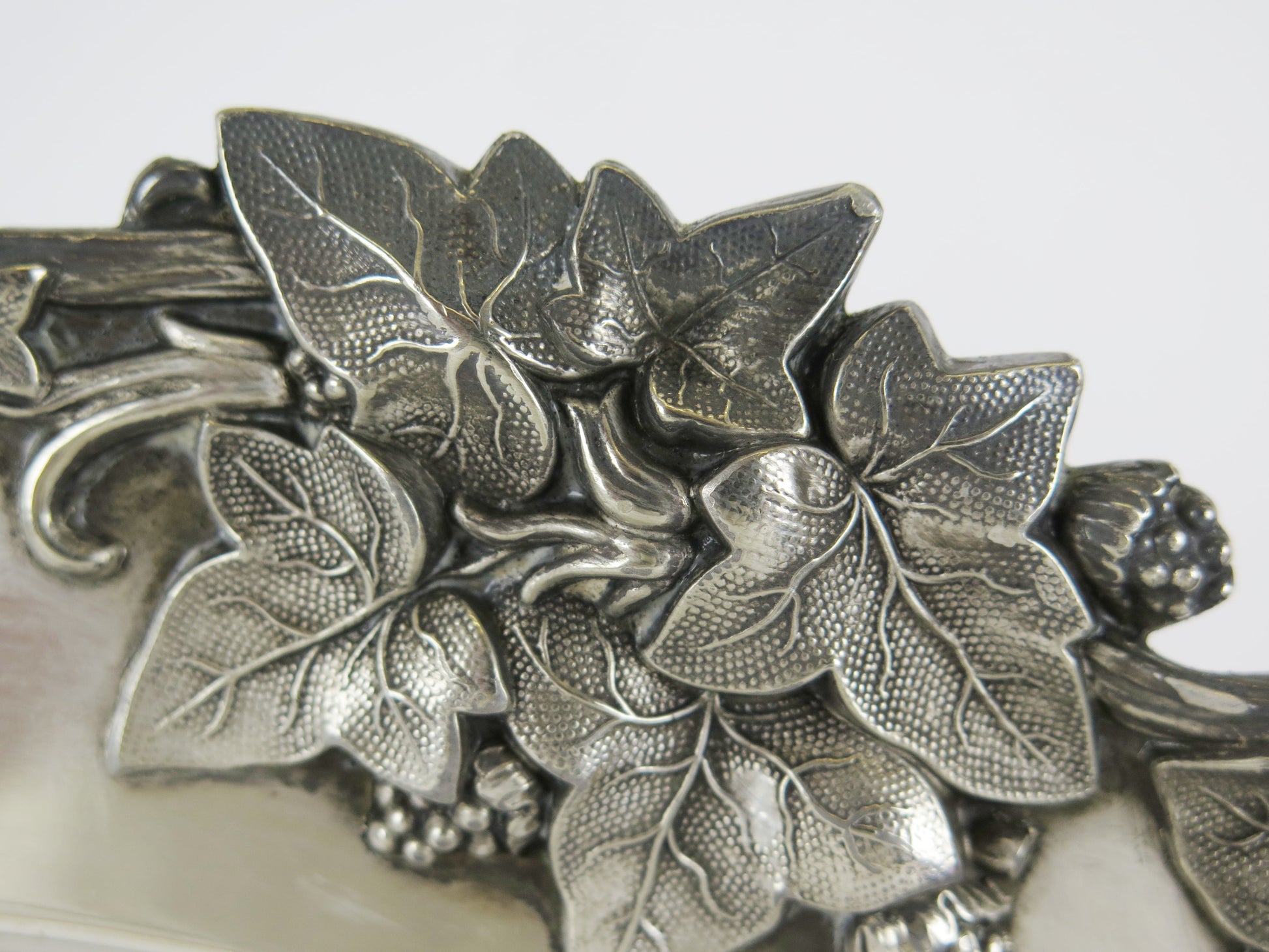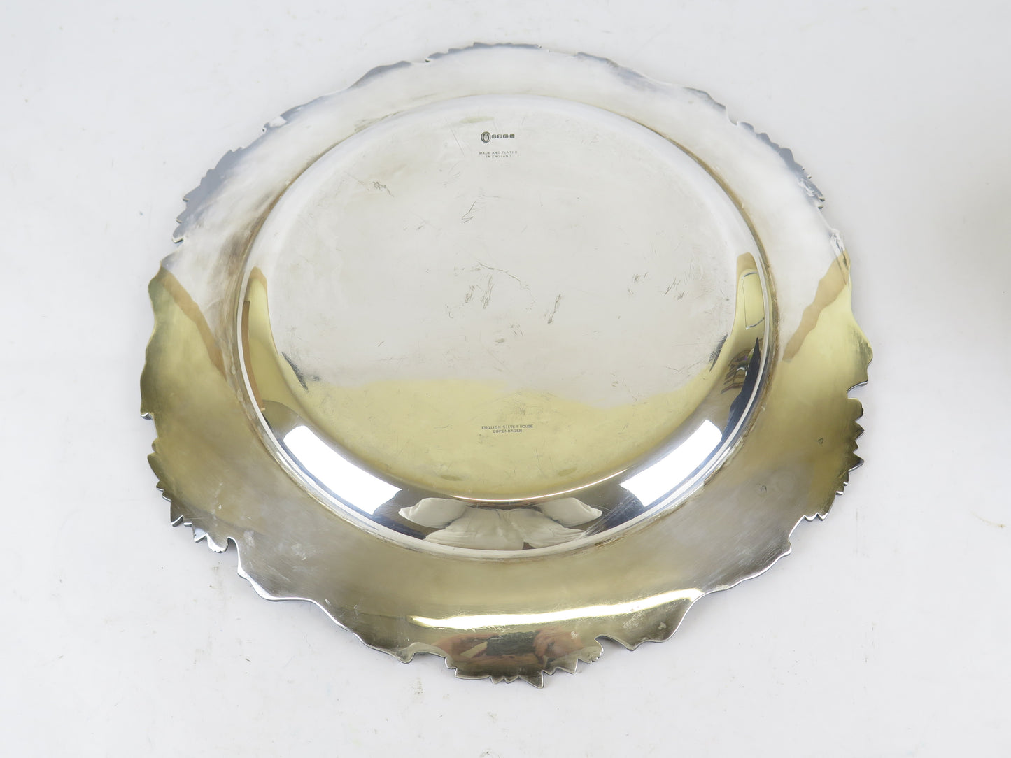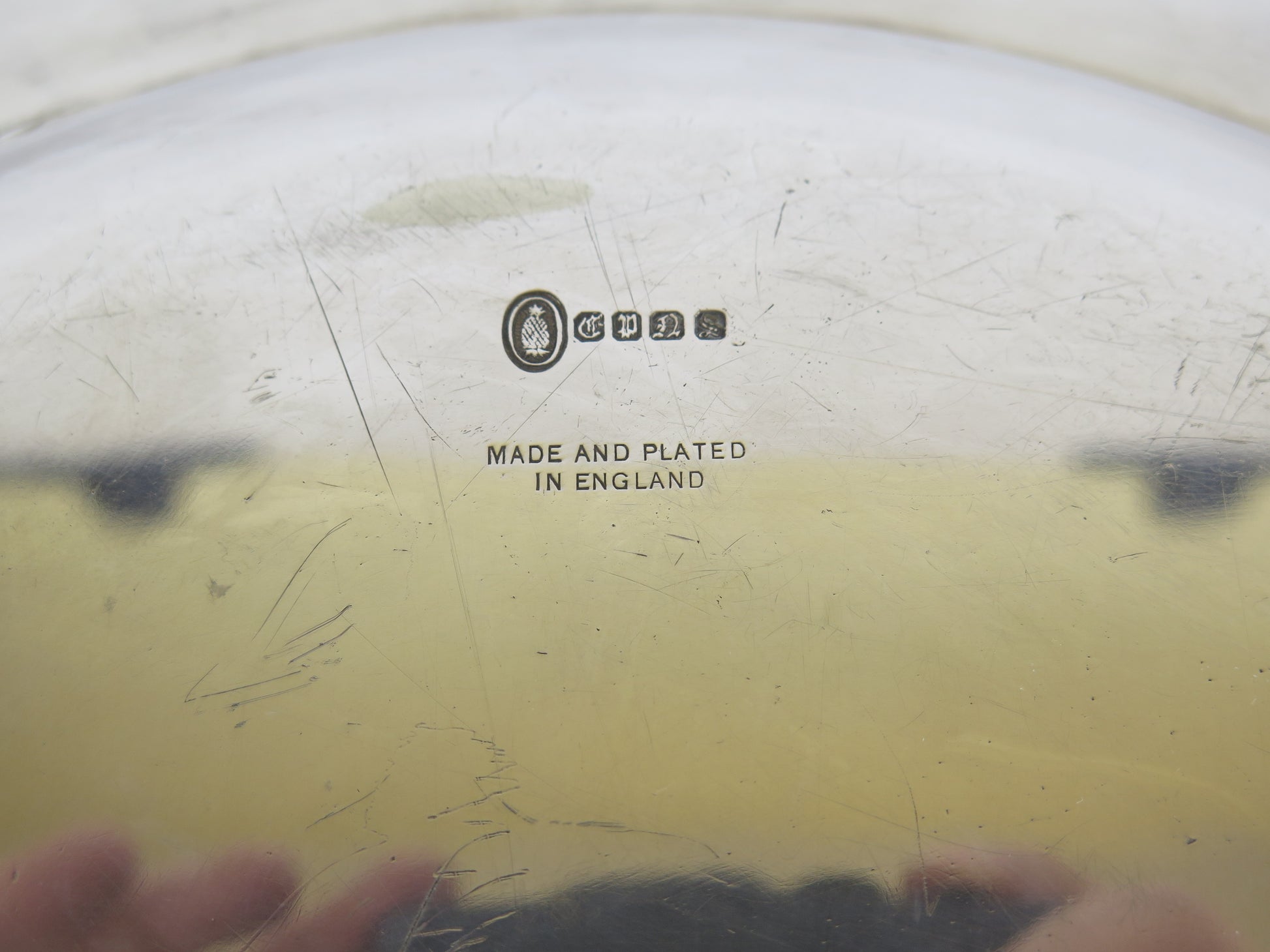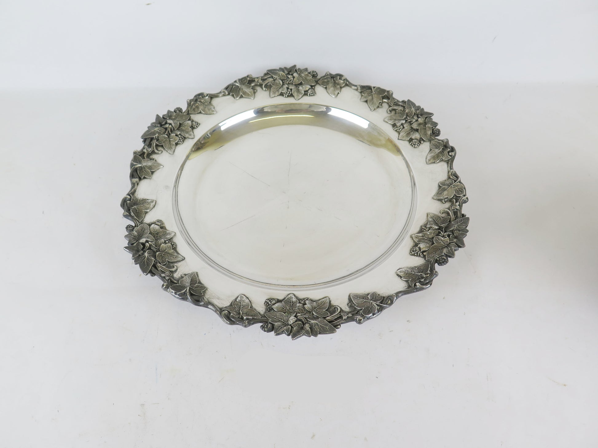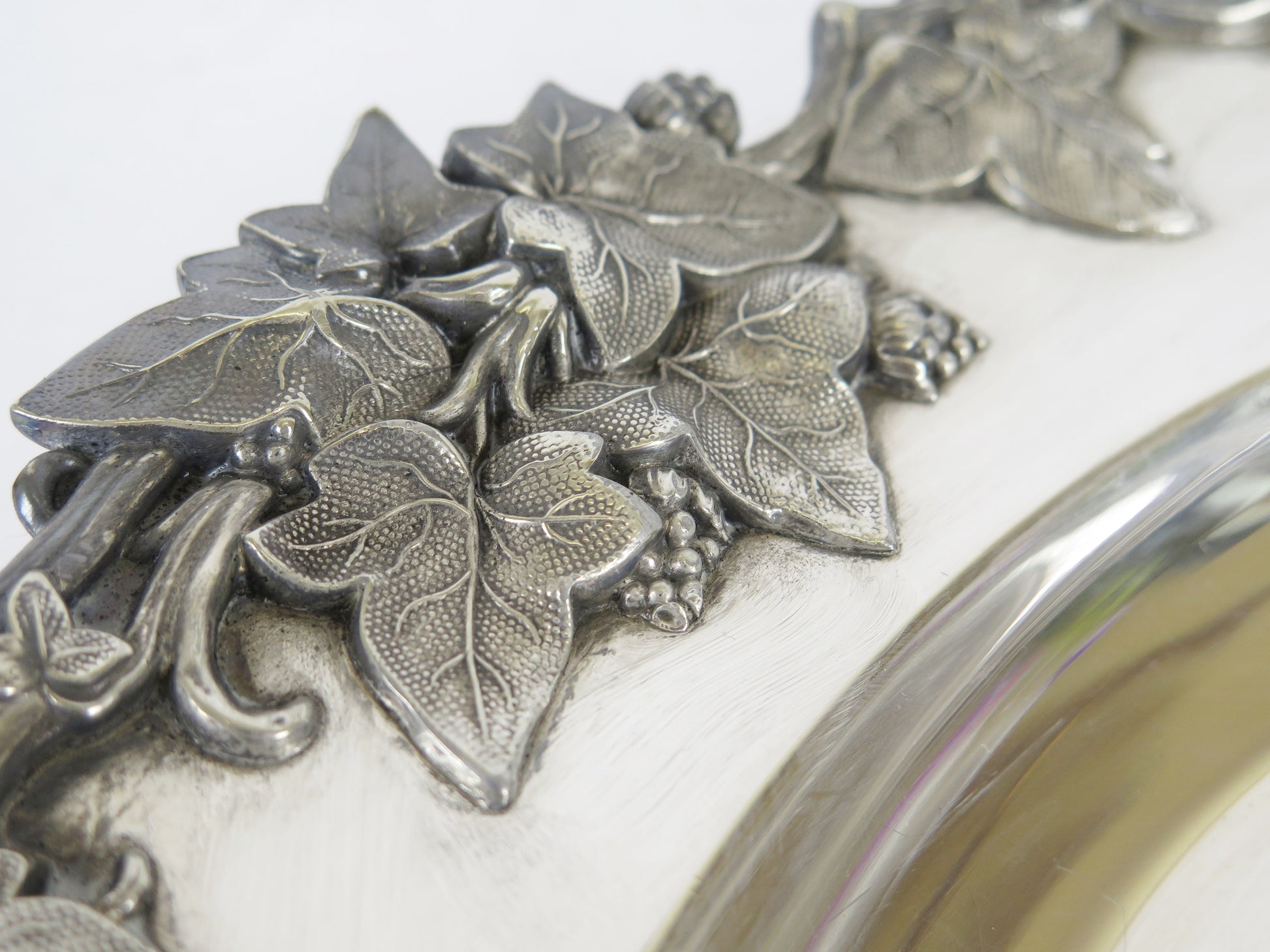 Large plate in silver-plated metal marked "English silver house" "Made and plated in England" enriched with plant motifs on the edge. Extraordinary quality and solidity.
