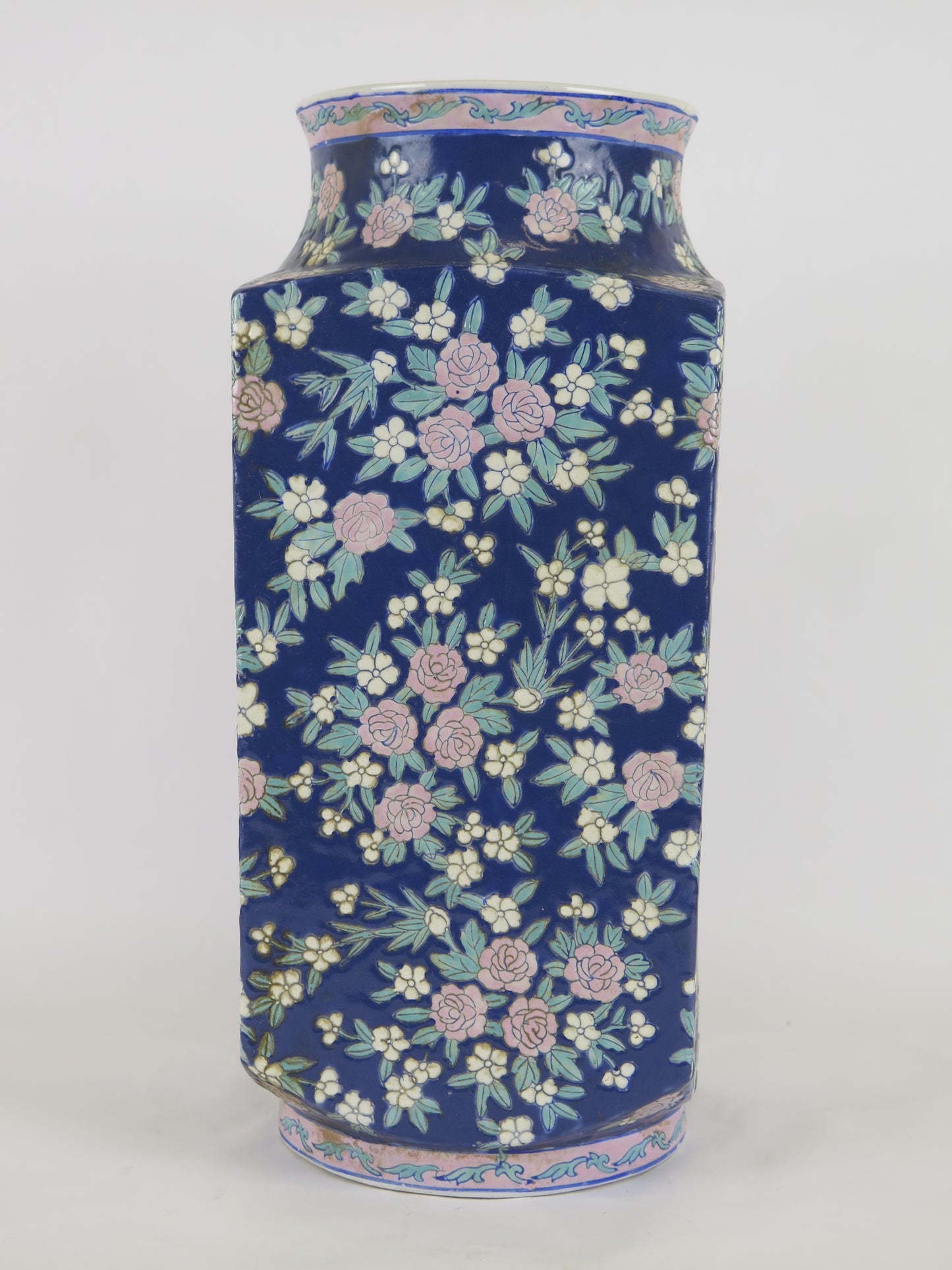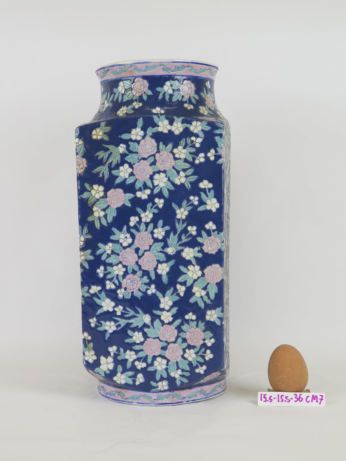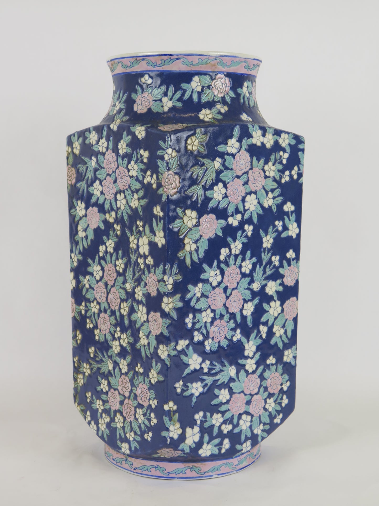 Large hand-painted Chinese ceramic vase on a blue background with a rich floral decoration. High quality vintage home decoration vase from China and imported into Europe during the second half of the 20th century