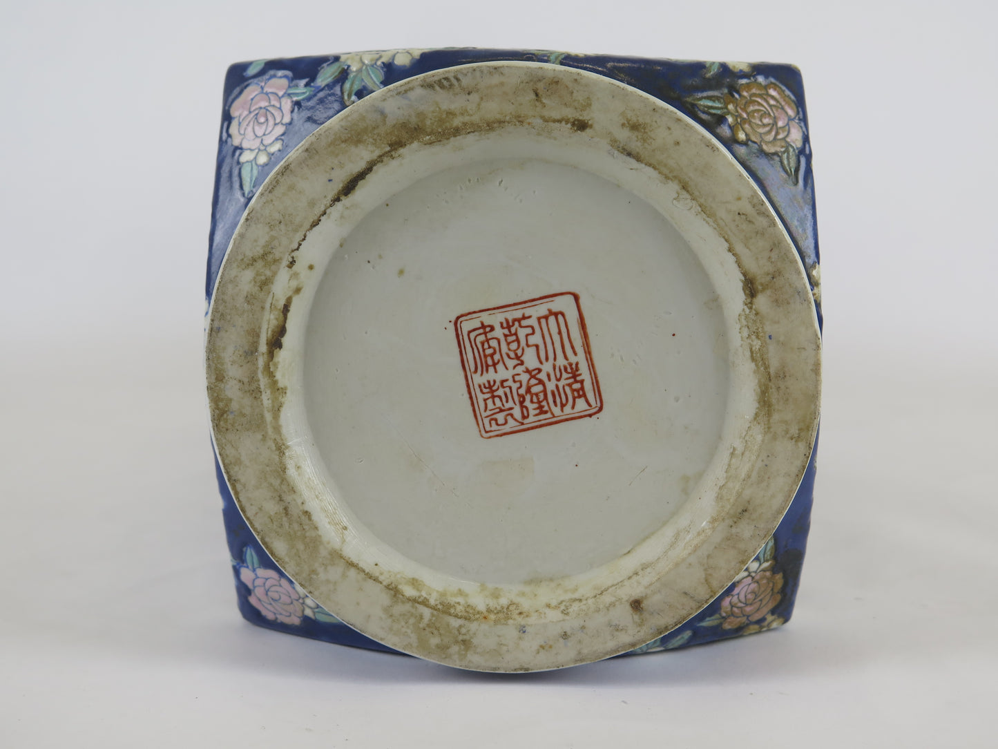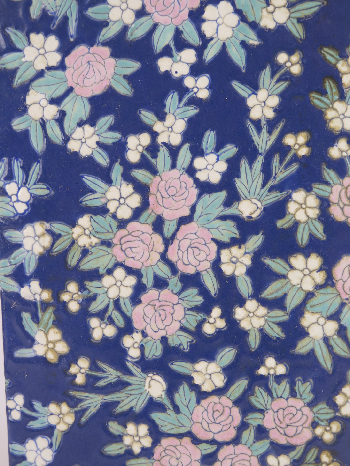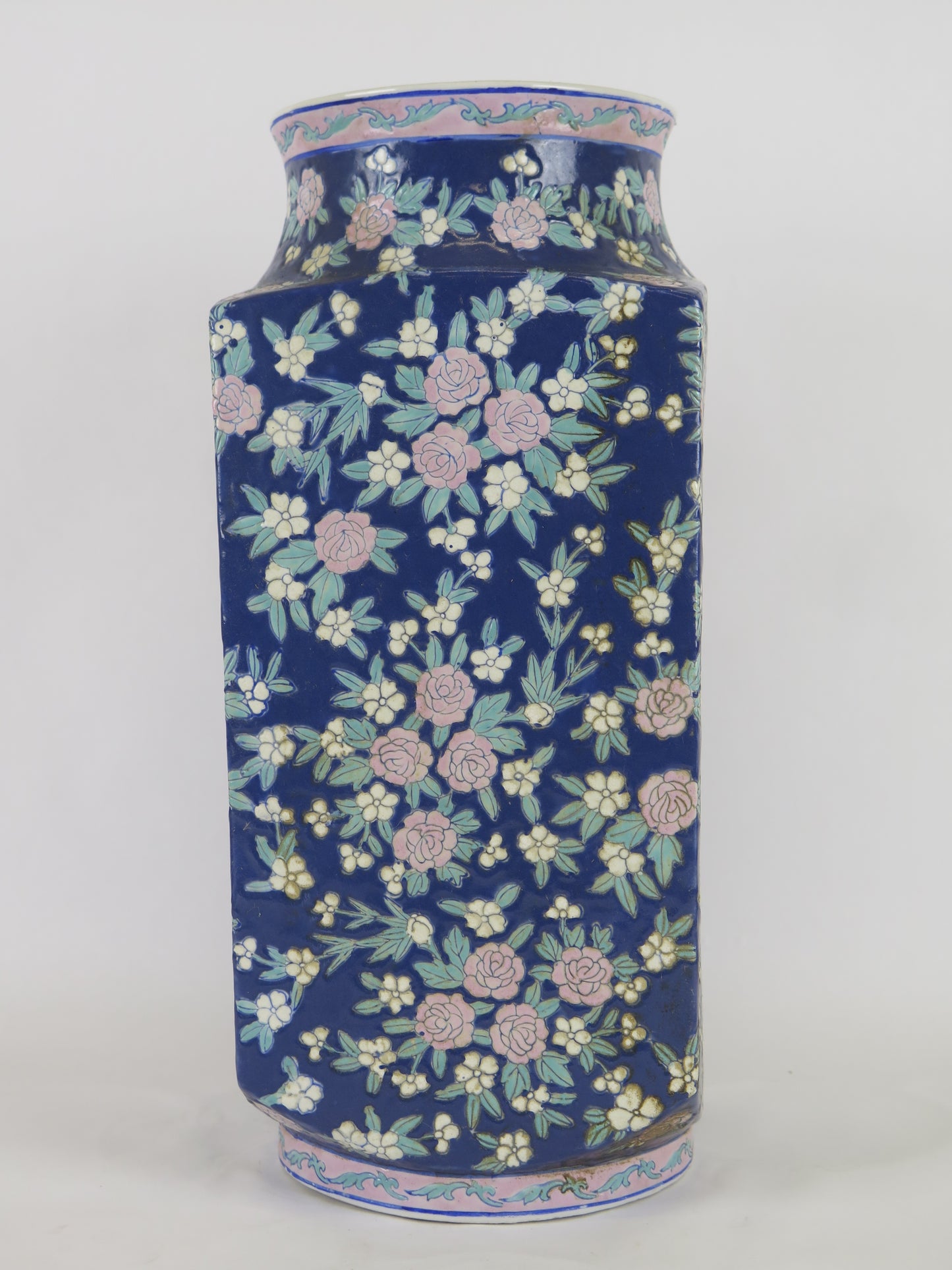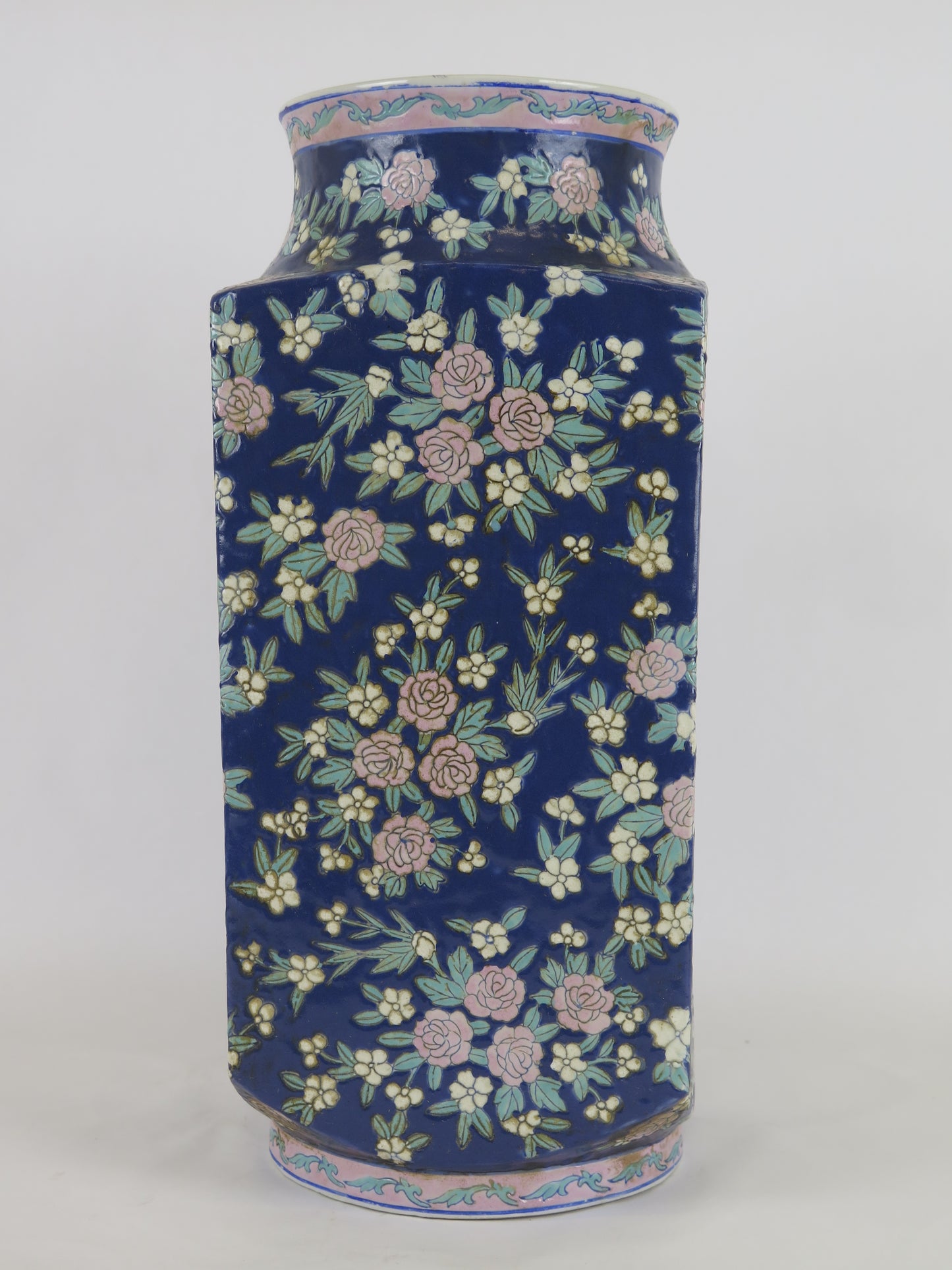 Large hand-painted Chinese ceramic vase on a blue background with a rich floral decoration. High quality vintage home decoration vase from China and imported into Europe during the second half of the 20th century