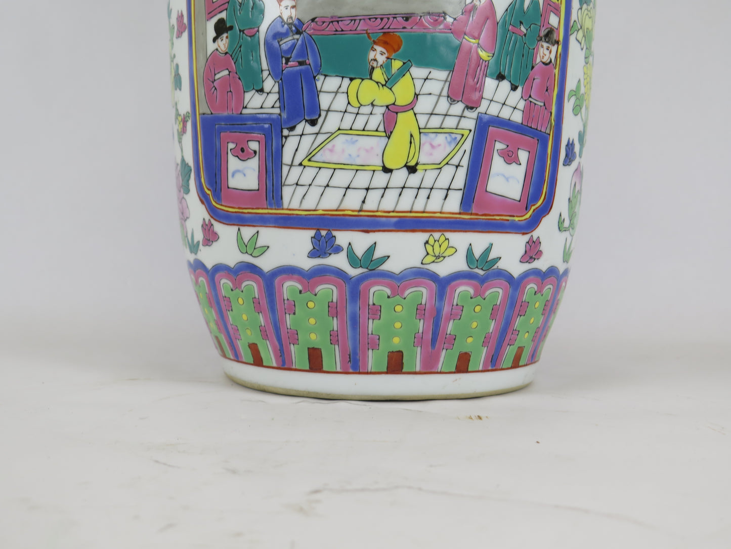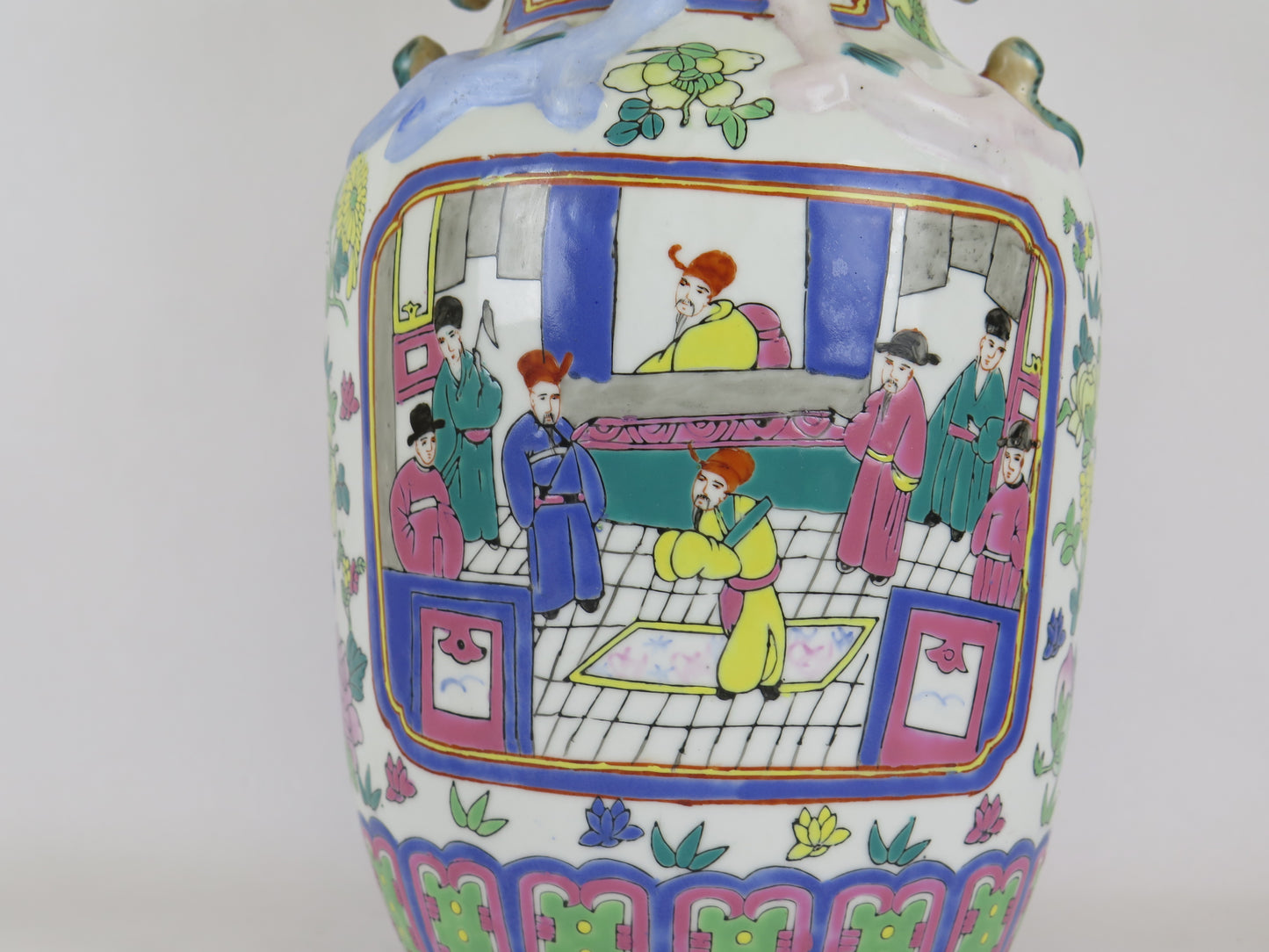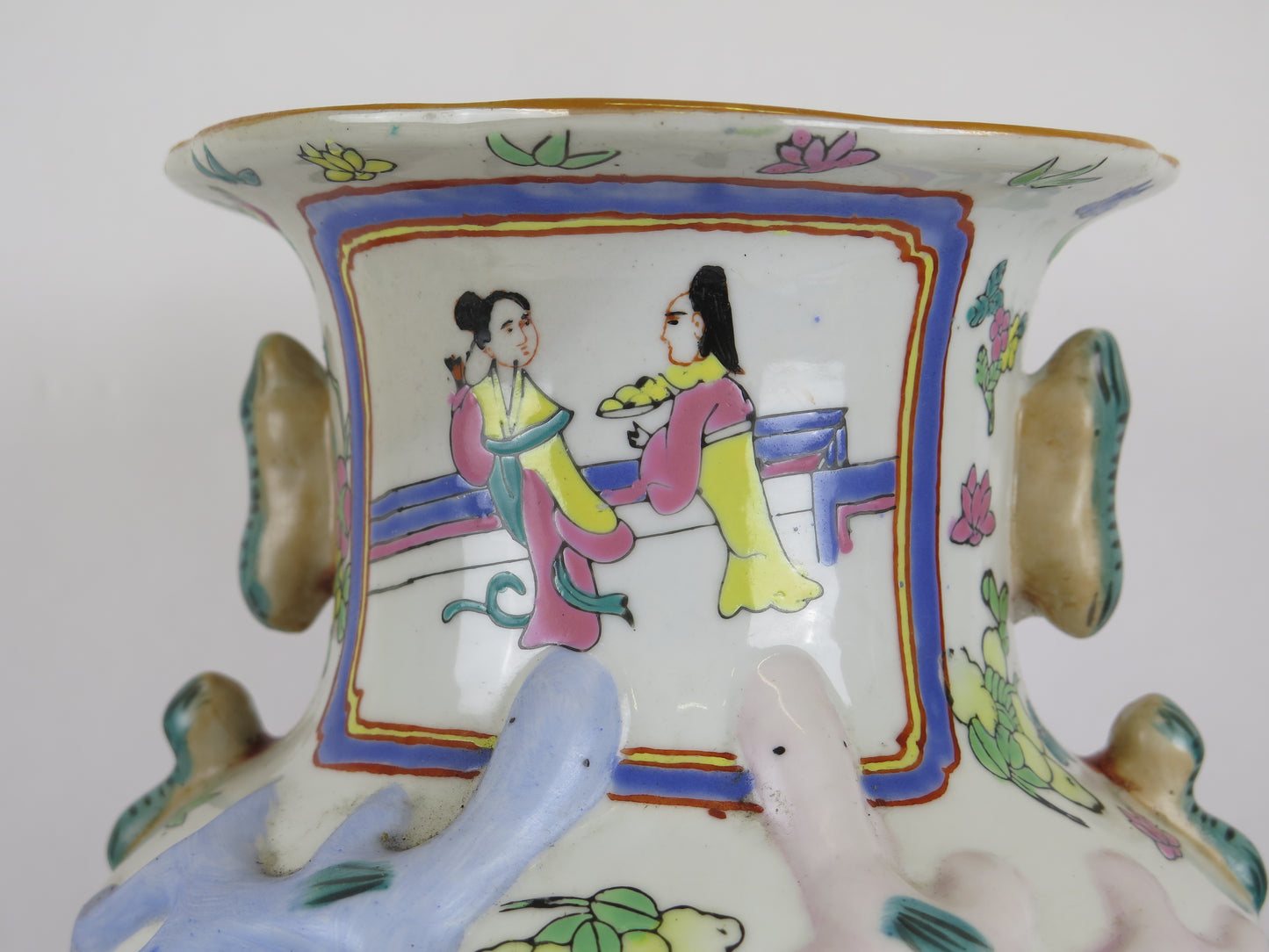 Elegant circular section ceramic vase hand painted with figures.