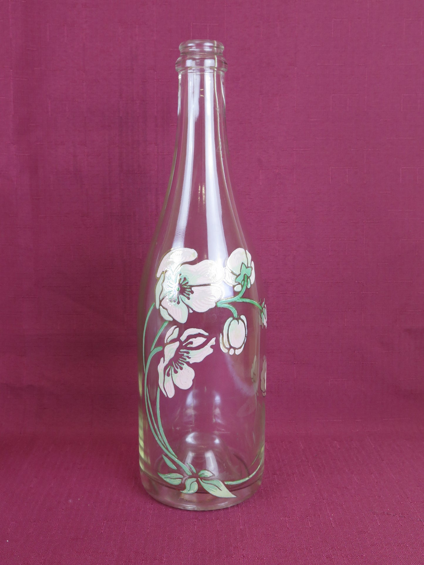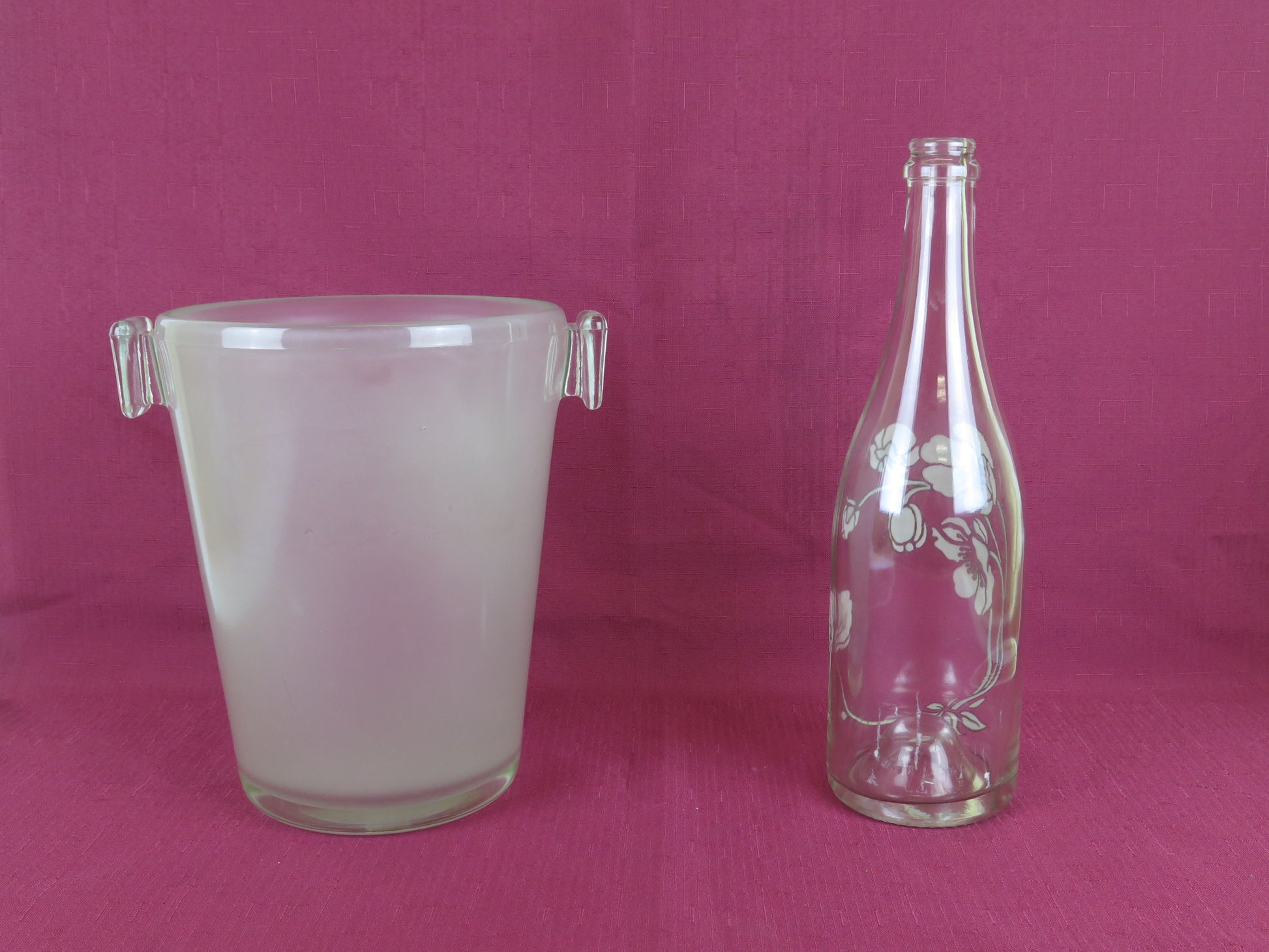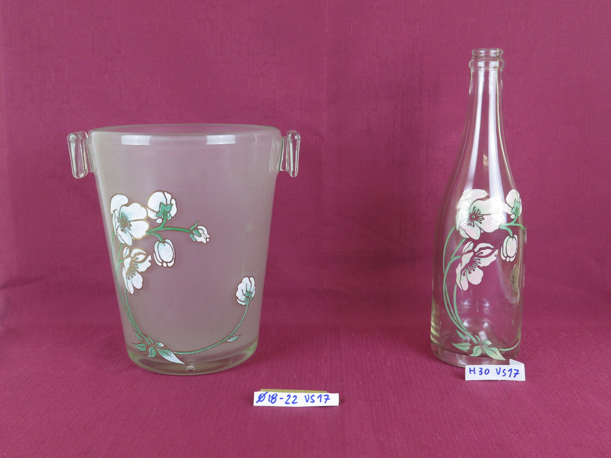 Champagne bottle (empty) and Perrier Jouet ice bucket decorated in art nouveau style.