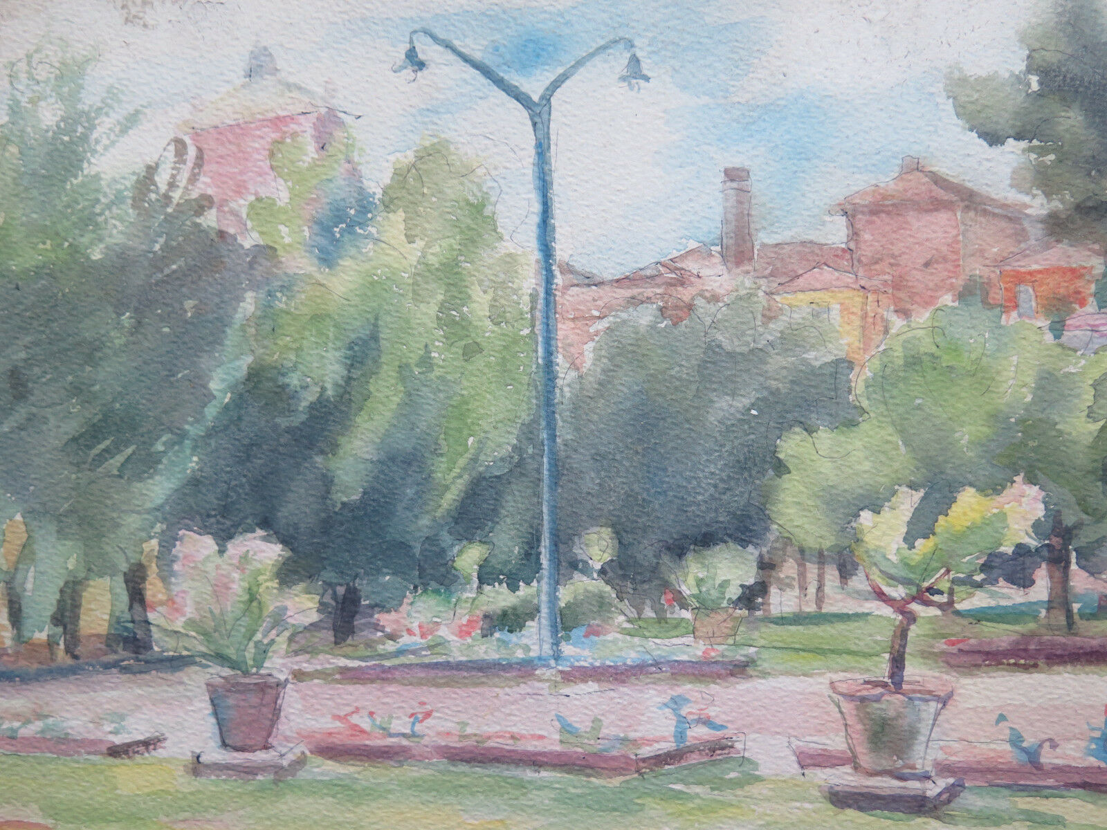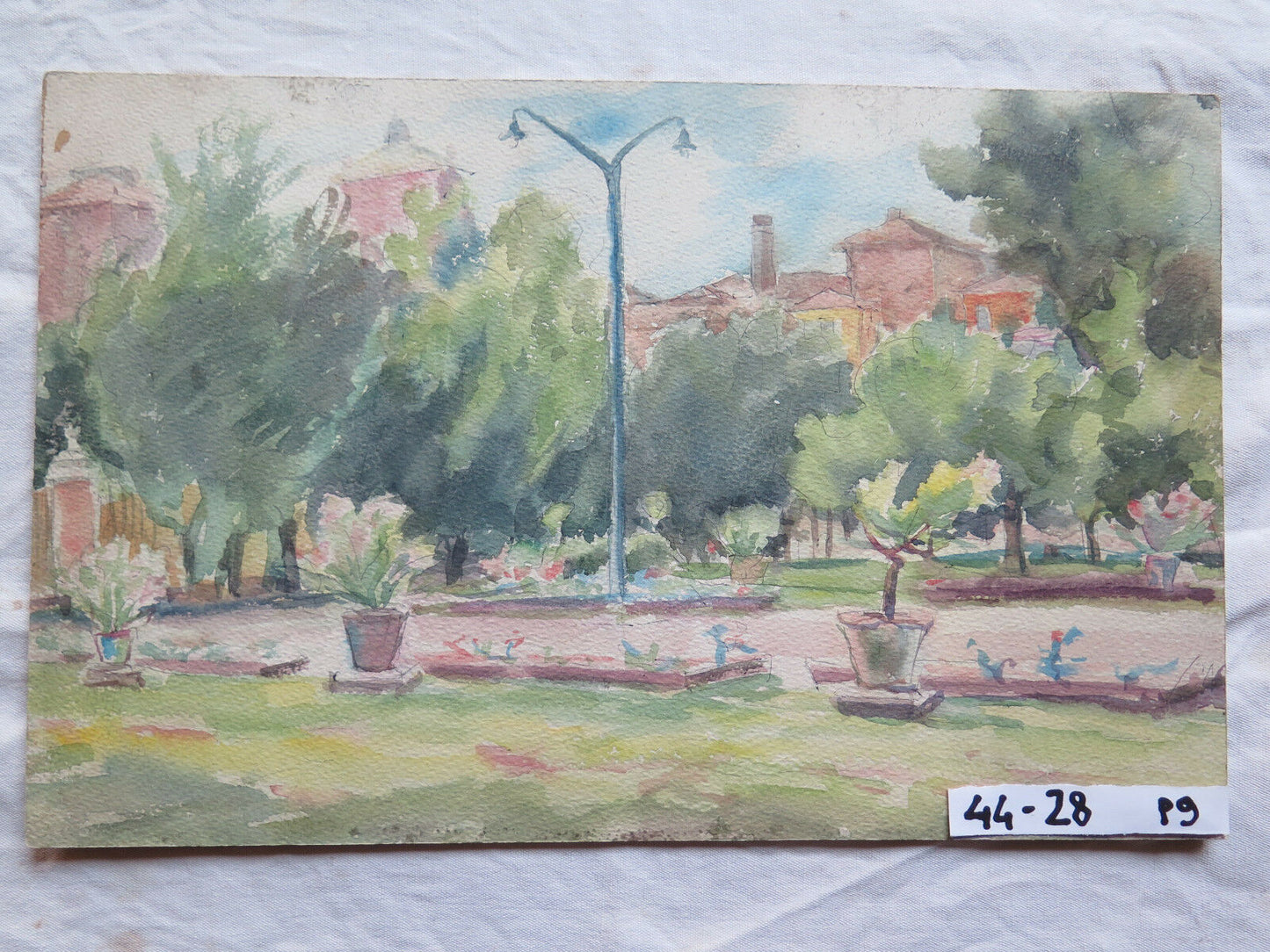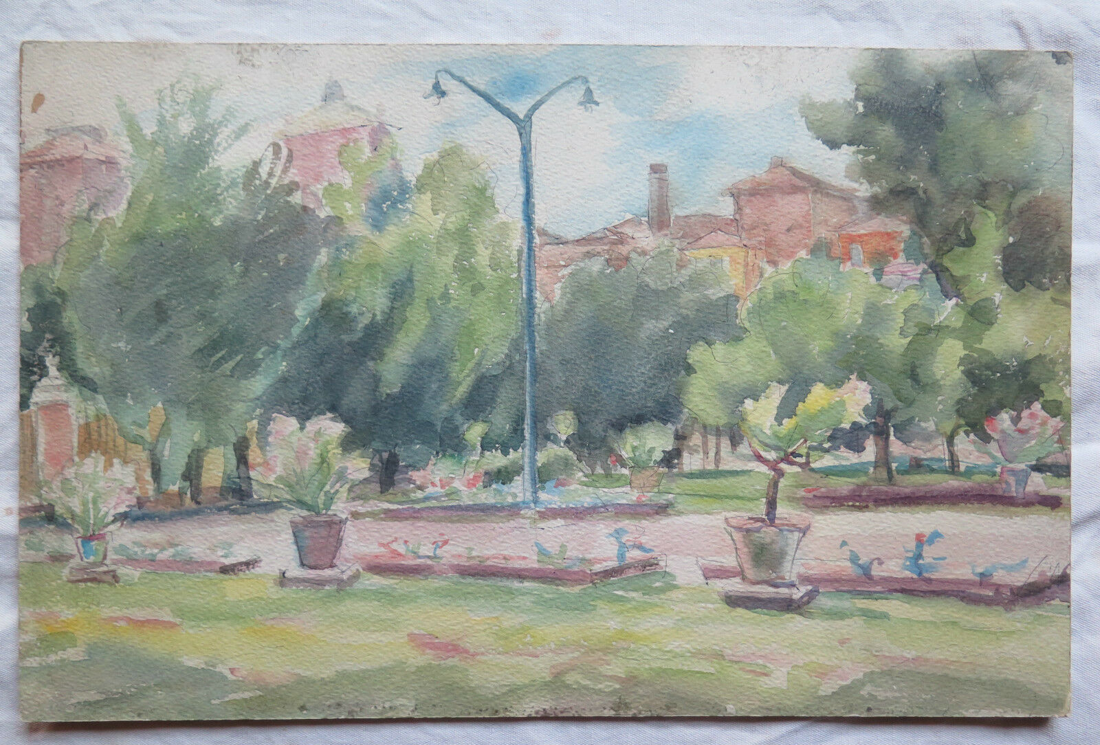 Ancient watercolor painting on wood, view of the public gardens of the town of Piumazzo, work by the artist Gaetano Pancaldi (1922-2014).