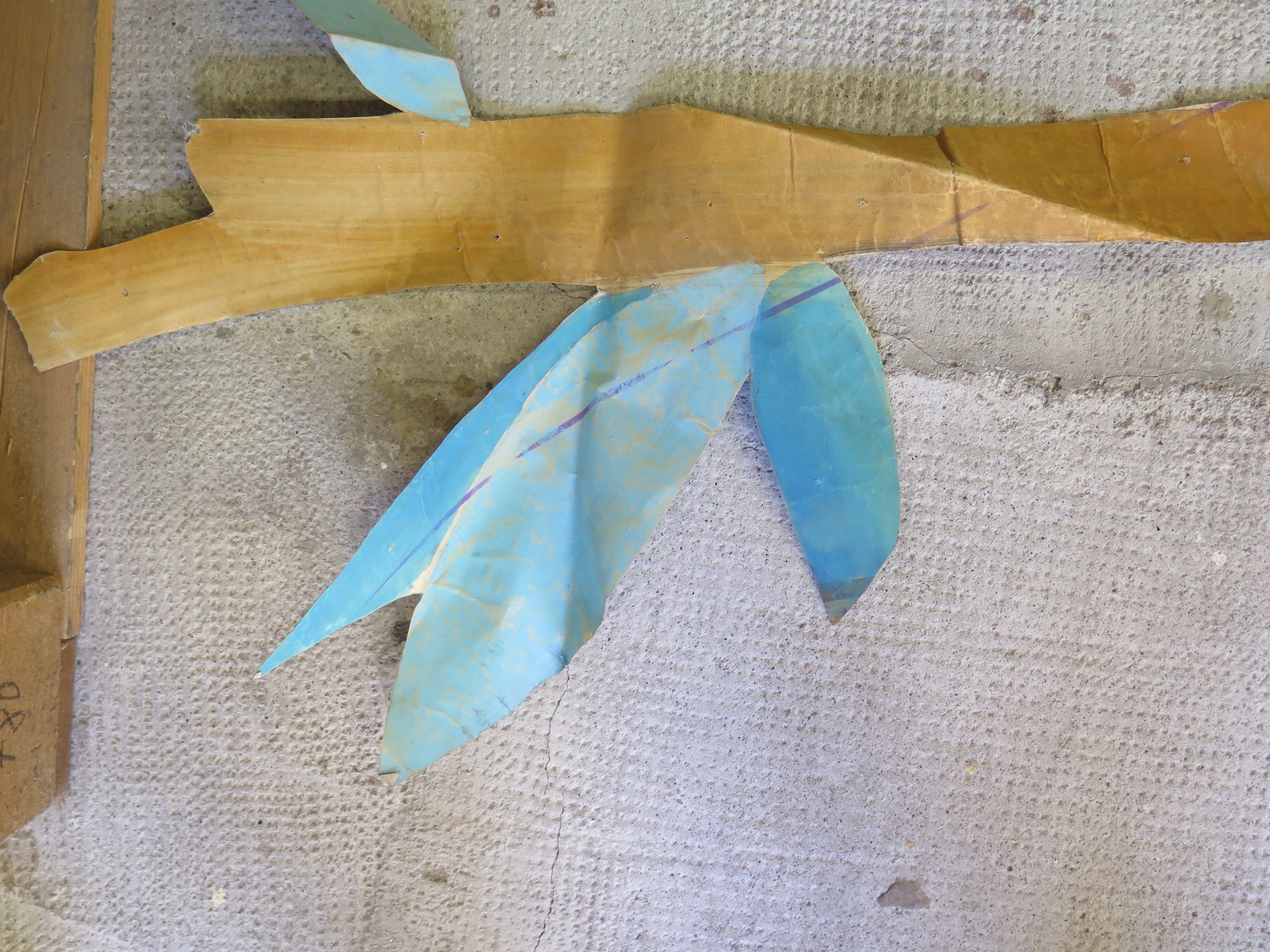 Fondale da teatro in carta dipinta a mano che raffigura un albero con il tronco intagliato da cui si staglia la sagoma di un personaggio.