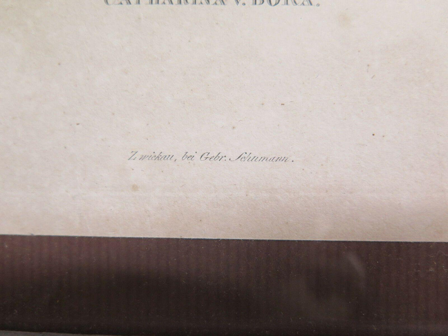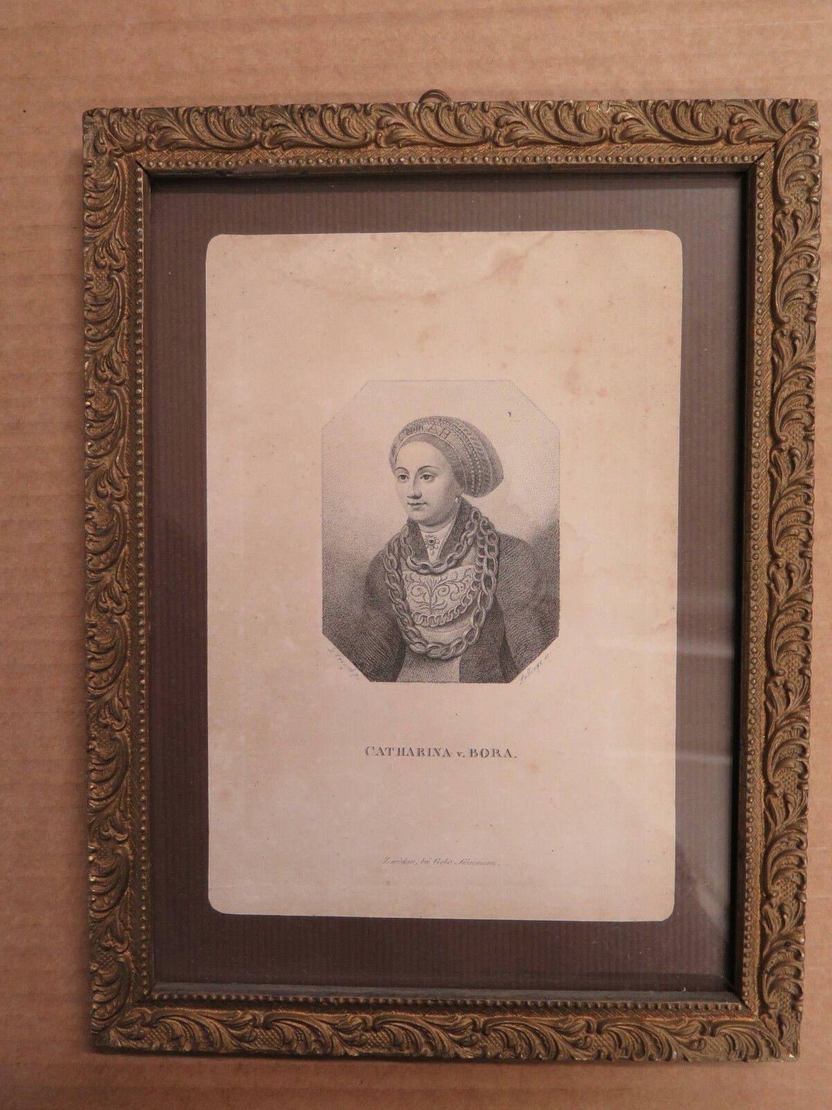 Antica incisione su carta raffigurante Caterina Bora, moglie di Martin Lutero, completa di cornice.