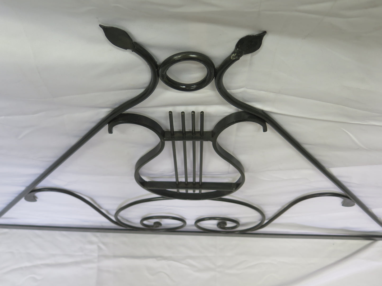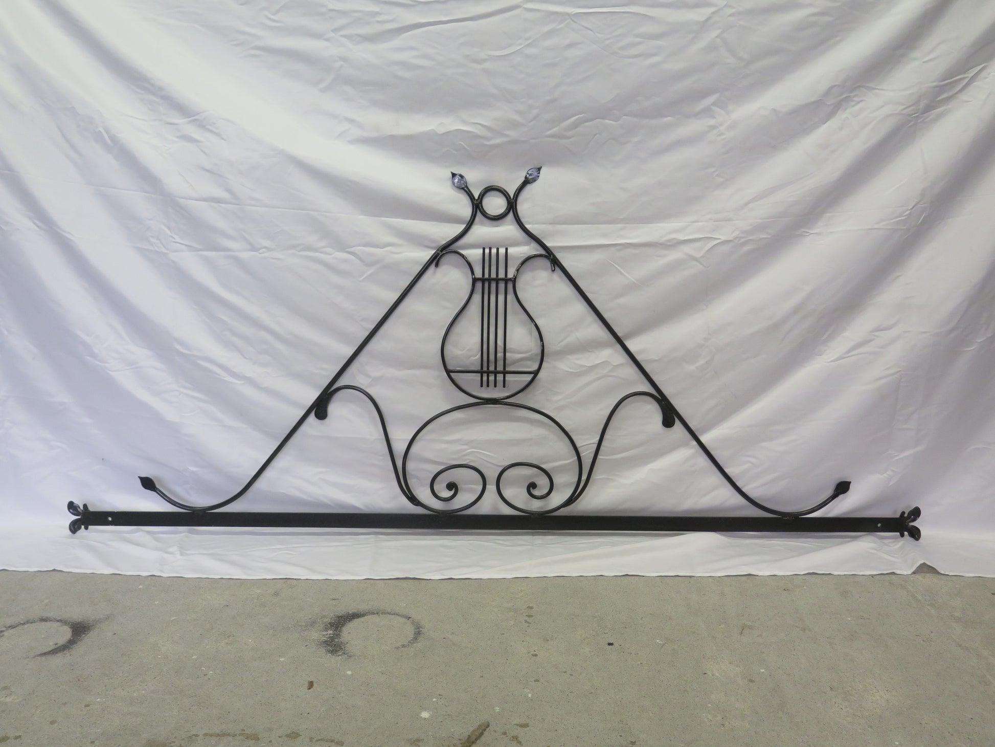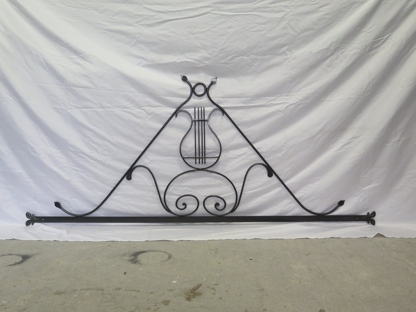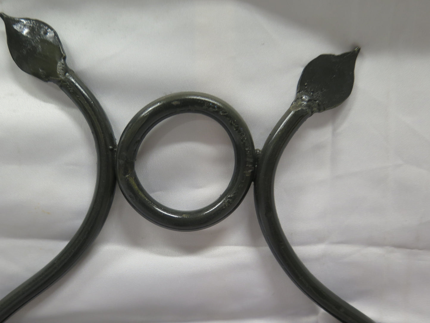 Testiera in ferro battuto forgiato a mano decorata con motivi a lira ed a volute.