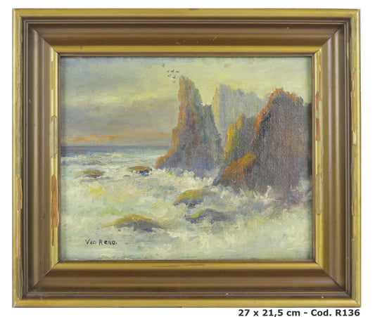 Quadro antico dipinto olio su tela paesaggio maina tempesta mare firmato Van Reno R136