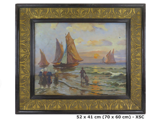 Quadro antico paesaggio mare con barche di pescatori e cornice di legno art decò originale nera e dorata XSC