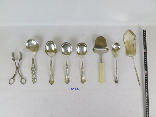 8 POSATE ANTICHE DA PORTATA CUCCHIAIO TAGLAFORMAGGIO PINZE PALETTA PER TORTA R146