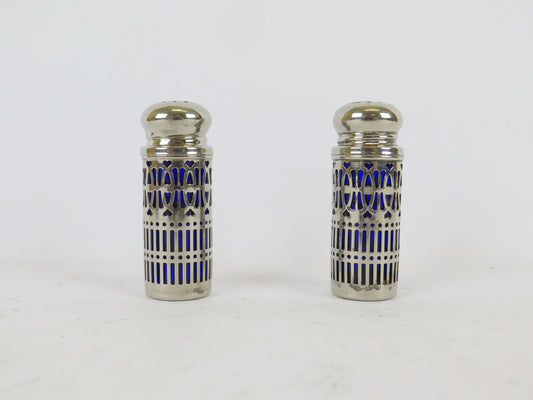 PORTASALE PORTAPEPE VINTAGE METALLO ARGENTATO VETRO BLU UK Pat No 1014132 R146
