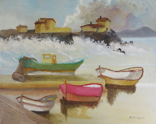 41x33 cm MARINA CON BARCHE ORMEGGIATE VECCHIO QUADRO DIPINTO OLIO SPAGNA MD13