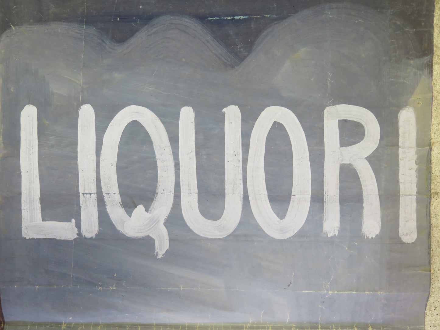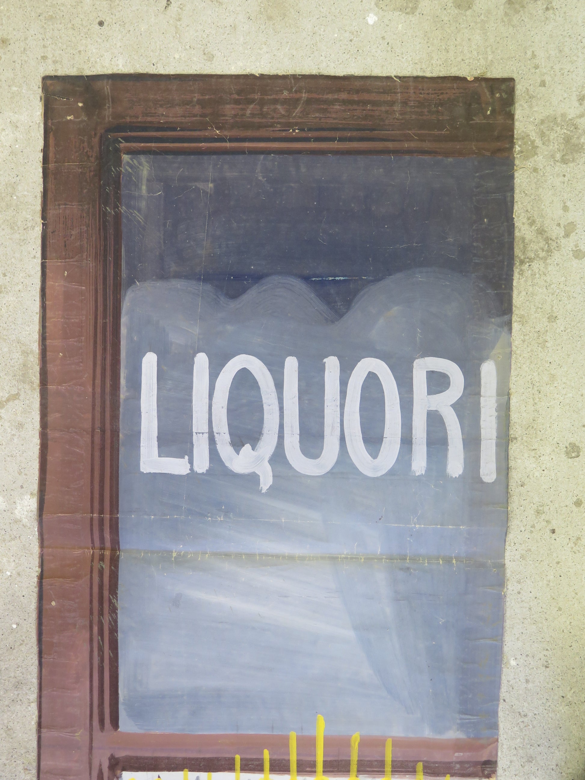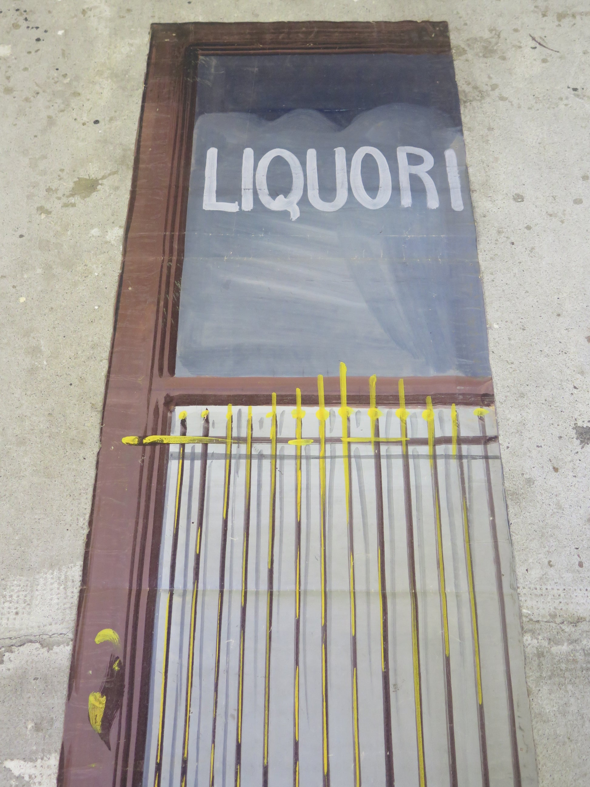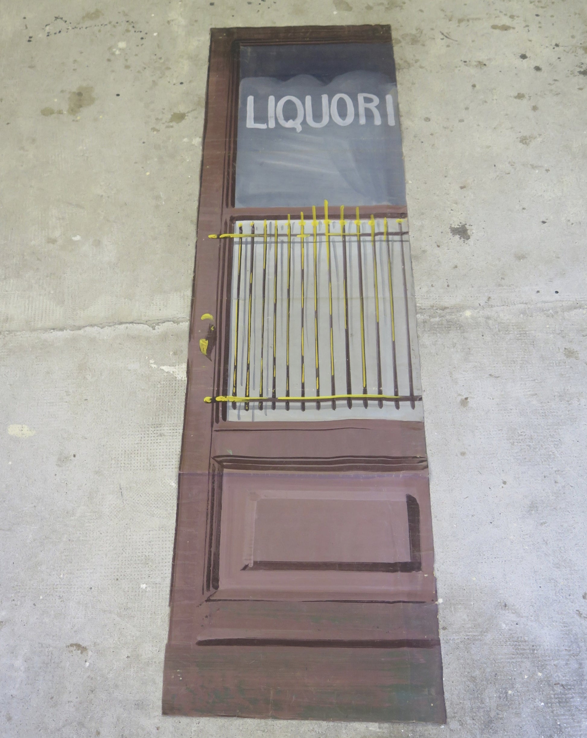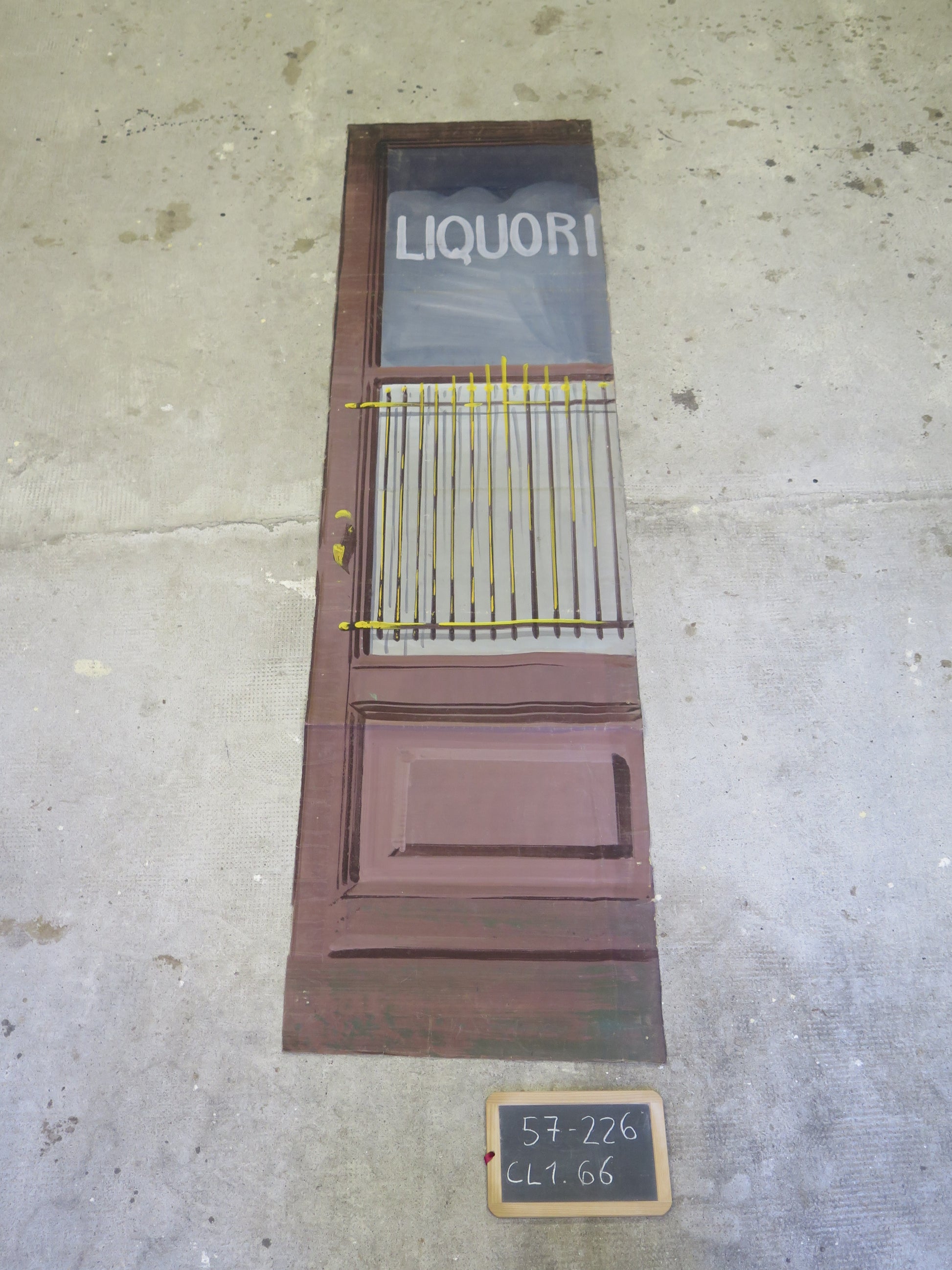 Fondale da teatro in carta dipinta a mano che raffigura la porta di un bar con la scritta "Liquori".