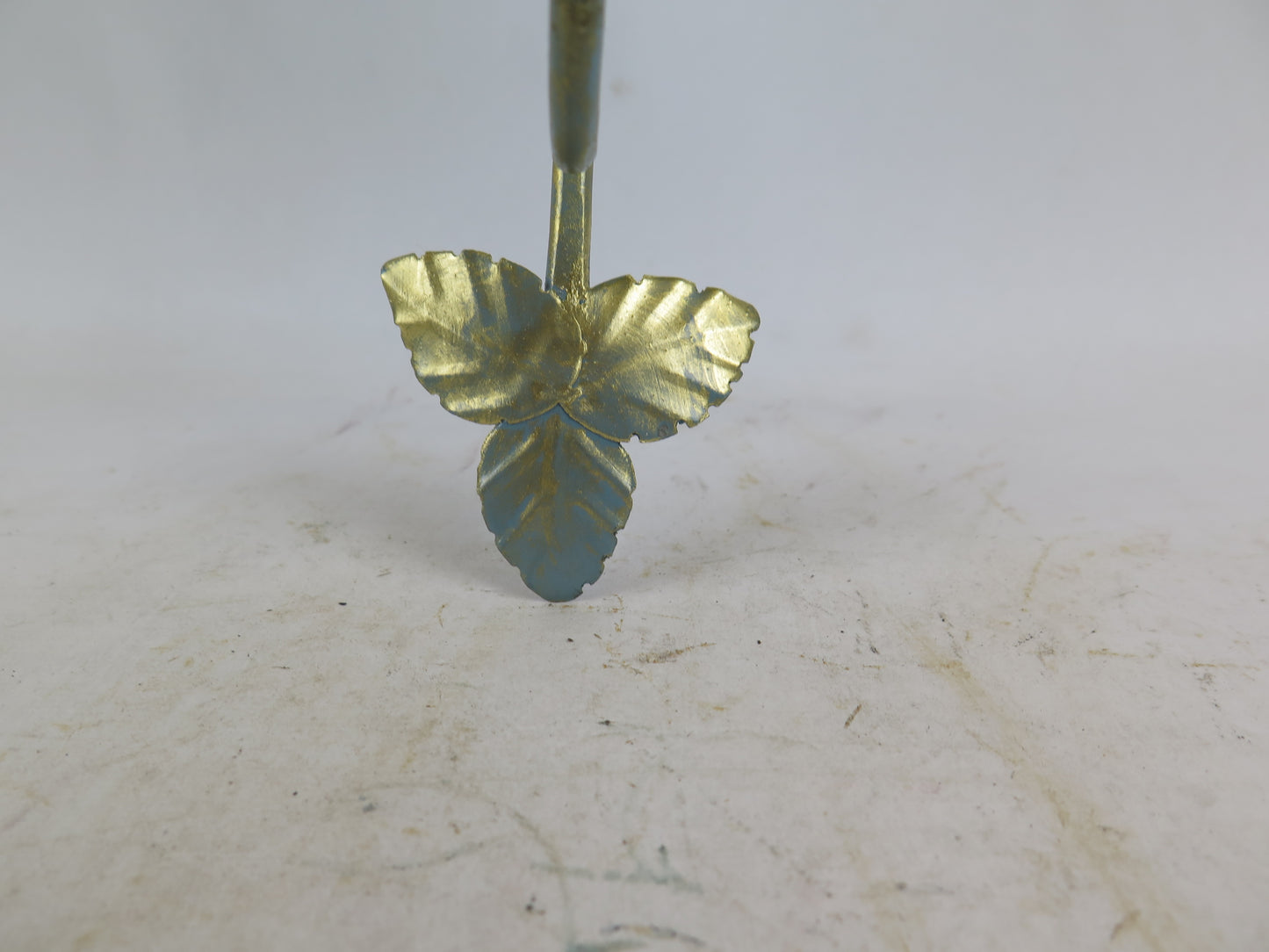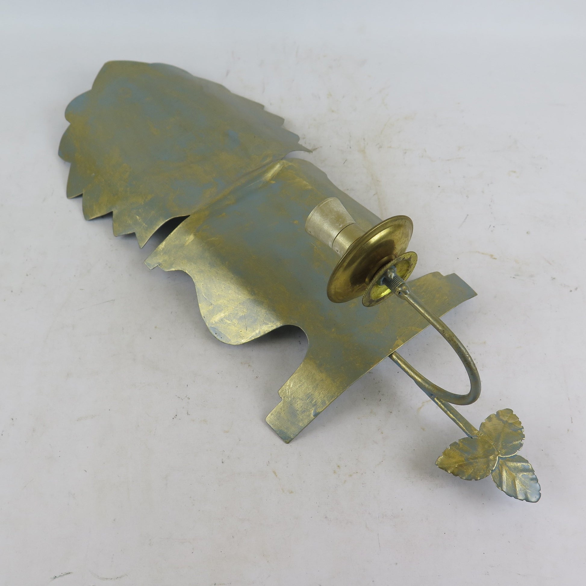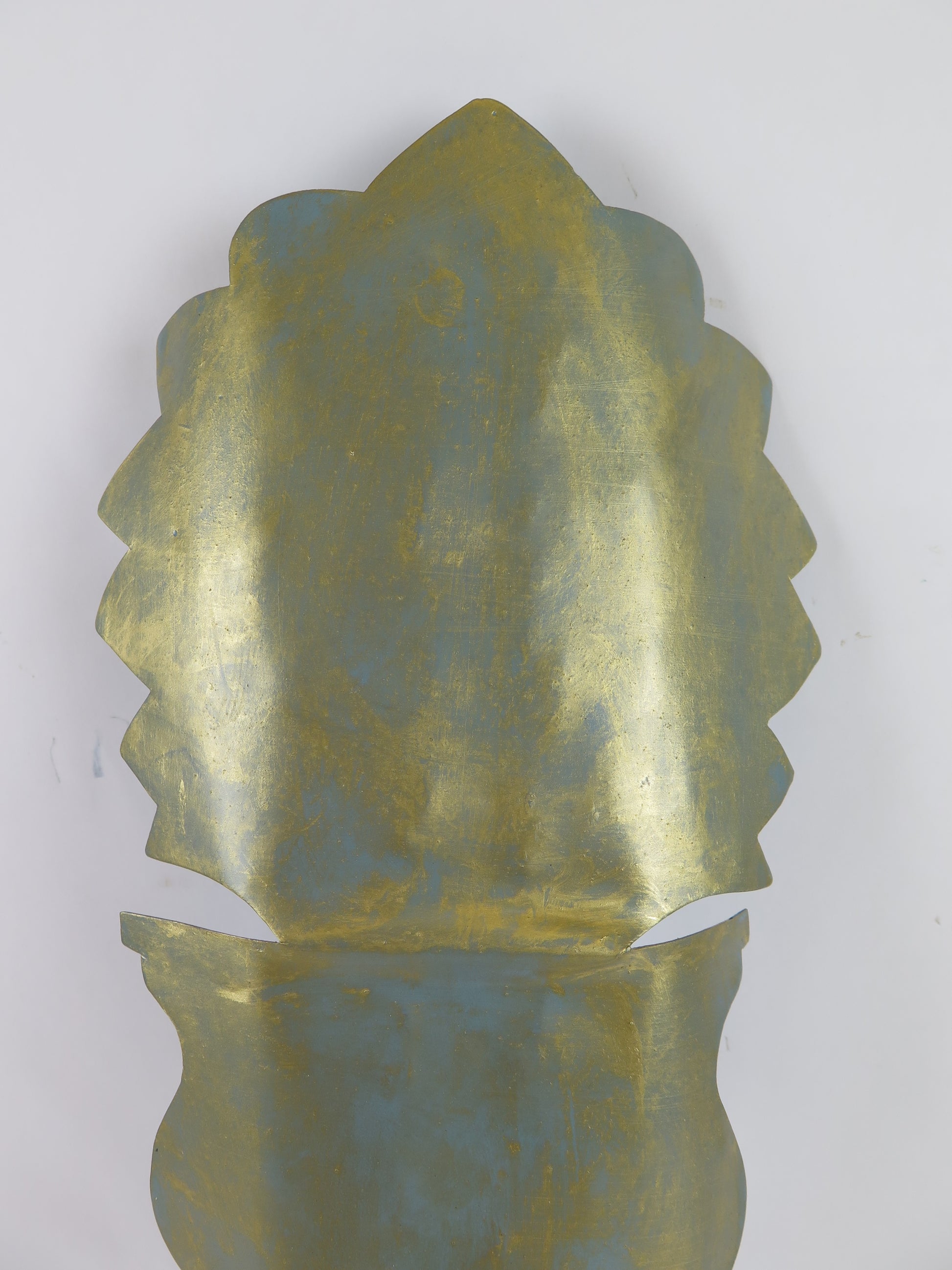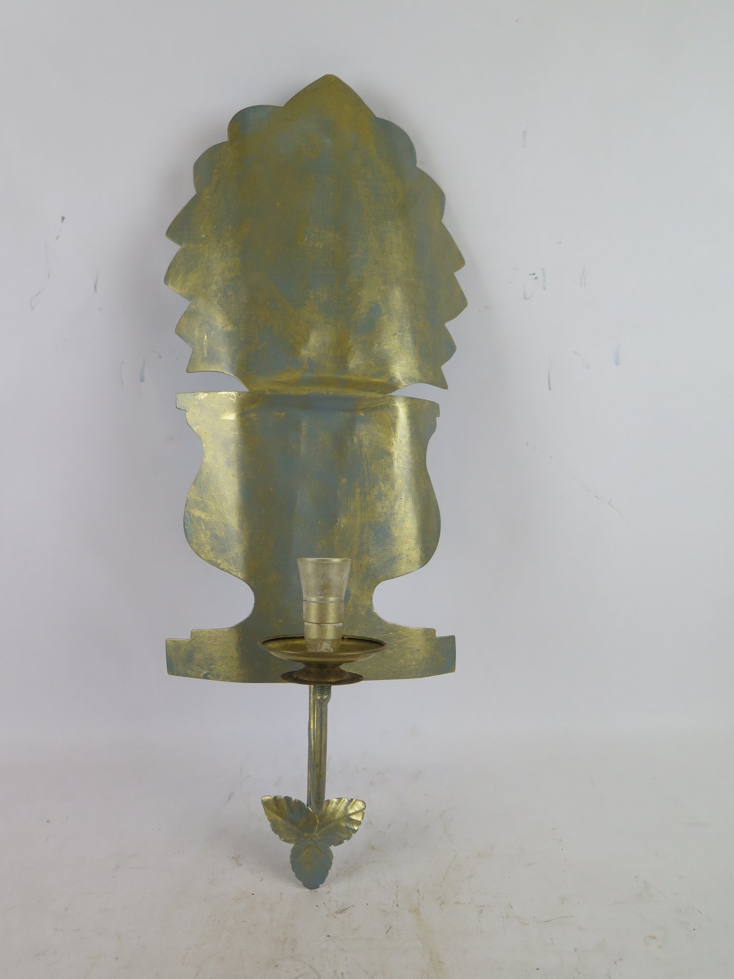 Elegante applique a due fiamme in ferro battuto dorato costituita da un medaglione centrale da cui si dirama un braccio ricurvo decorato con una foglia nella parte inferiore.