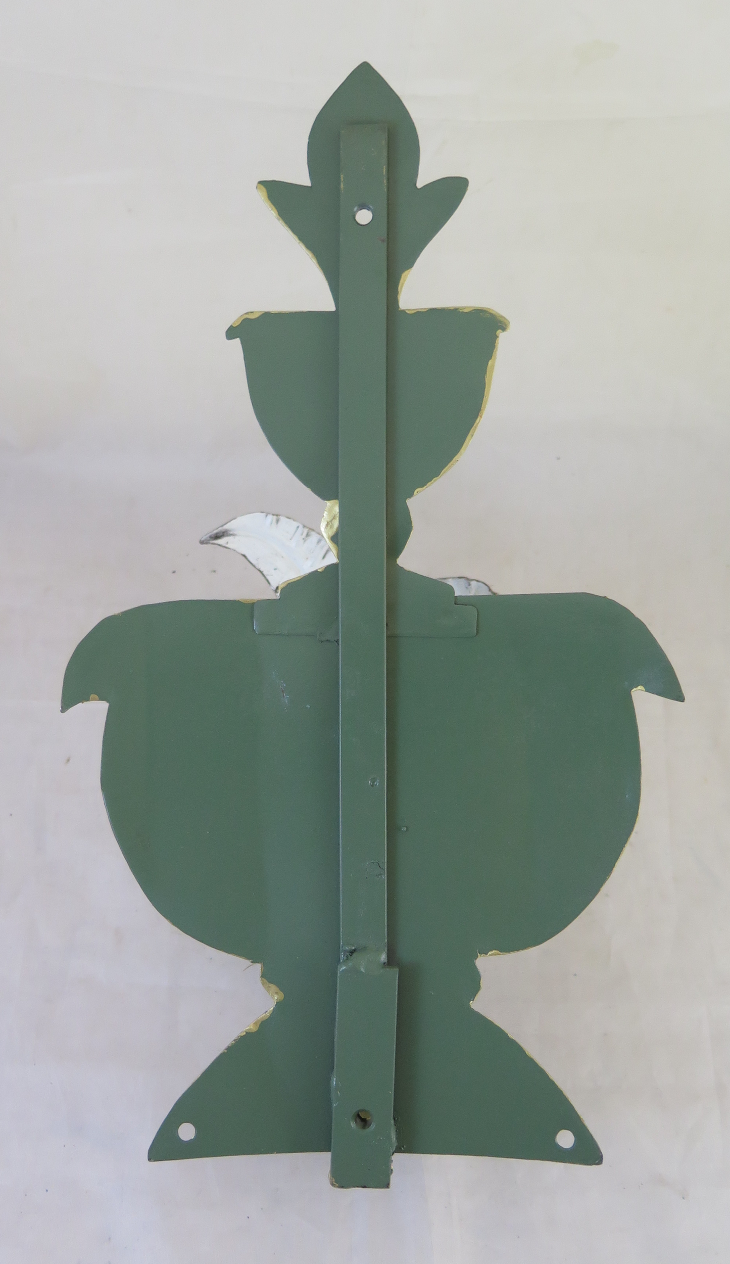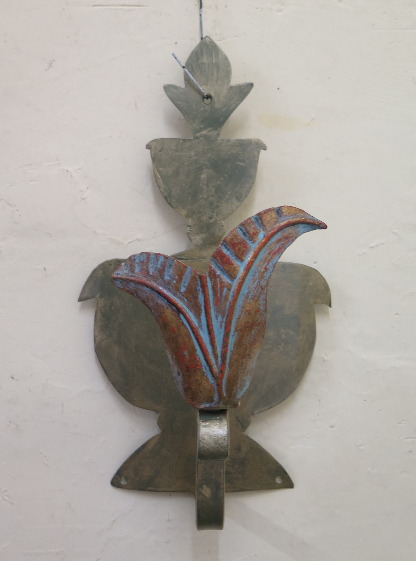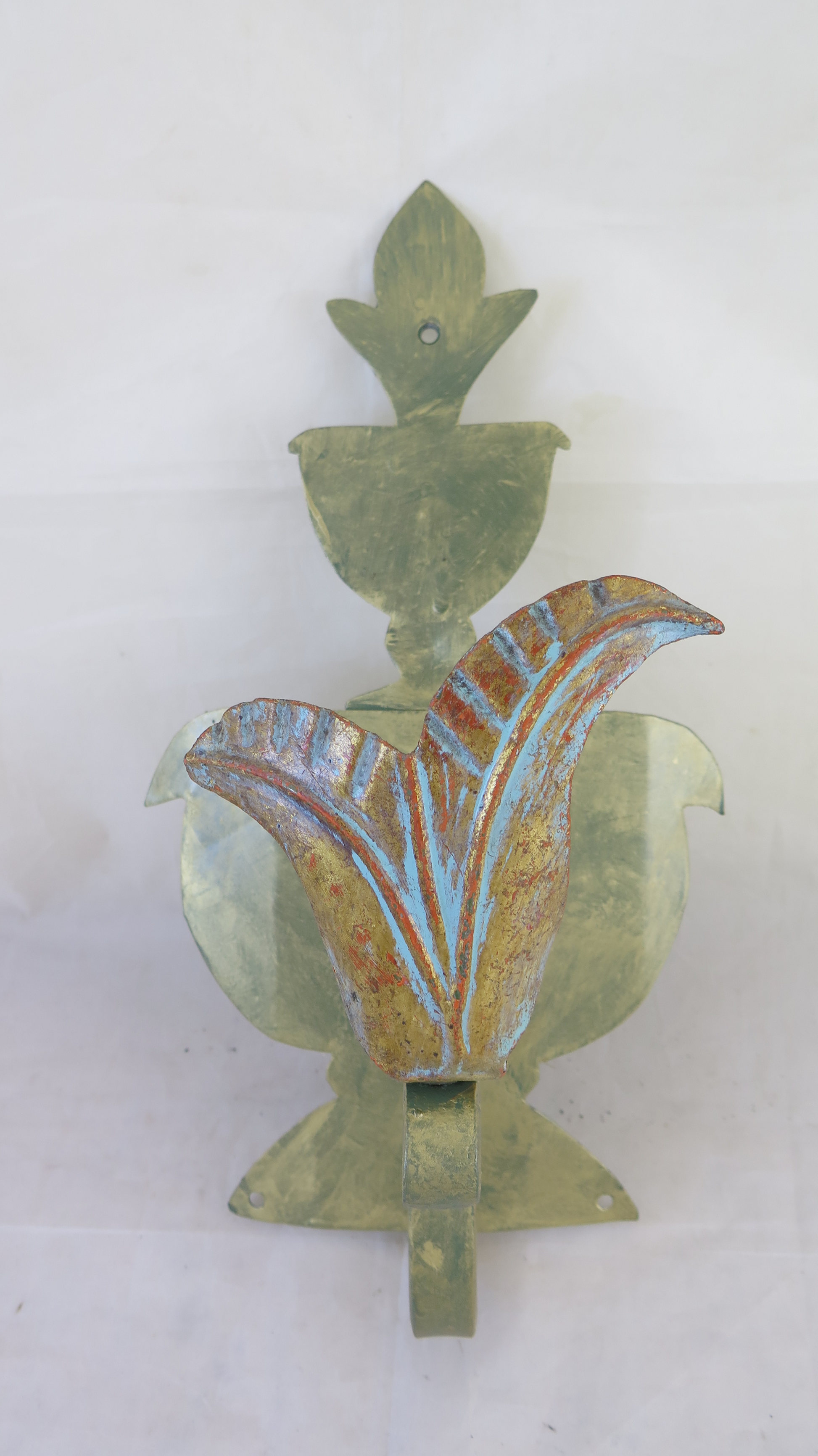 Elegante applique in ferro battuto ad una fiamma decorata con motivi vegetali ed un fregio a forma di coppa nella parte posteriore.