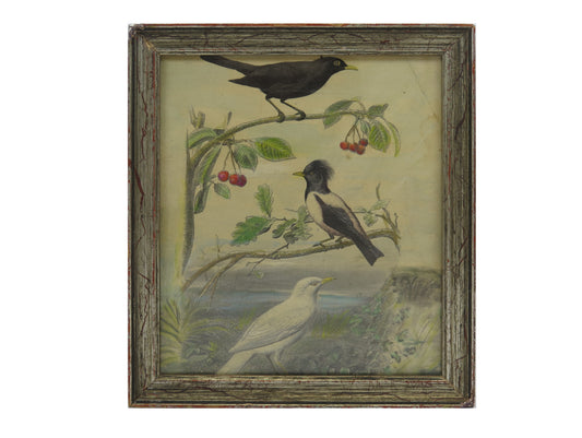 Stampa antica tema naturalistico uccelli animali merlo ciliegie incisione bt4