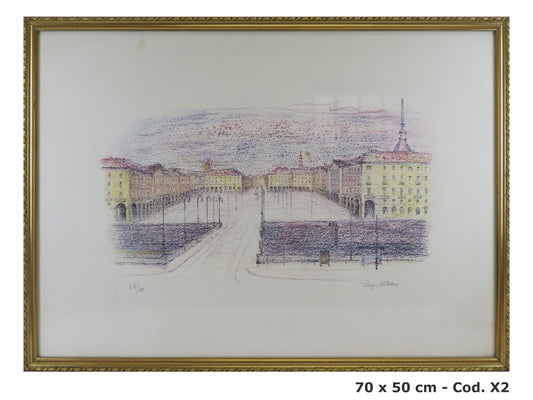 Luigi Delleani (Torino 1918-1997) litografia originale firmata e numerata veduta di Piazza Vittorio Veneto a Torino stampa a colori VAS