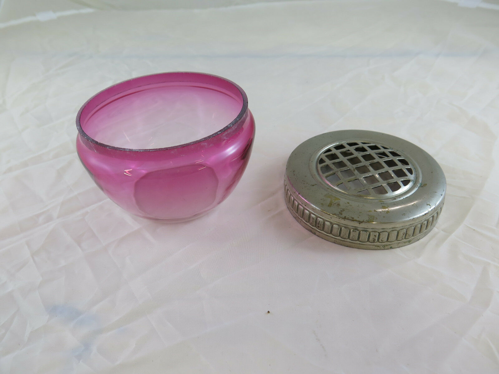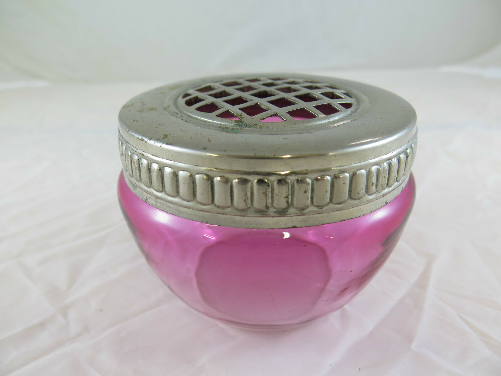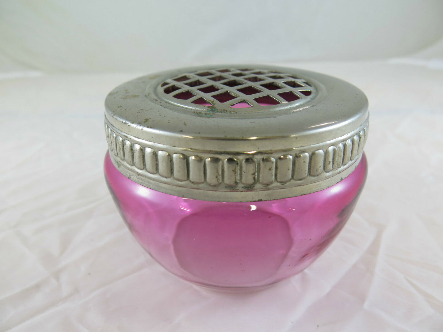 Raffinata coppa di epoca Liberty per potpourry o incenso in fine vetro rosa con coperchio in metallo.