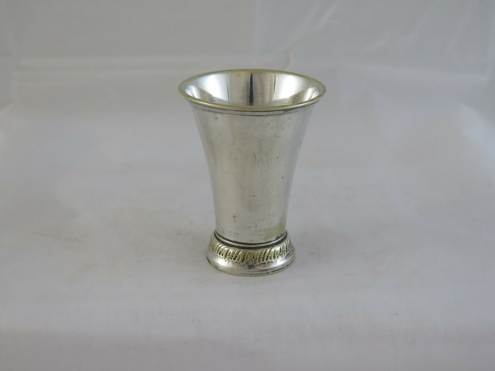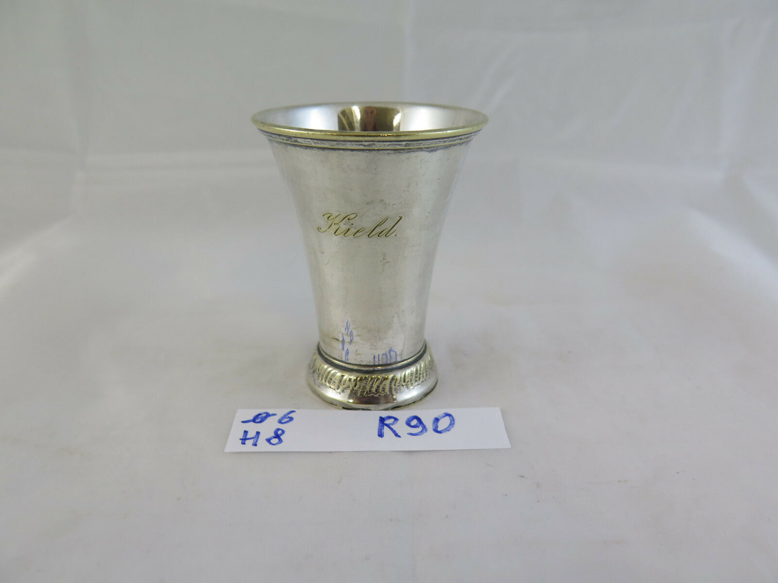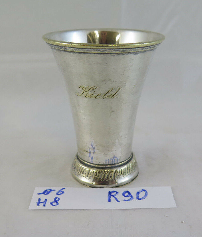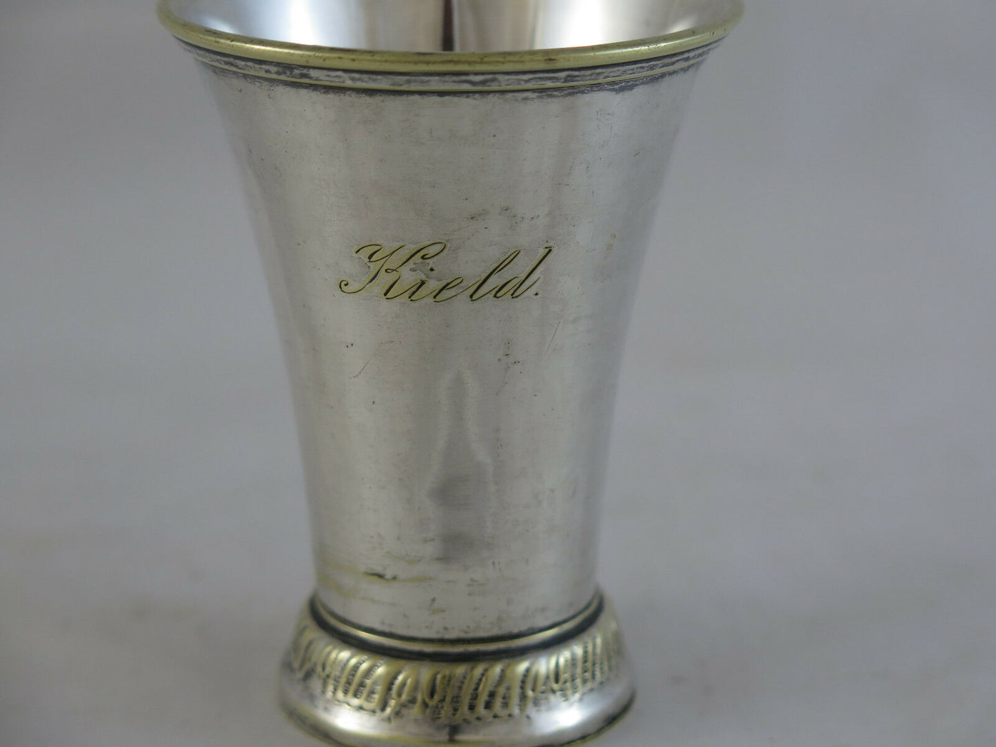 Antico bicchiere in silverplate finemente cesellato con nome inciso "Kield".