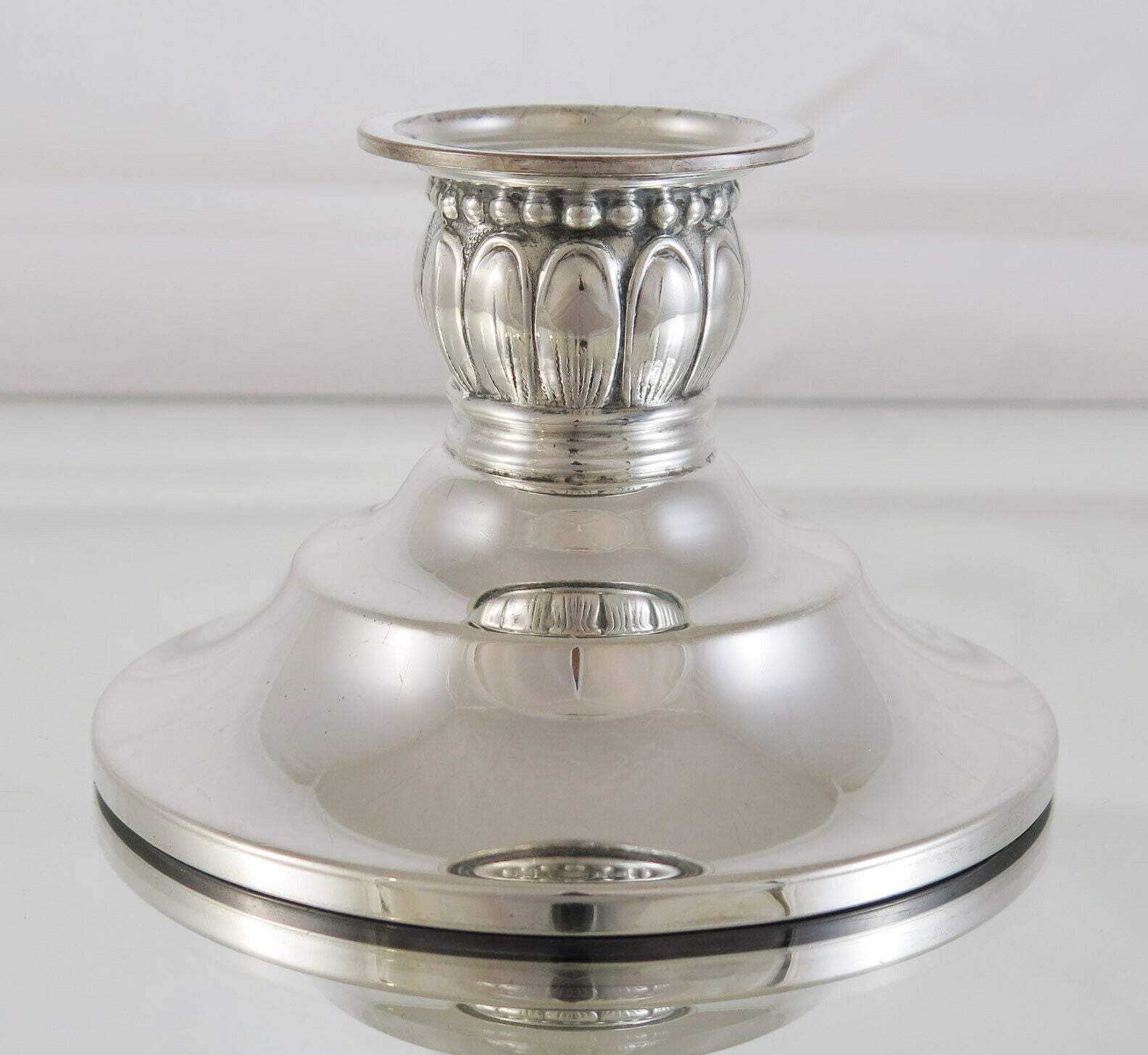 Elegante bugia in metallo argentato finemente cesellato sul fusto con base circolare.