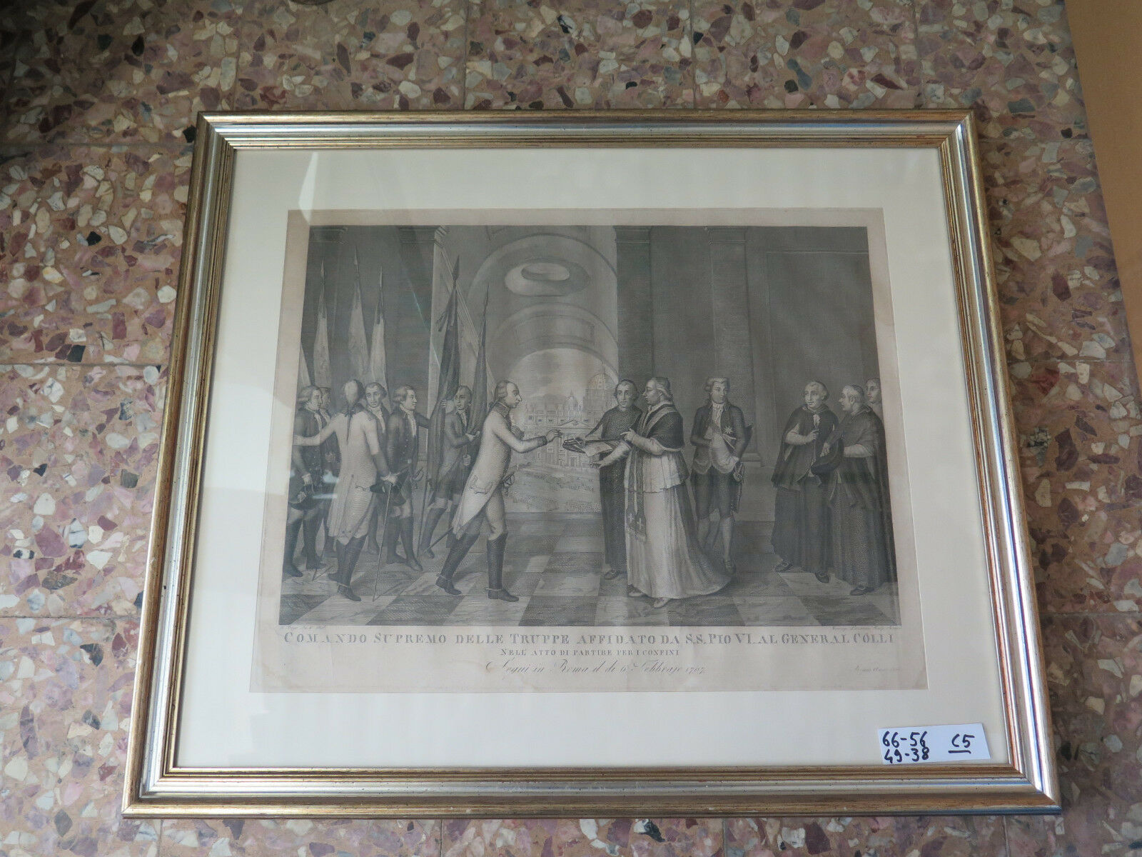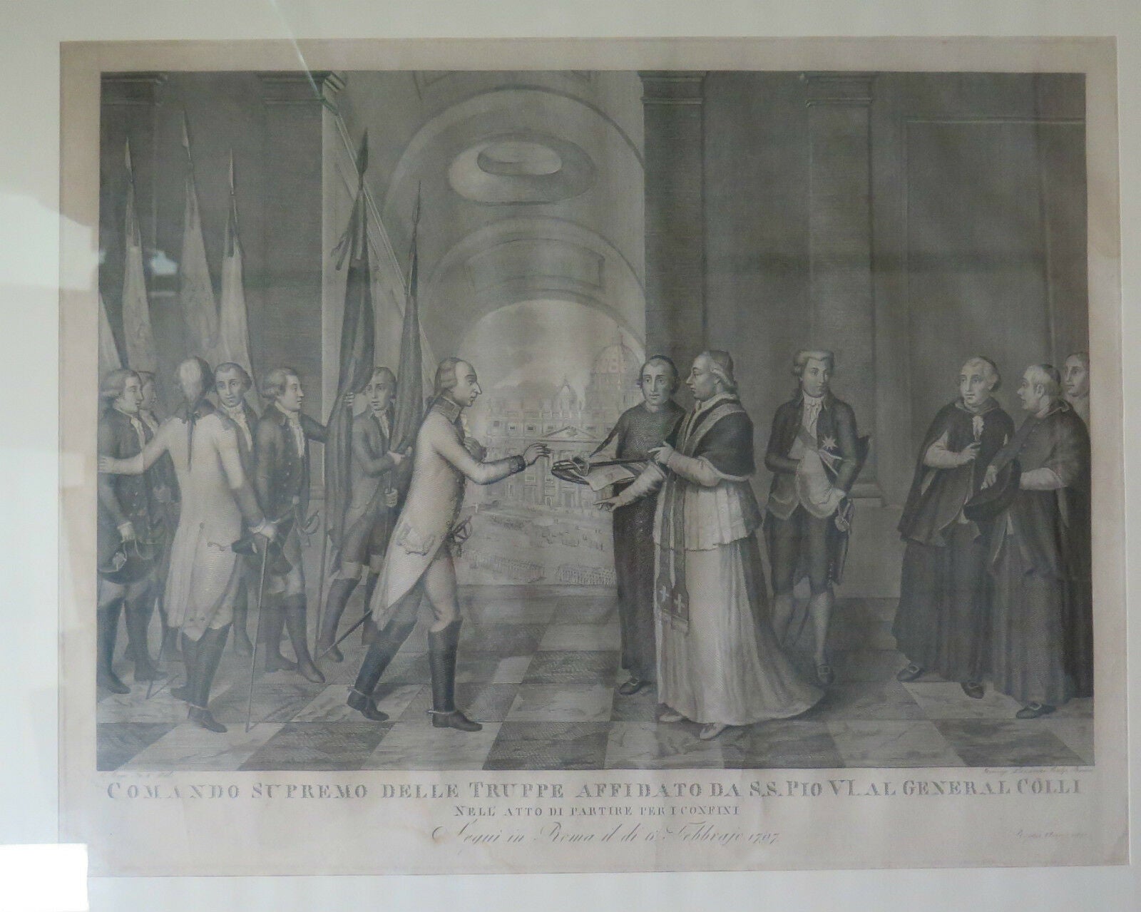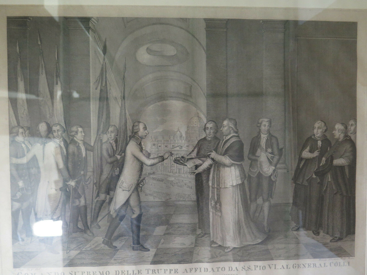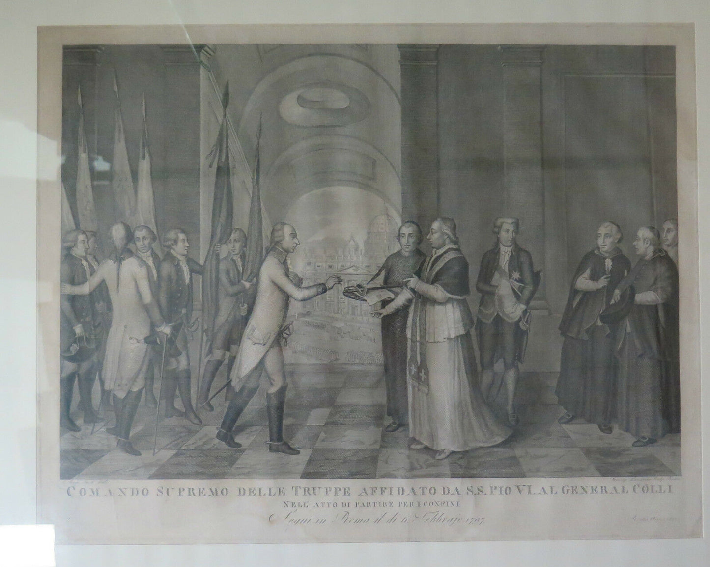 Fine incisione dal titolo: "Comando Supremo delle Truppe Affidato da S.S. Pio Vi al General Colli" pubblicata nel 1801 e presente negli archivi dei più importanti musei del mondo tra cui il British Museum