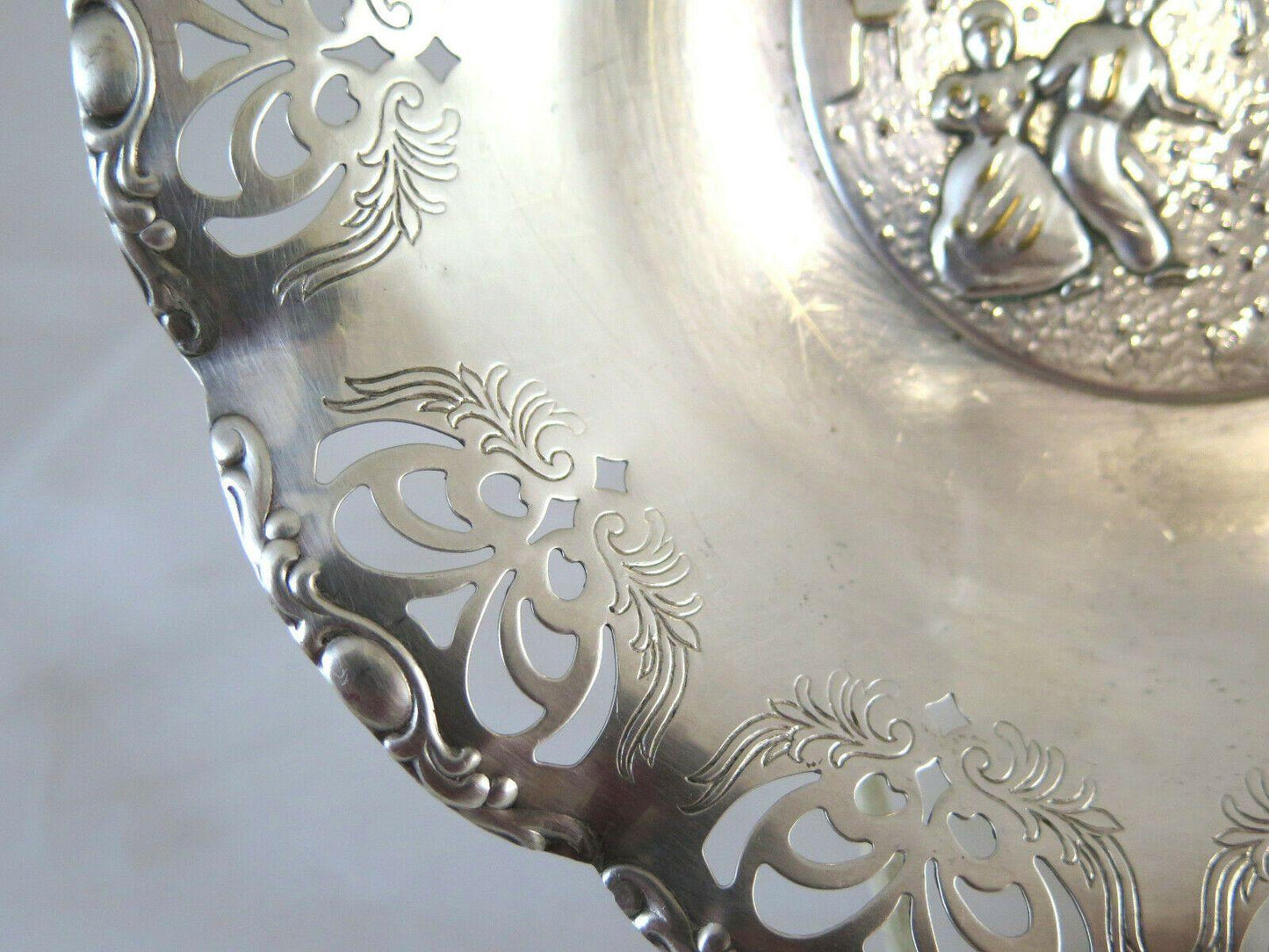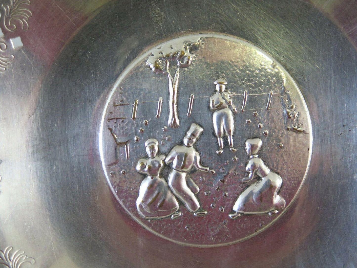 Vecchio centrotavola in metallo argentato lavorato a sbalzo con motivi a volute e personaggi.