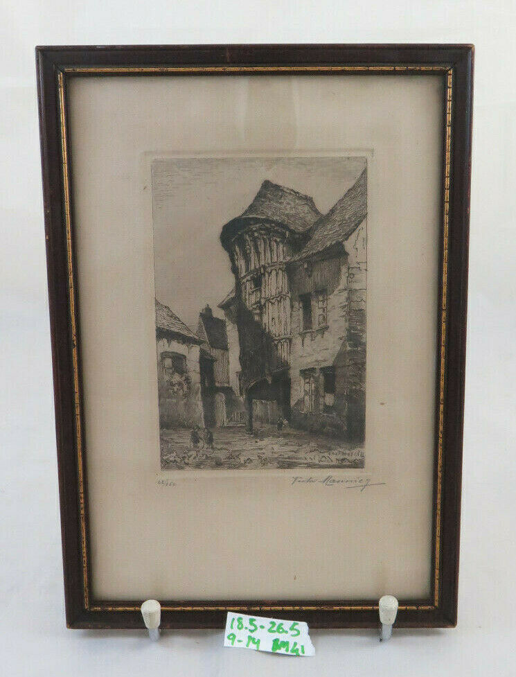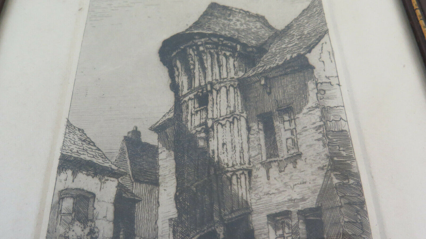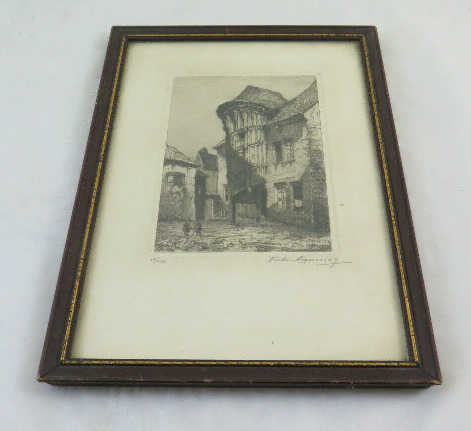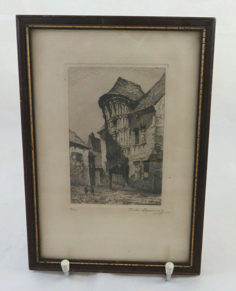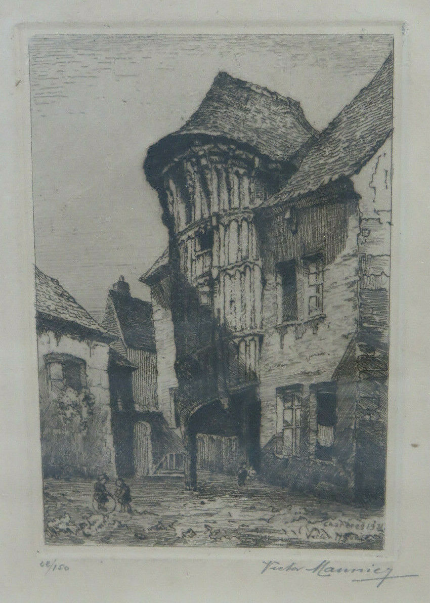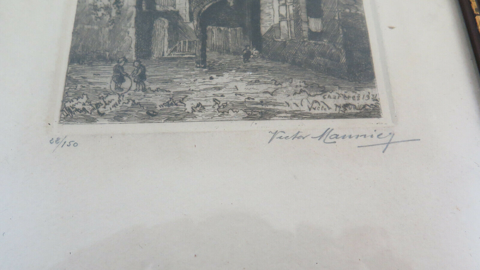 Antica acquaforte che raffigura uno scorcio di Chartres in Francia, firmata da Victor Maunier 22/150 e datata 1931.