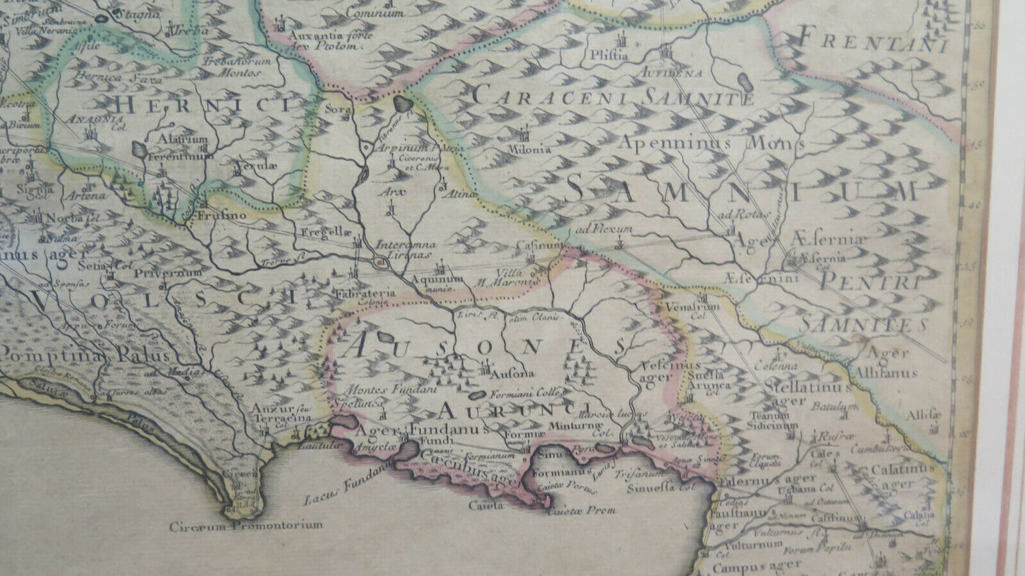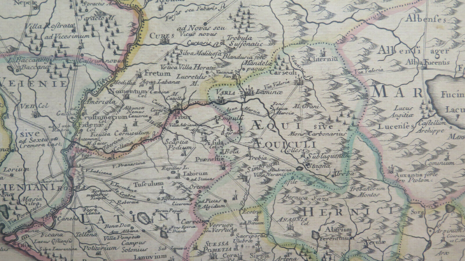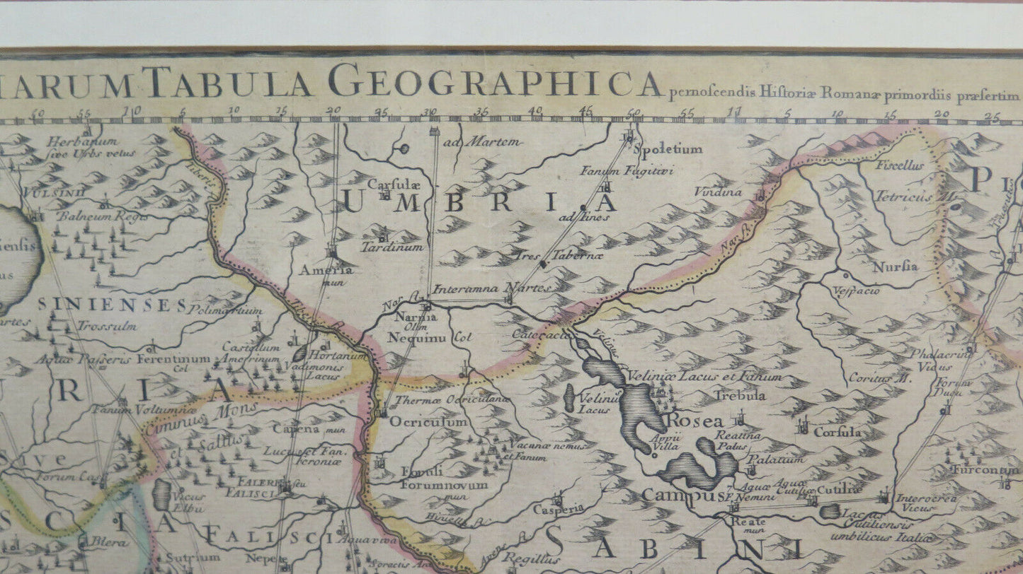 Comprende l'Italia centrale entro i limiti: nord, Spoletium; sud, Pompeii. Orografia prospettica a monticelli. Sono tracciate le vie romane coi loro nomi. Sono distinte le selve e le zone paludose; sono indicati gli acquedotti. I principali abitati sono rappresentati schematicamente in prospettiva. La toponomastica è in latino. Le divisioni territoriali sono a colori. In basso a sinistra trovasi una cartina di Roma ("Urbis Septicollis"), con note, e scala grafica in passi romani. Le longitudini sono riferite all'isola del Ferro. Le scale grafiche sono calcolate in miglia romane e in stadia di Grecia.