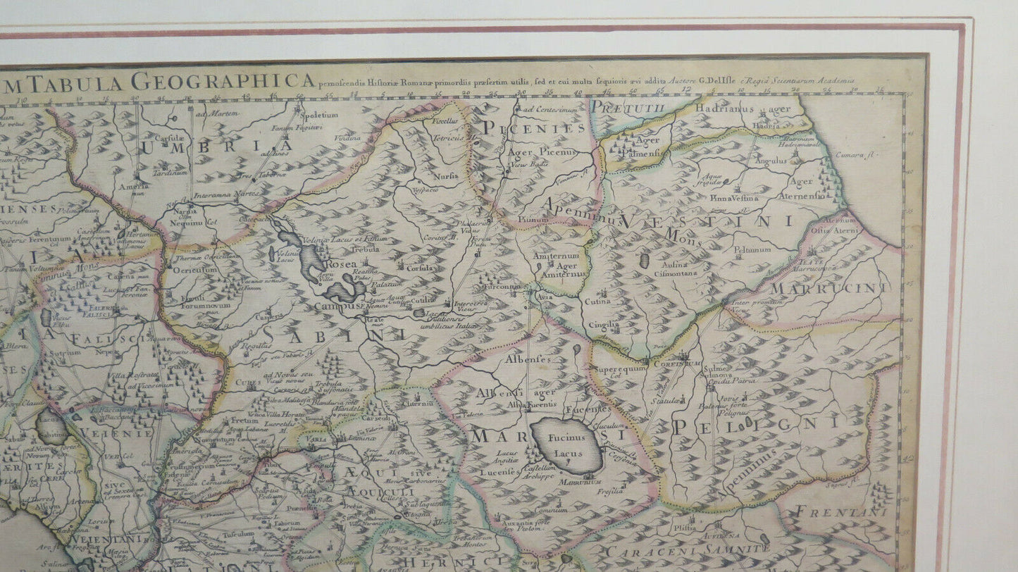 Fine historical map of central Italy with Tuscany, centred on Rome, in the south Pompeii, in top the island of Giglio and the town Orbetello. Lower left inset plan of ancient Rome. Engraved by Des Rosiers. Prepared by Del'Isle and published by Dezauche, as successors to De l'Isle & Buache. Guillaume de l' Isle, appointed Royal Geographer in 1718, was the leading French cartographer of the early 18th Century, and certainly among the most influential.