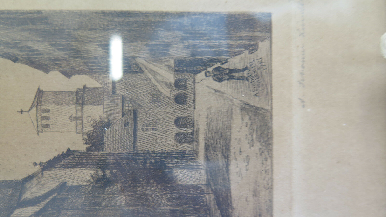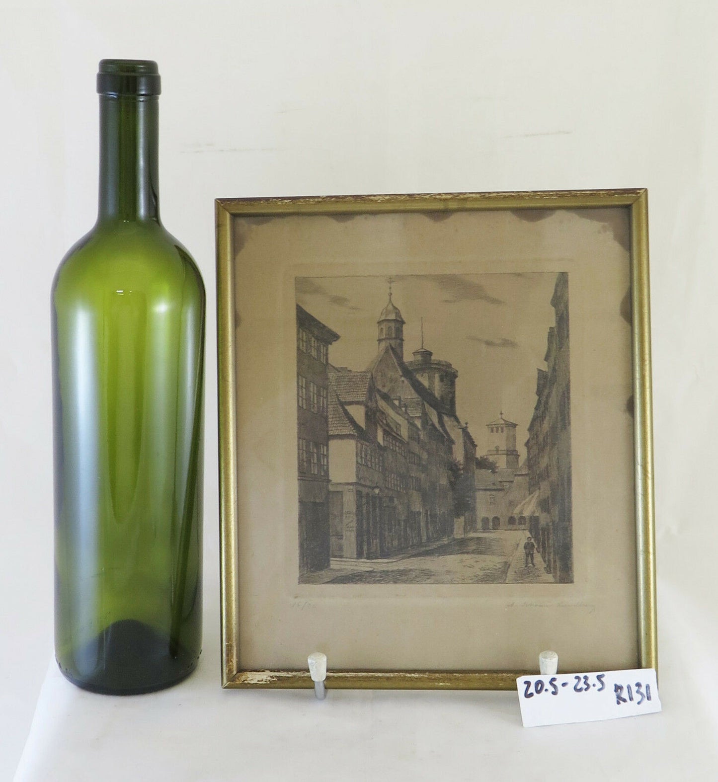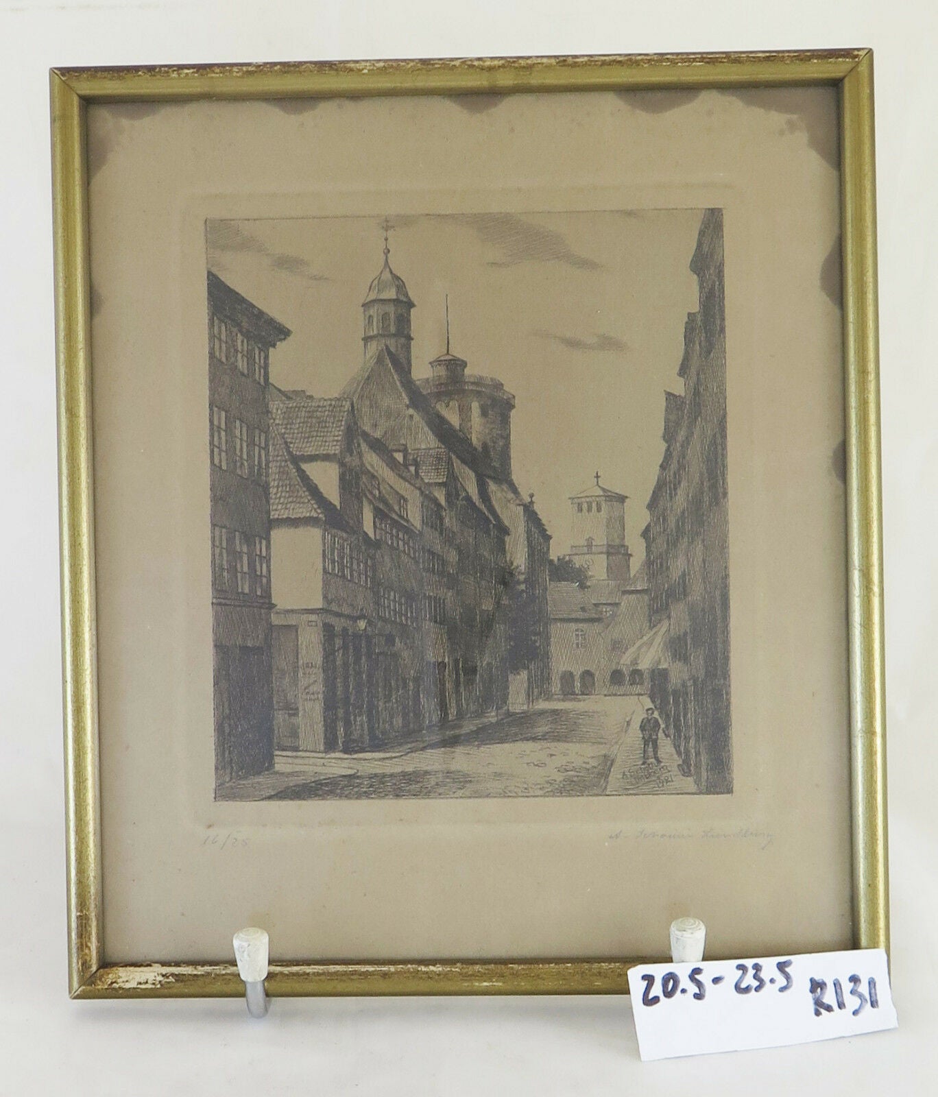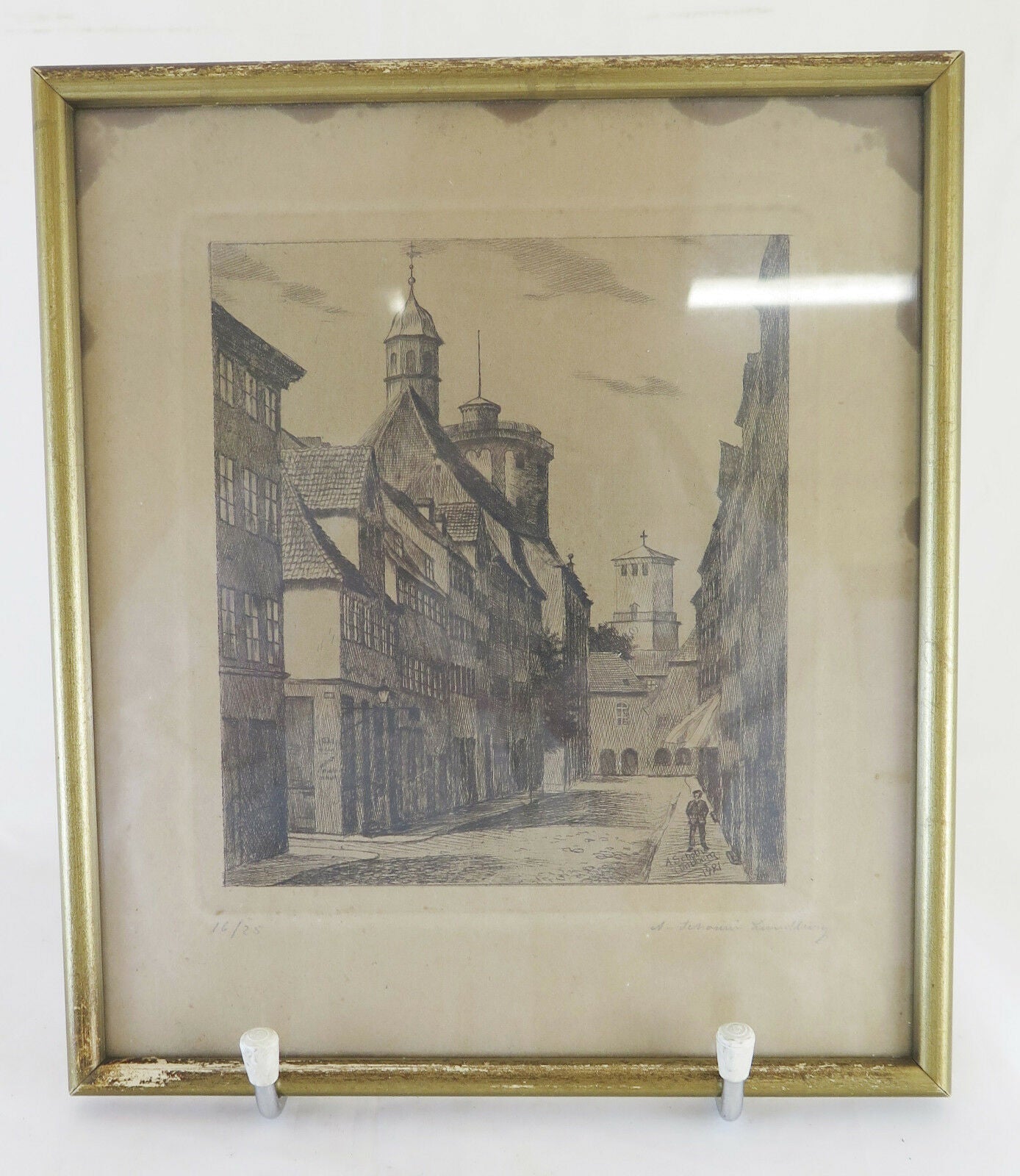 Deliziosa incisione su carta firmata A. Lundberg 1921 che raffigura uno scorcio cittadino, completa di cornice in legno coeva.