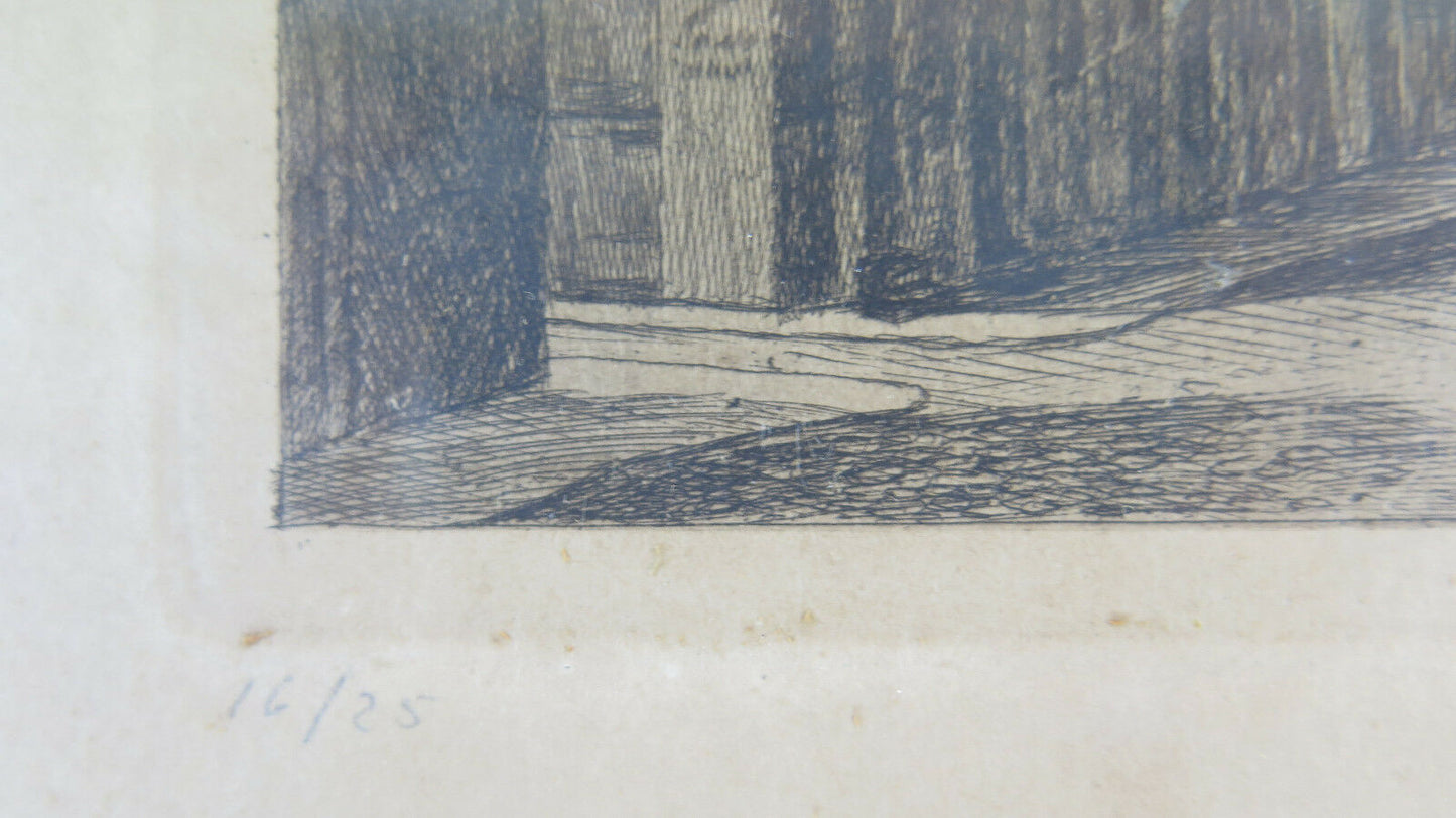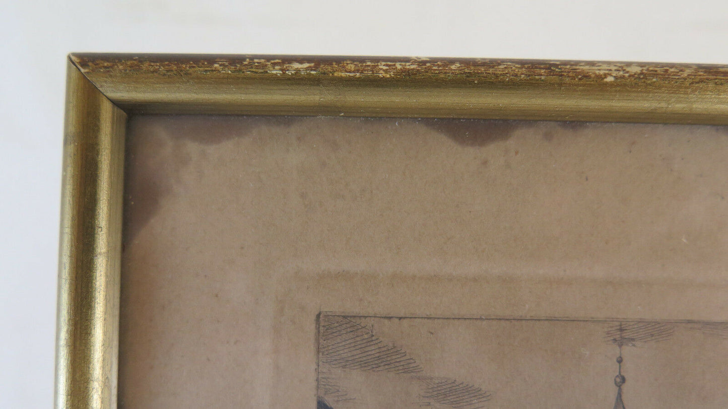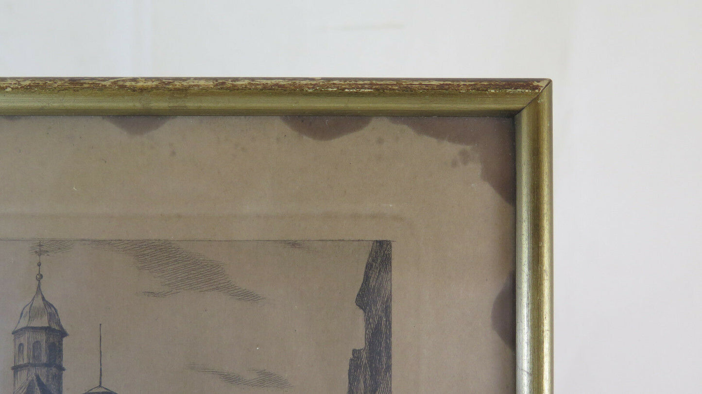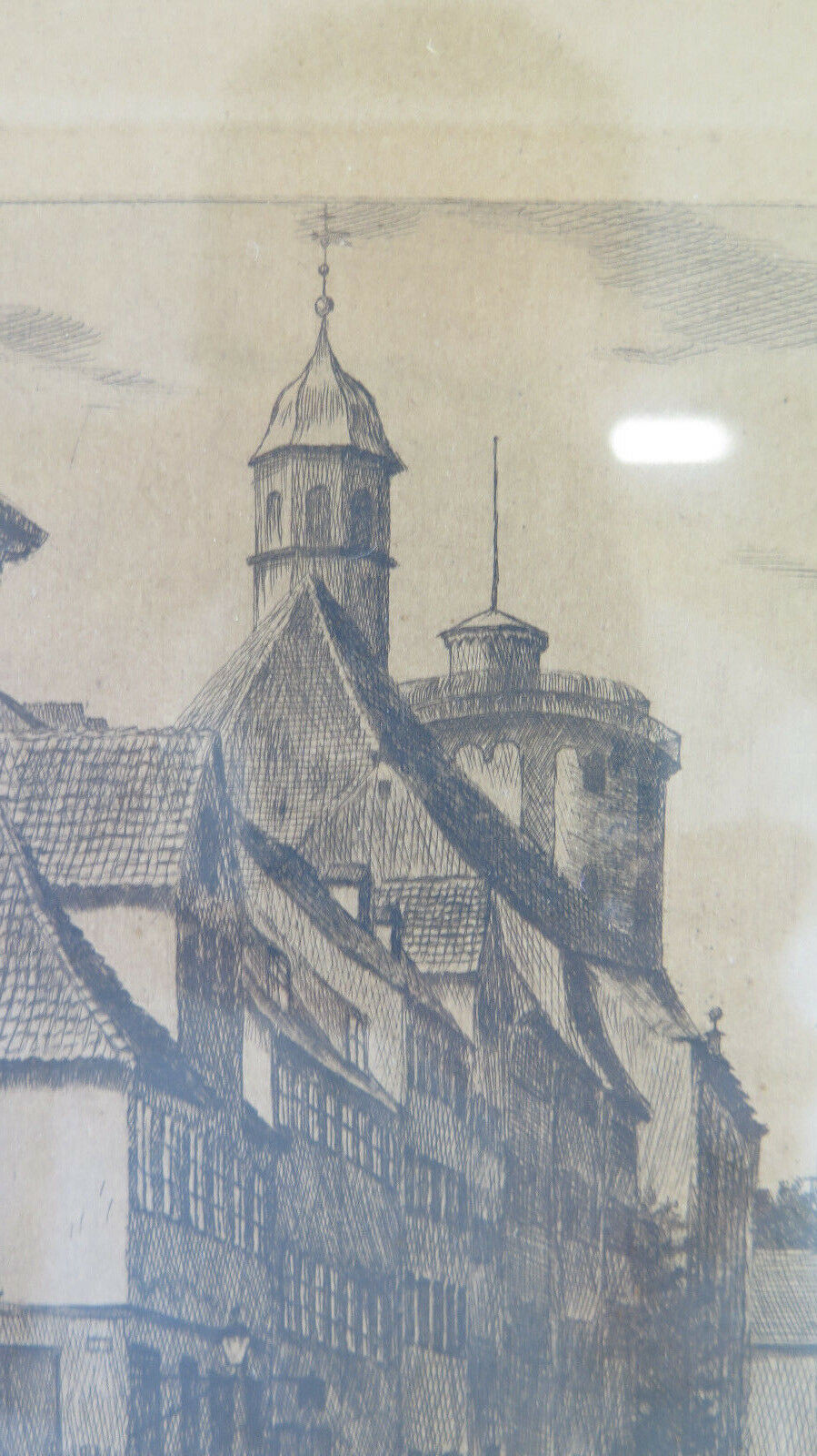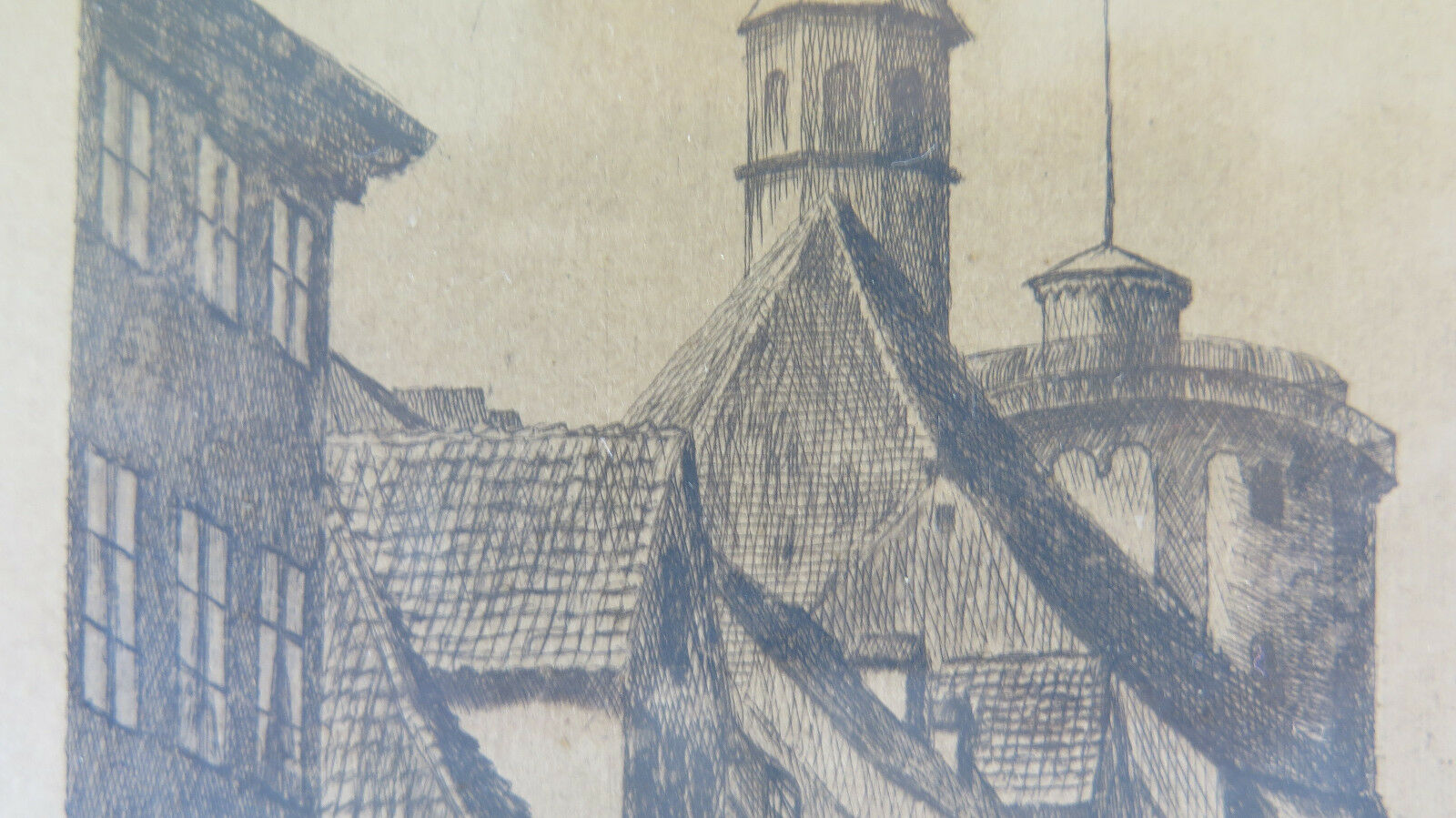 Deliziosa incisione su carta firmata A. Lundberg 1921 che raffigura uno scorcio cittadino, completa di cornice in legno coeva.
