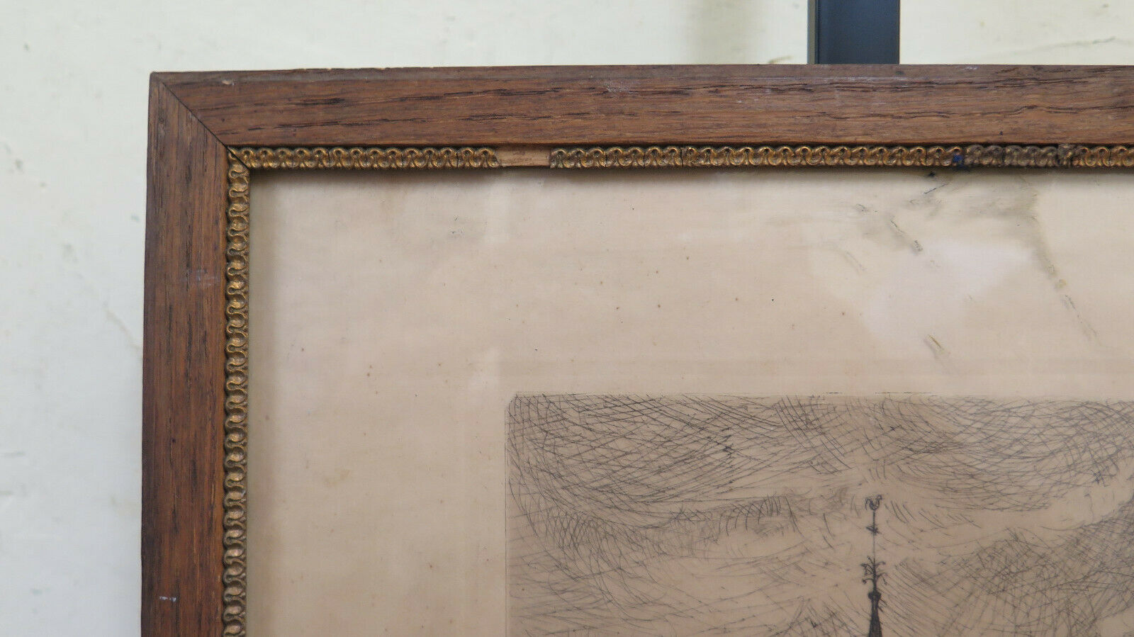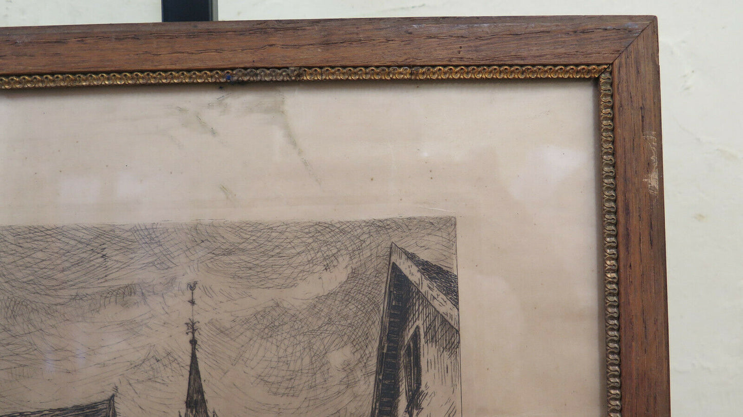 Antica incisione che raffigura una cittadina francese, firmata e con cornice coeva di legno.