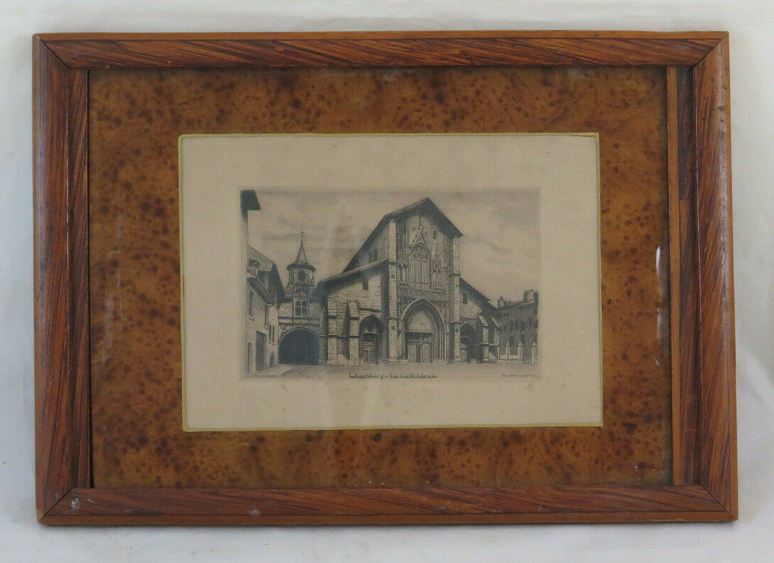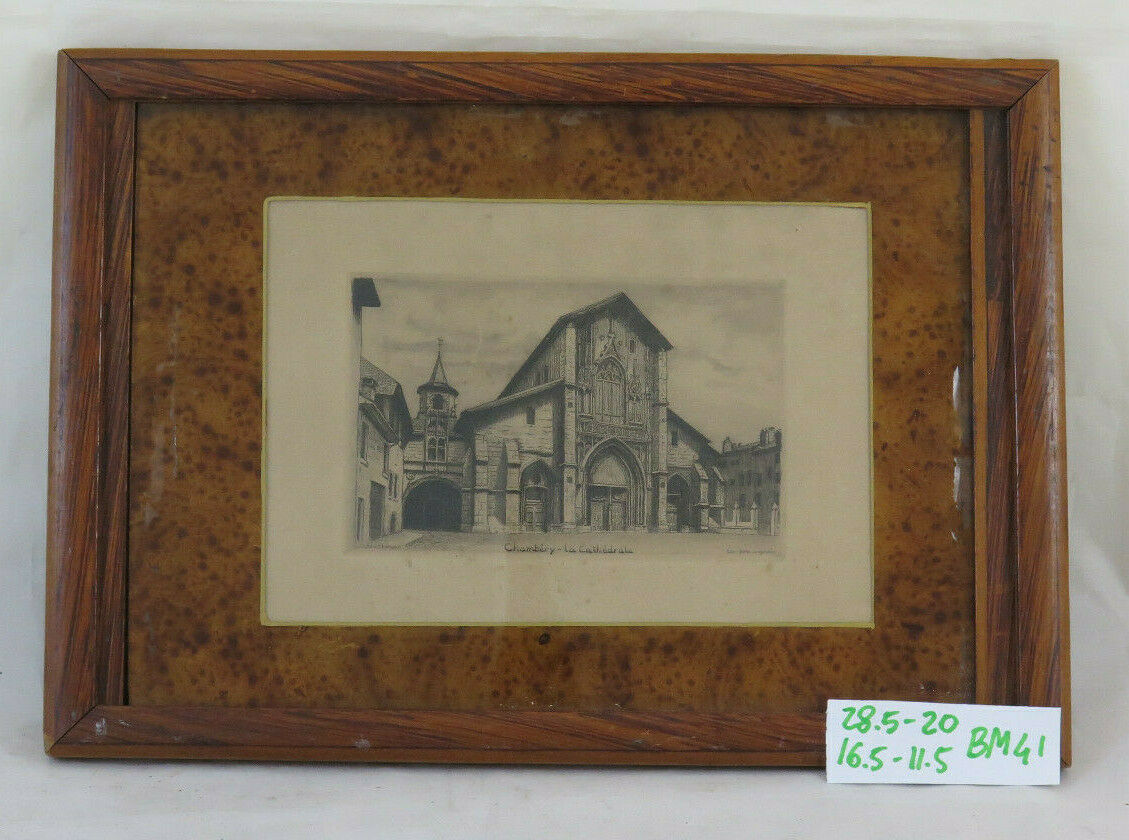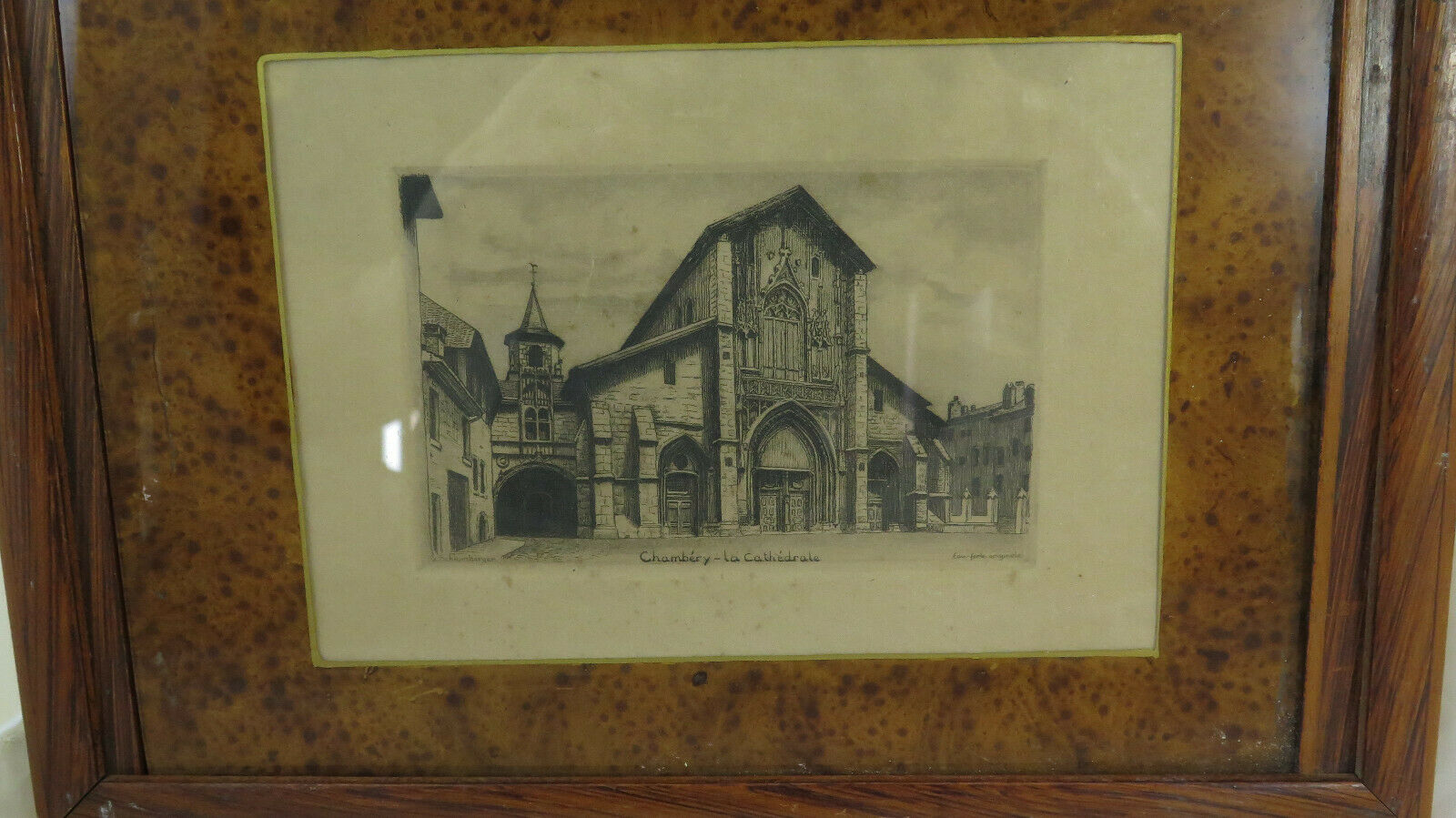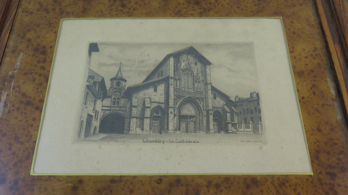Antica acquaforte che raffigura la cattedrale di Chambery completa di cornice in legno.