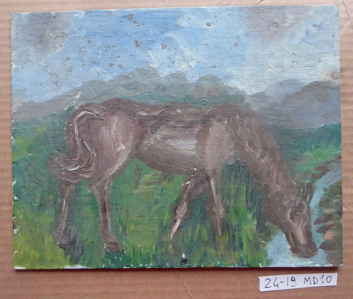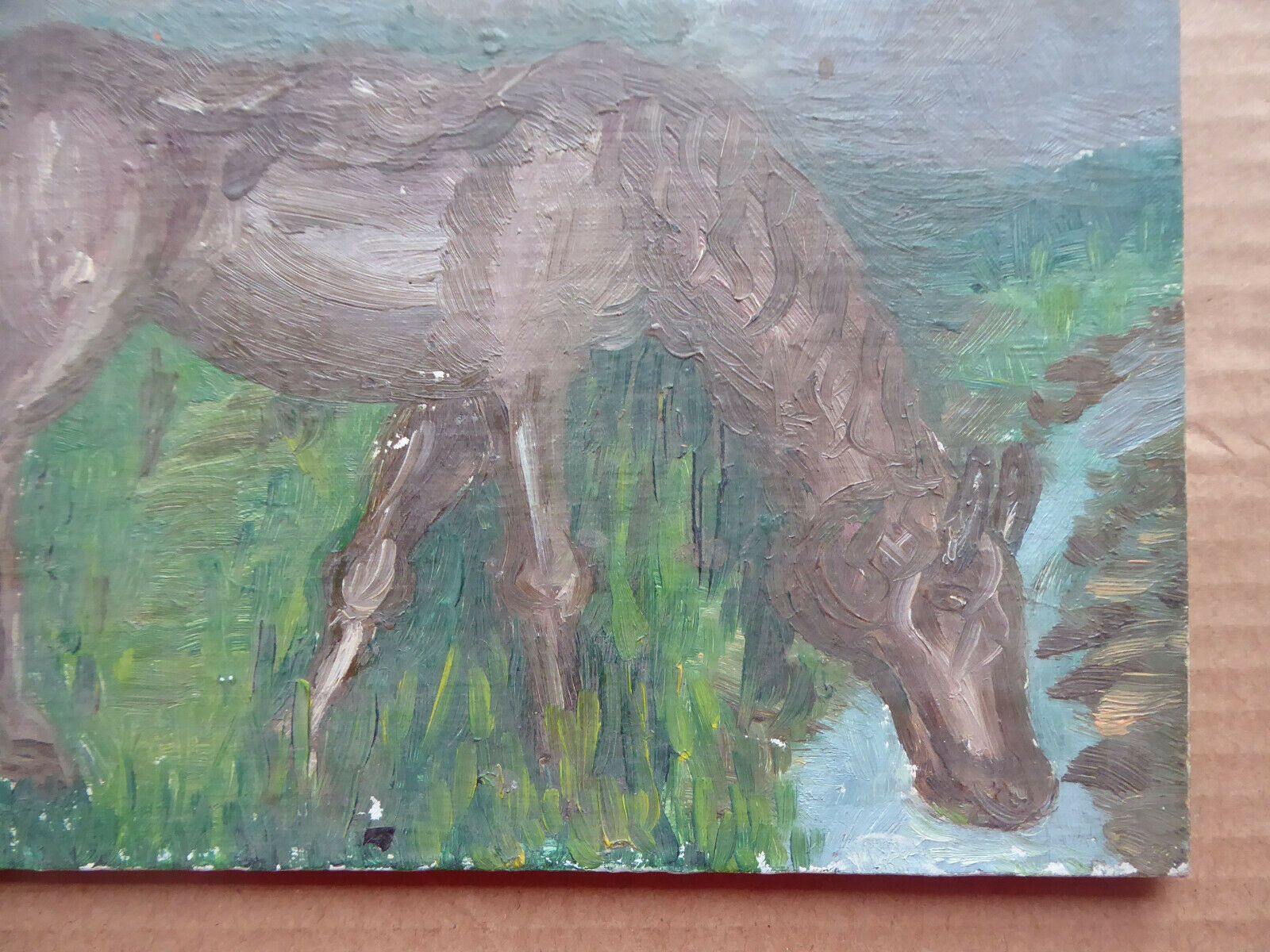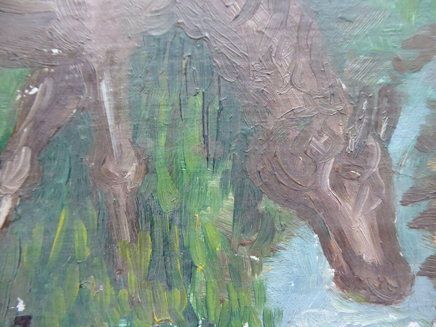 Delizioso dipinto di piccole dimensioni che raffigura un cavallo intento a bere da un ruscello.