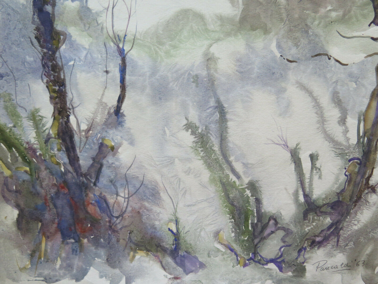 Supporto e tecnica: acquerello su cartoncino. Realizzato con la "tecnica del gelo" per ottenere l'effetto ghiaccio in alcuni aree della superficie pittorica, tale tecnica consisteva nel porre al freddo vero e proprio il dipinto ancora fresco per poi lavorarlo successivamente. Questo effetto è stato creato dal pittore Pancaldi e ricorre in molti suoi lavori soprattutto nella fase della maturità. Autore: Gaetano Pancaldi (Piumazzo di Castelfranco Emilia, 1922-2014).