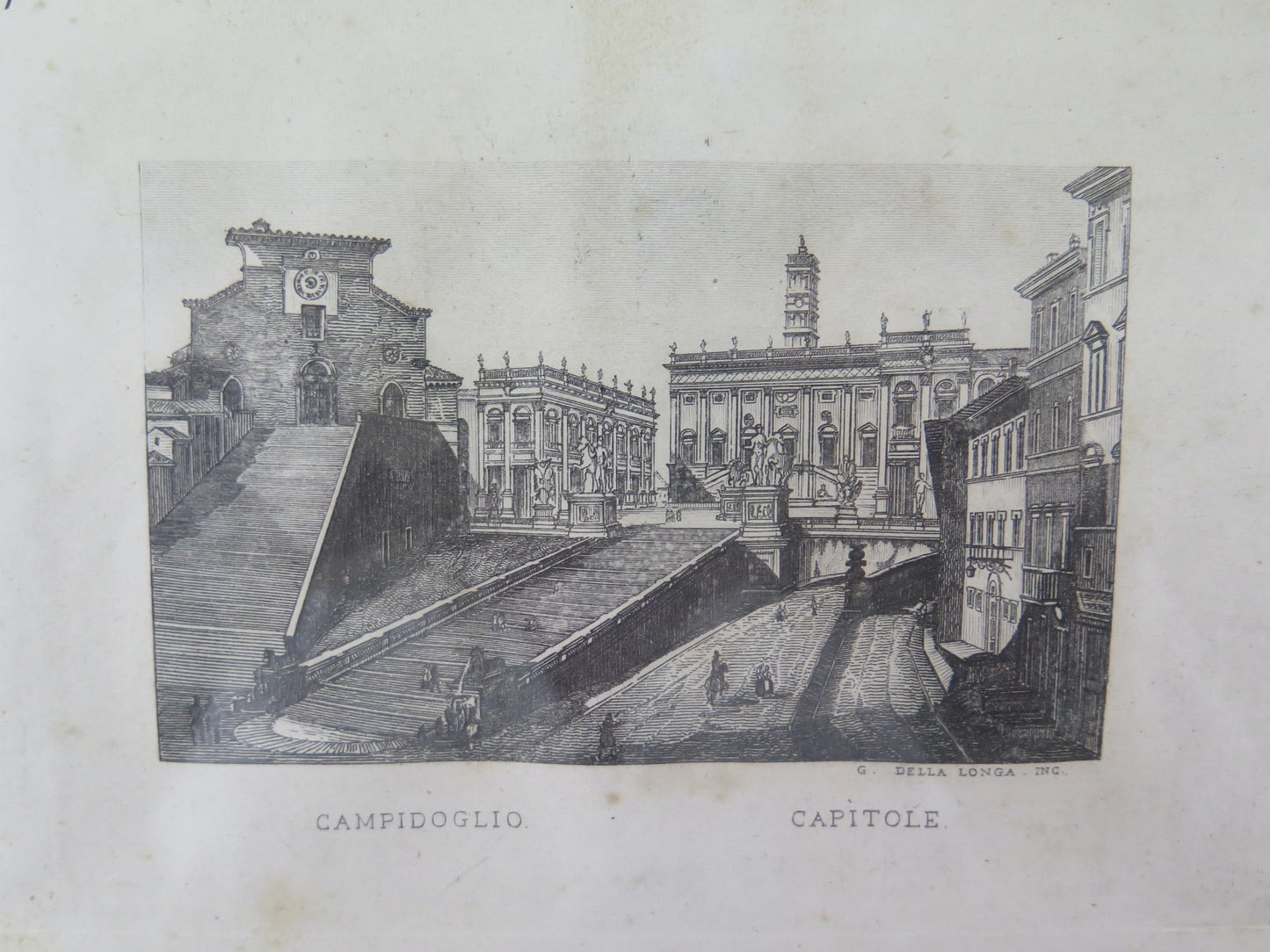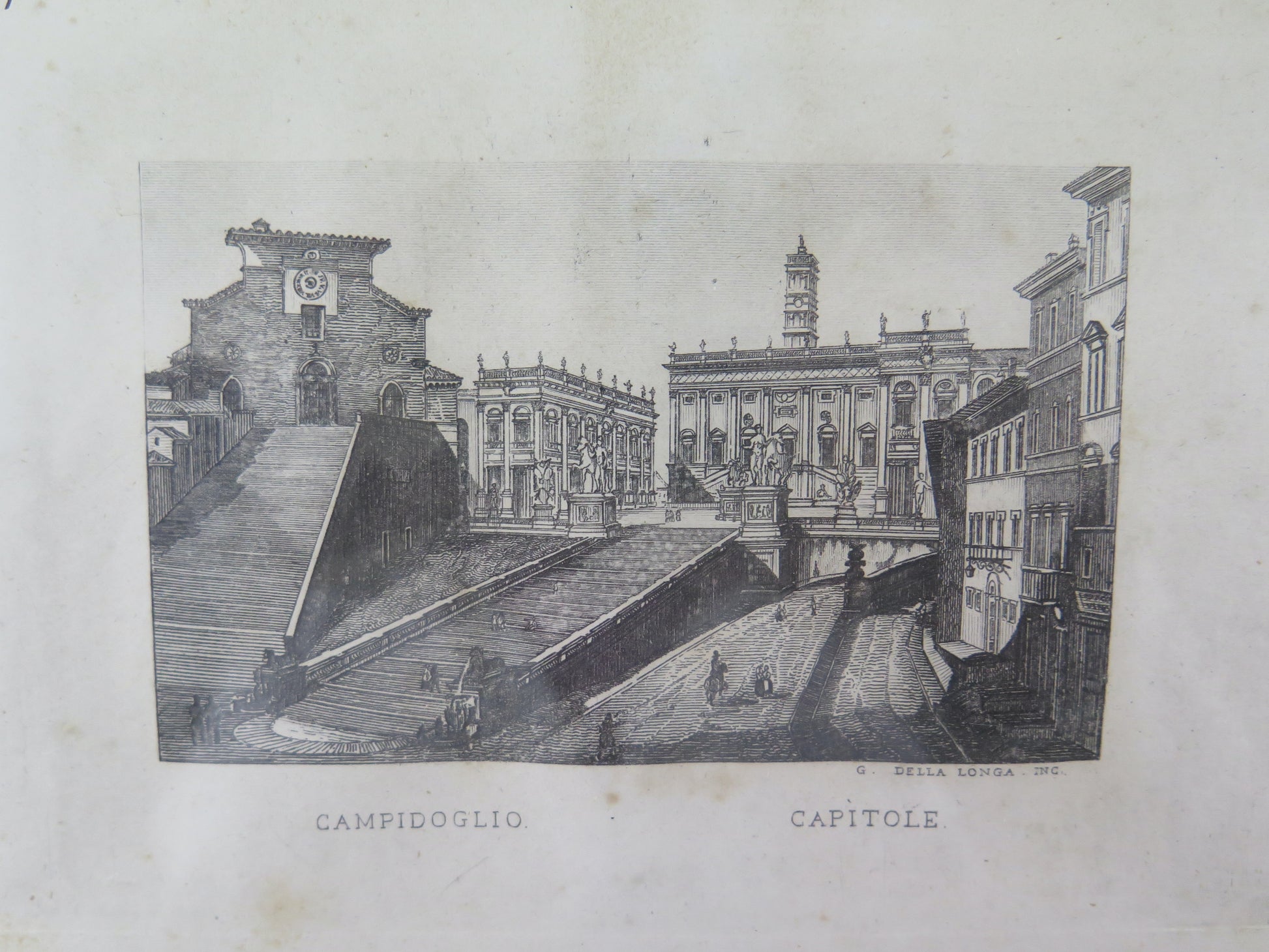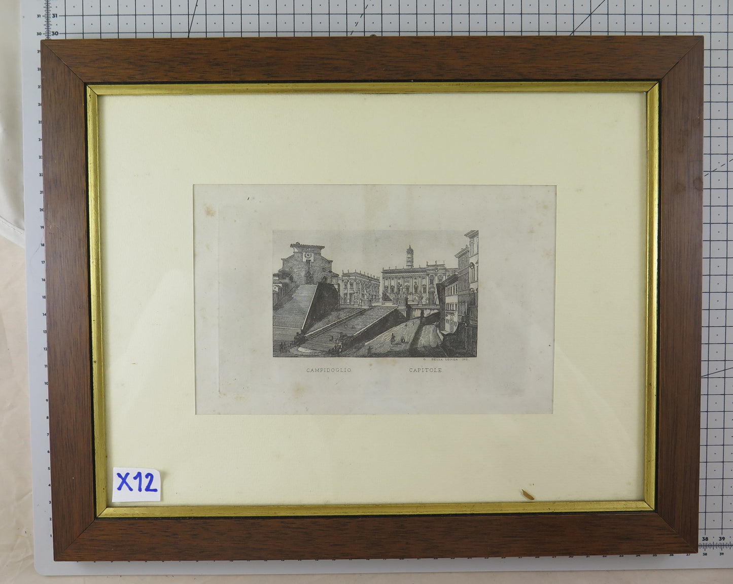 Vecchia cornice di legno dal disegno semplice ed elegante con stampa in omaggio che riporta una veduta di Roma.