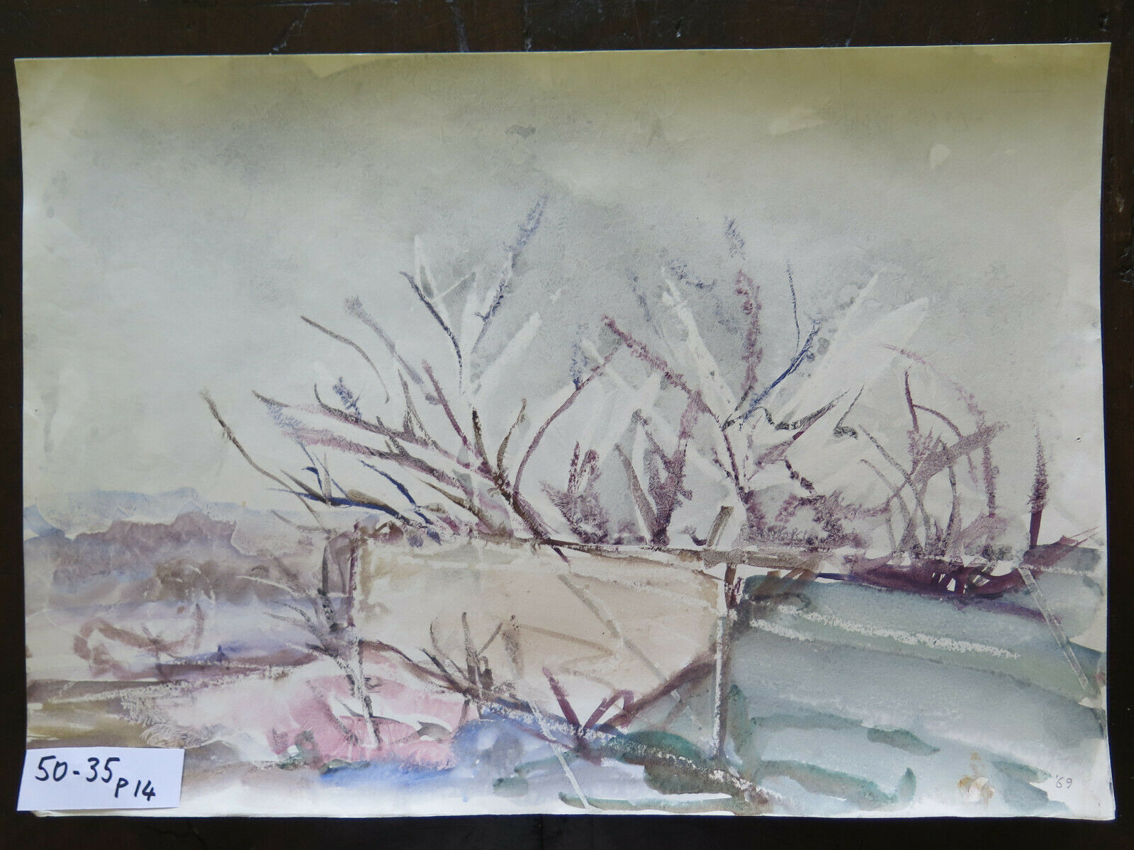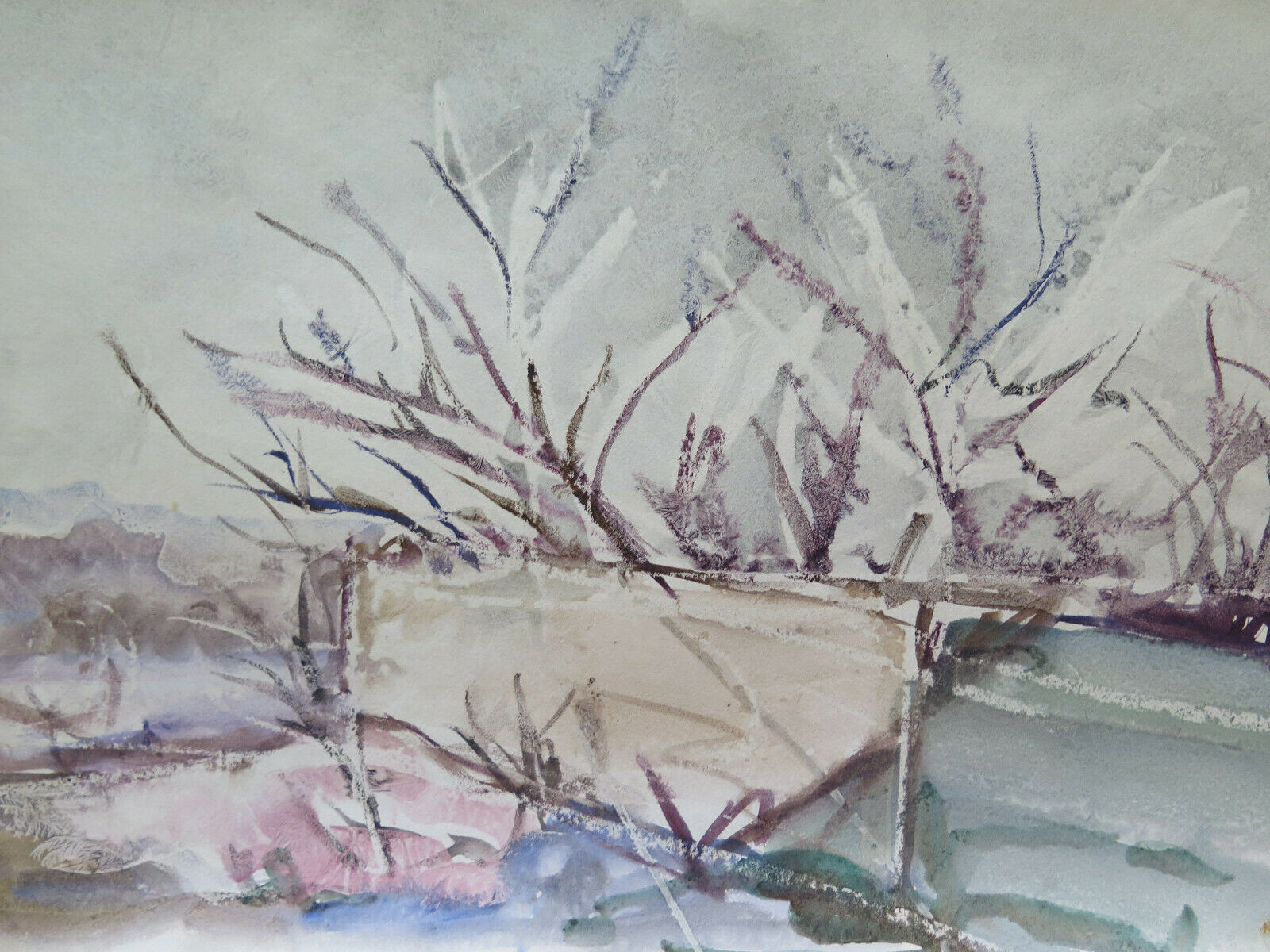 50x35 cm QUADRO DIPINTO AD ACQUERELLO VINTAGE PAESAGGIO INNEVATO INVERNO P14