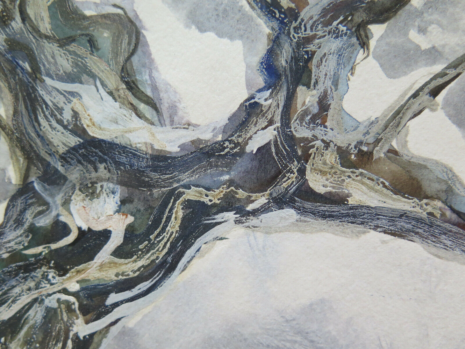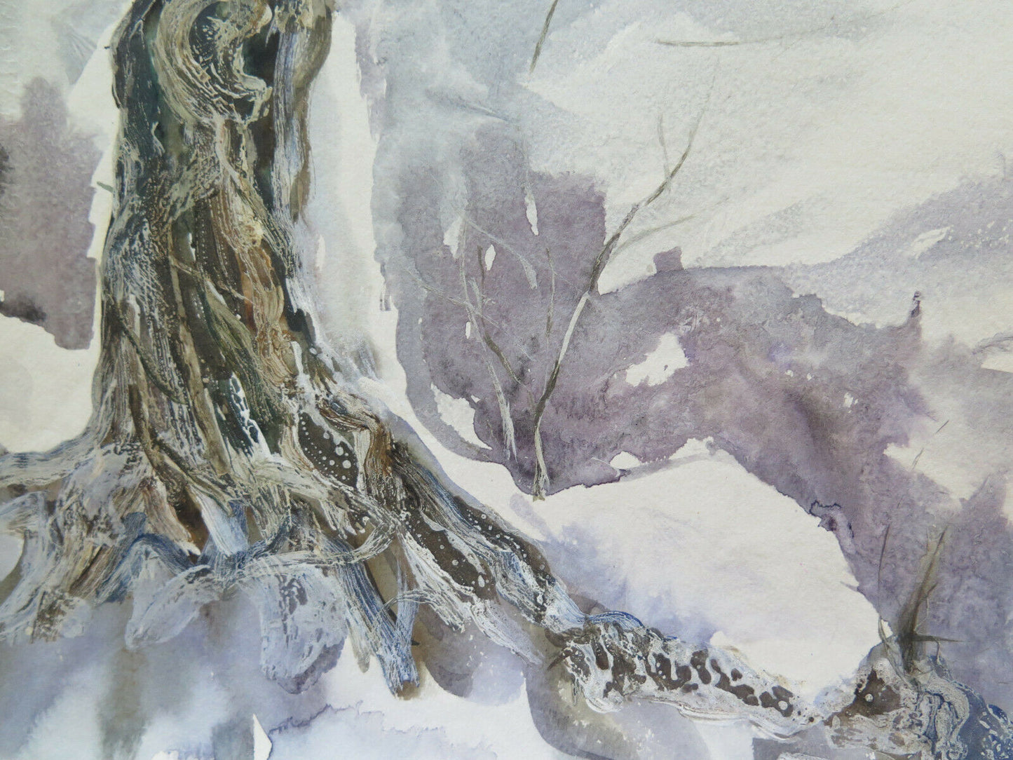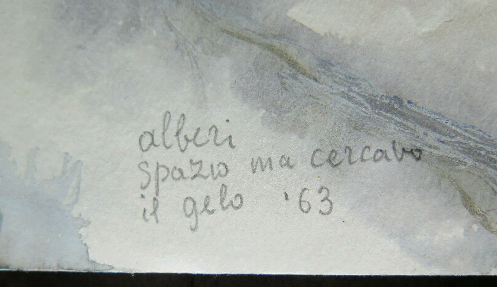 Supporto e tecnica: acquerello su cartoncino. Realizzato con la "tecnica del gelo" per ottenere l'effetto ghiaccio in alcuni aree della superficie pittorica, tale tecnica consisteva nel porre al freddo vero e proprio il dipinto ancora fresco per poi lavorarlo successivamente. Questo effetto è stato creato dal pittore Pancaldi e ricorre in molti suoi lavori soprattutto nella fase della maturità. Autore: Gaetano Pancaldi (Piumazzo di Castelfranco Emilia, 1922-2014).