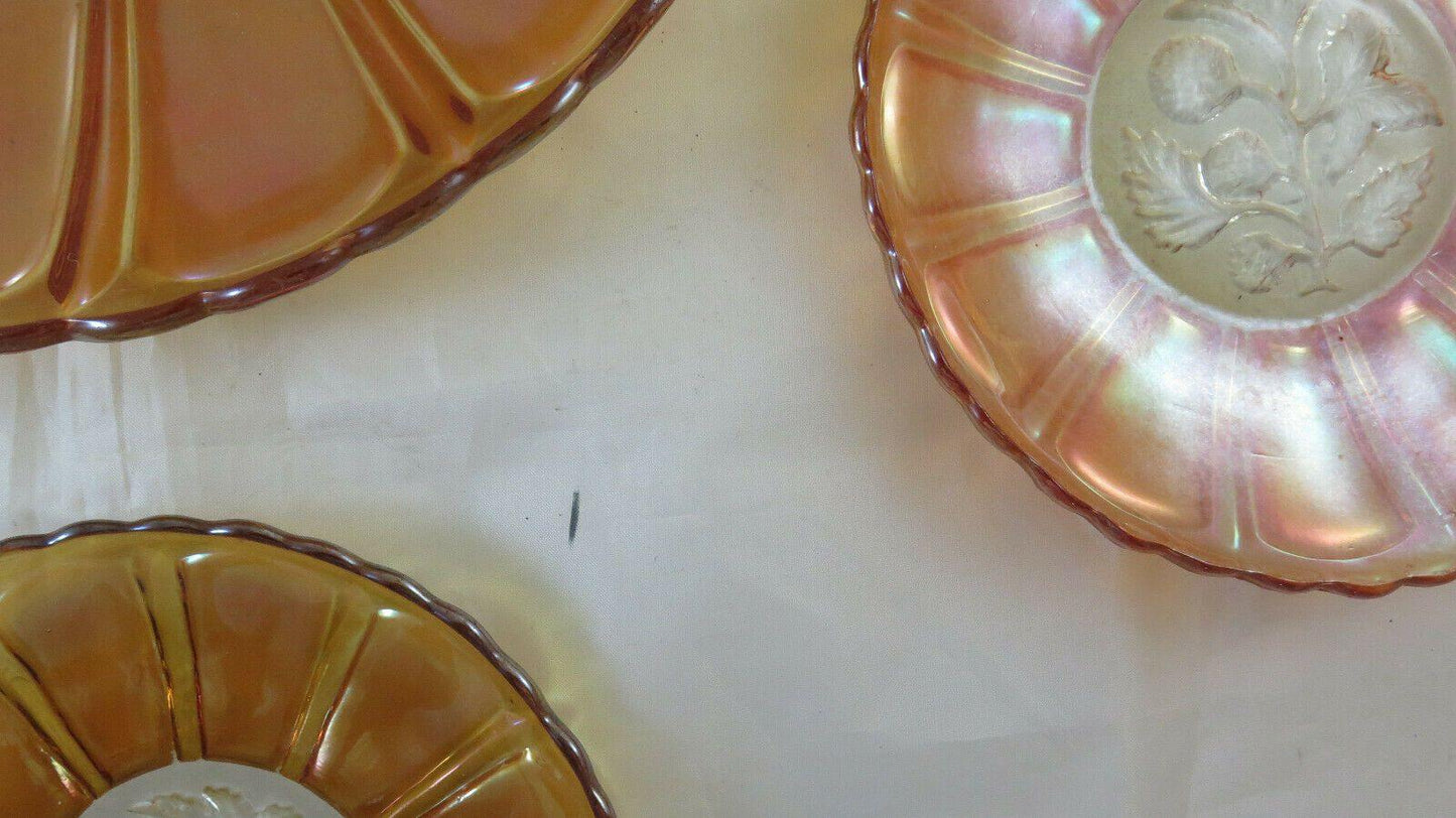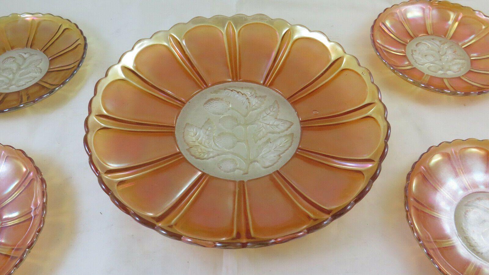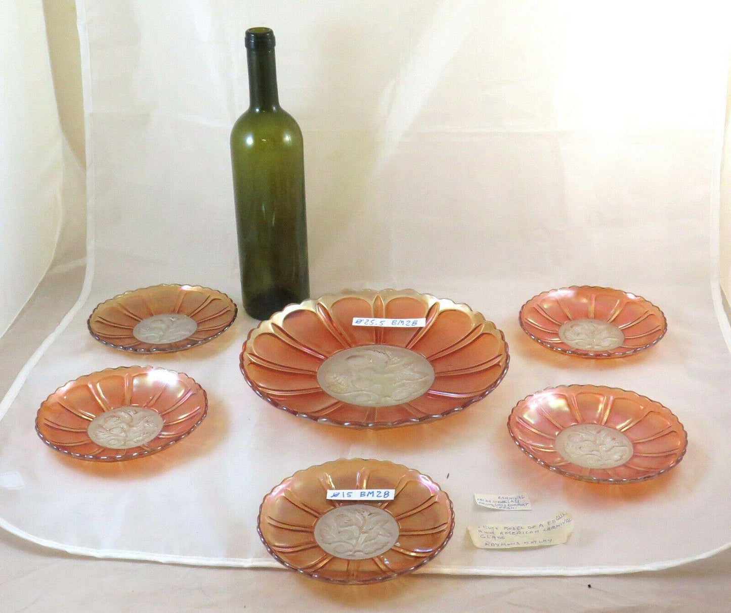 Sei piatti in vetro art nouveau decorati con petali iridescenti sui bordi e fiori nella parte centrale.